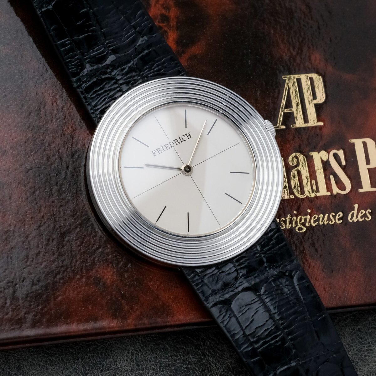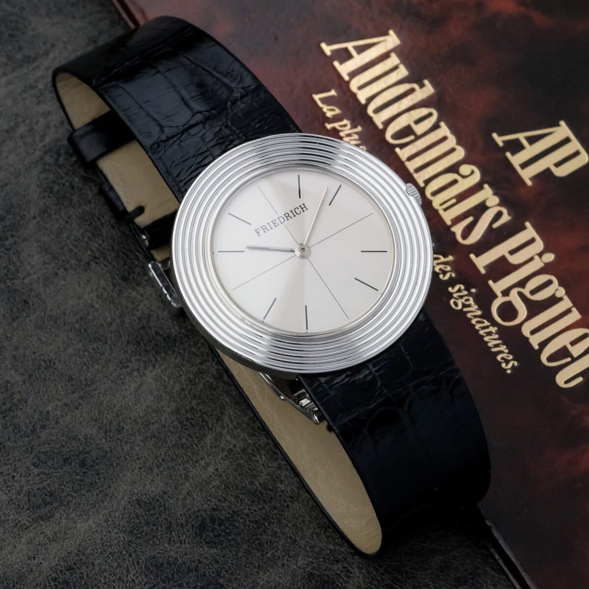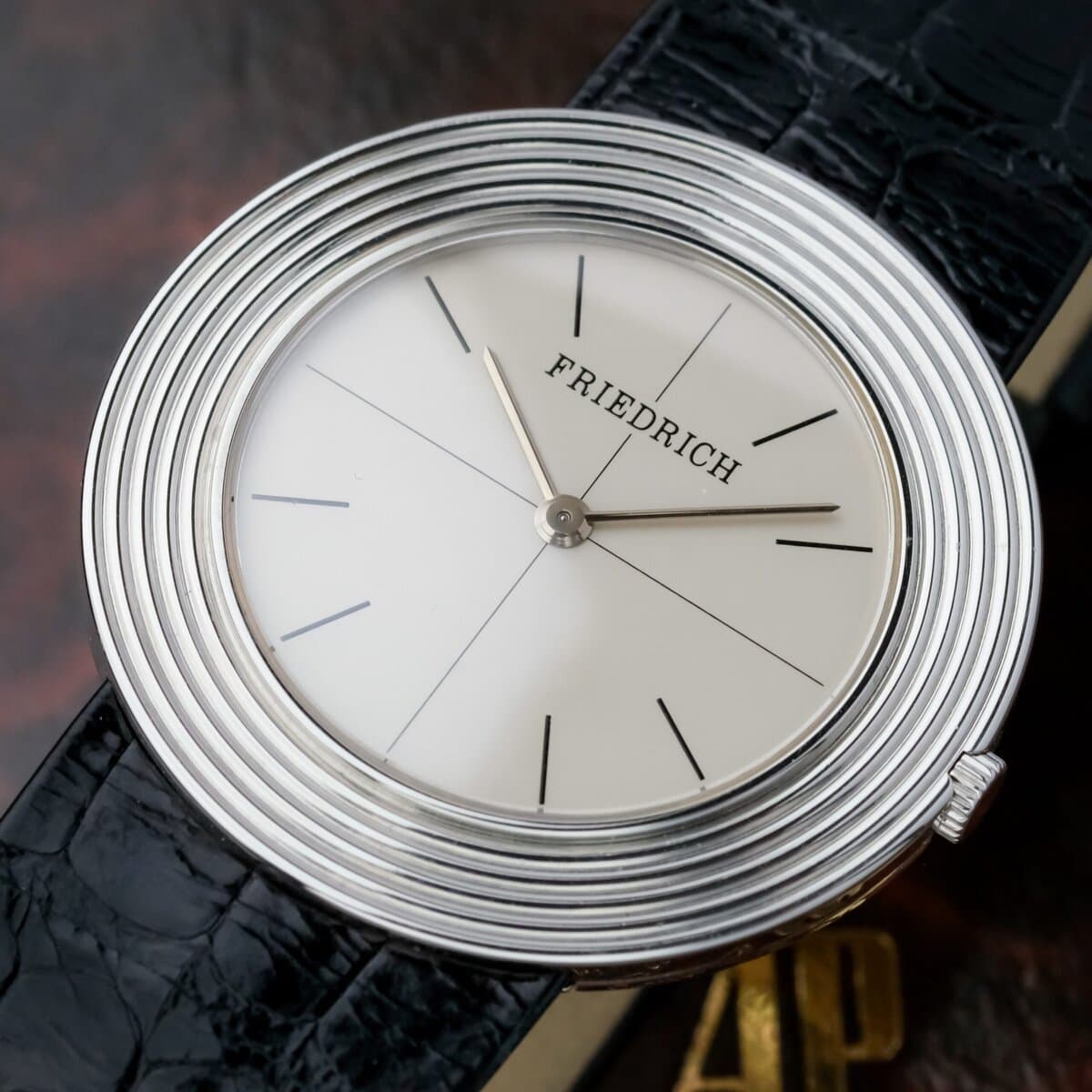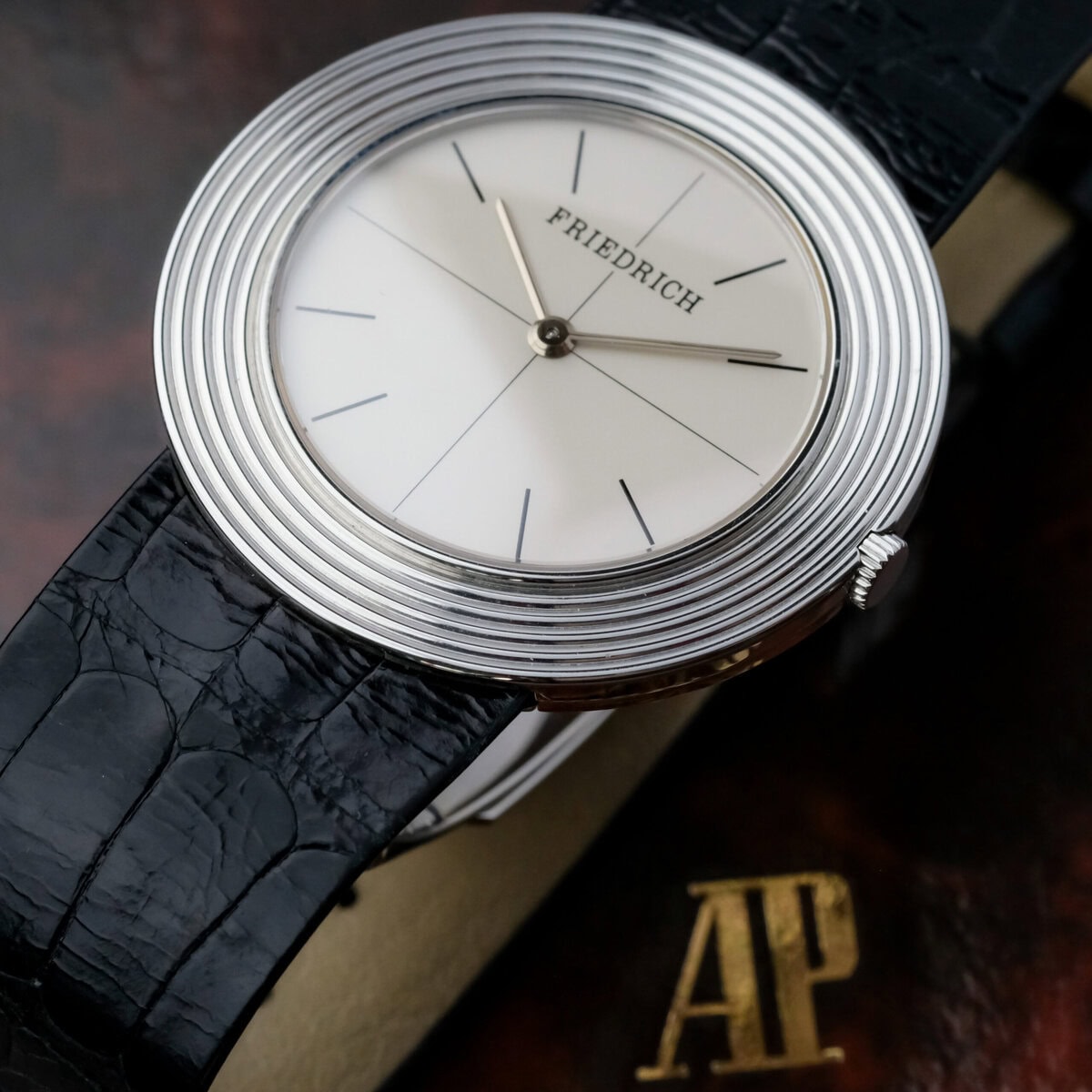This Audemars Piguet Disco Volante reference 5093 is an exceptionally rare and elegant creation, produced in a very limited series for the renowned jeweler Friedrich in Frankfurt am Main. Crafted from 950 platinum, the case measures 35 millimeters in diameter and just 4 millimeters in thickness, making it one of the thinnest watches of its kind and a true testament to Audemars Piguet’s expertise in ultra thin watchmaking. The watch is powered by the legendary hand wound caliber 2003, a movement celebrated for its remarkable slimness and fine finishing. Protected by a sapphire crystal, the minimalist dial captures the timeless purity of the Disco Volante design, emphasizing proportion and restraint rather than ornamentation. The case remains in very good overall condition, complemented by an elegant 18k white gold folding clasp. Extremely limited in production and historically significant, this Disco Volante in platinum stands as a masterpiece of understated sophistication and mechanical refinement from one of the most respected names in haute horlogerie.