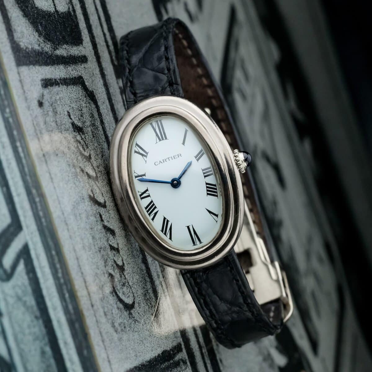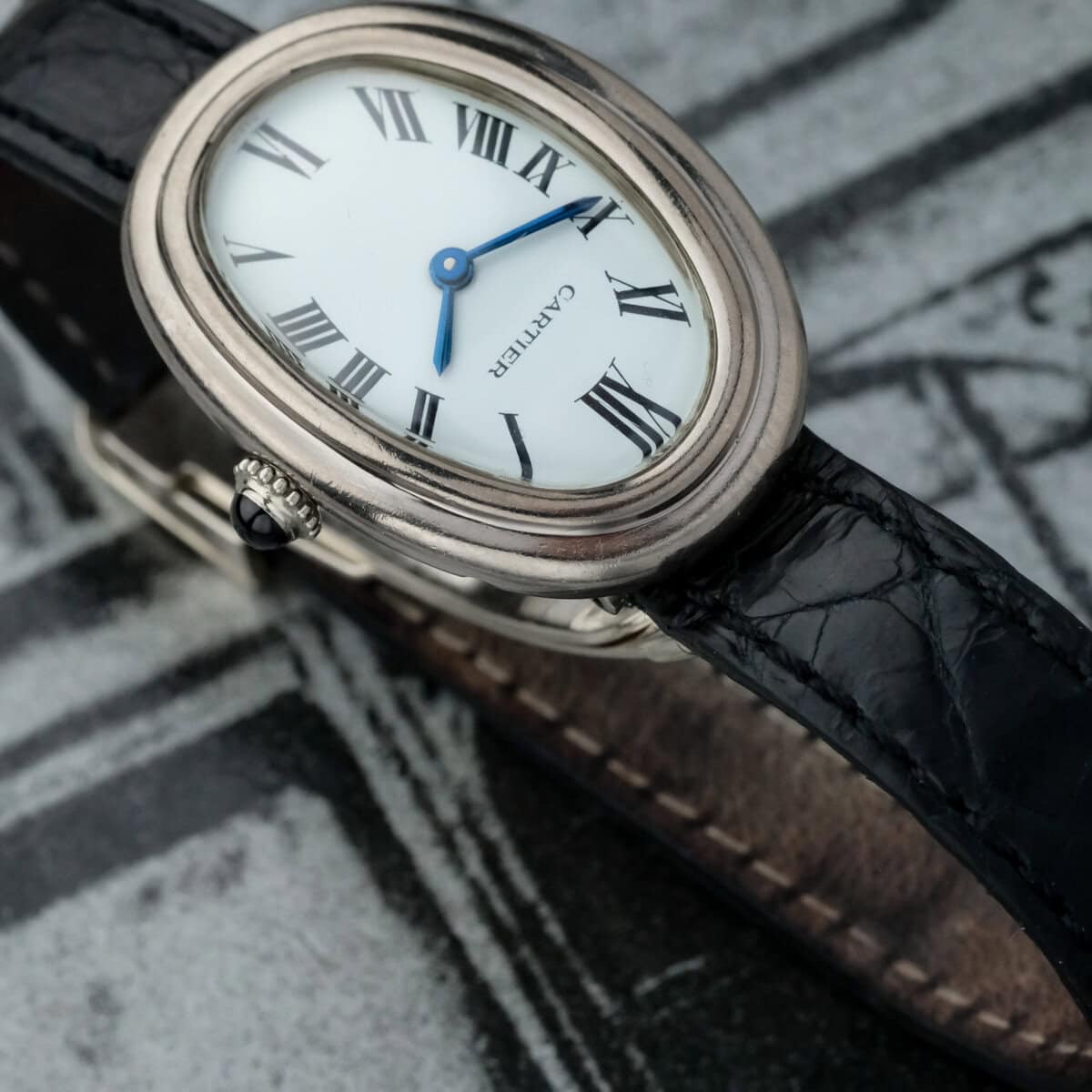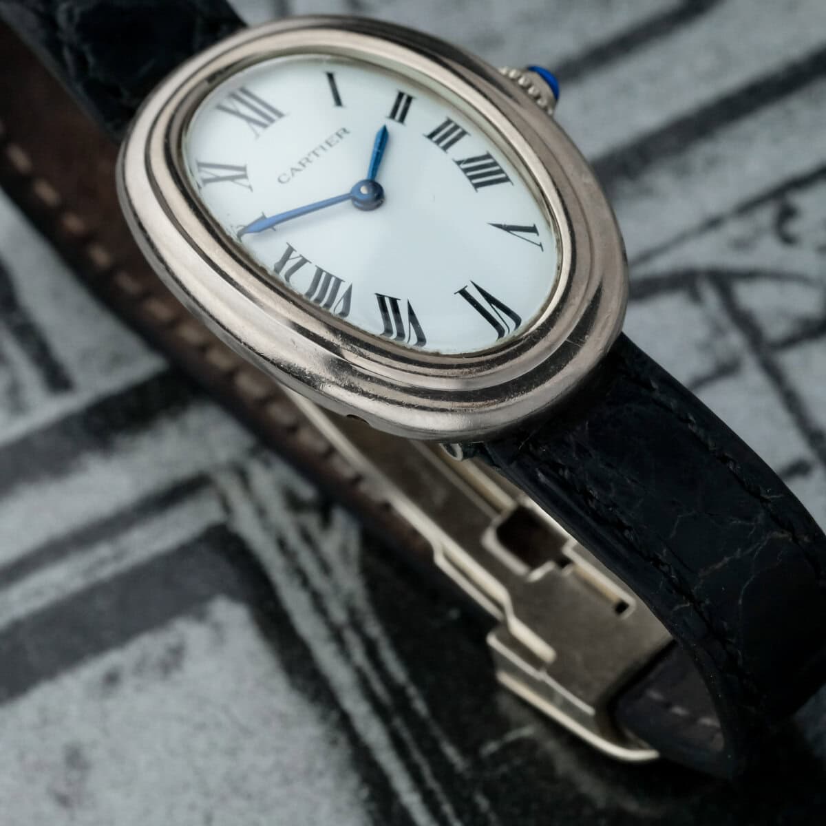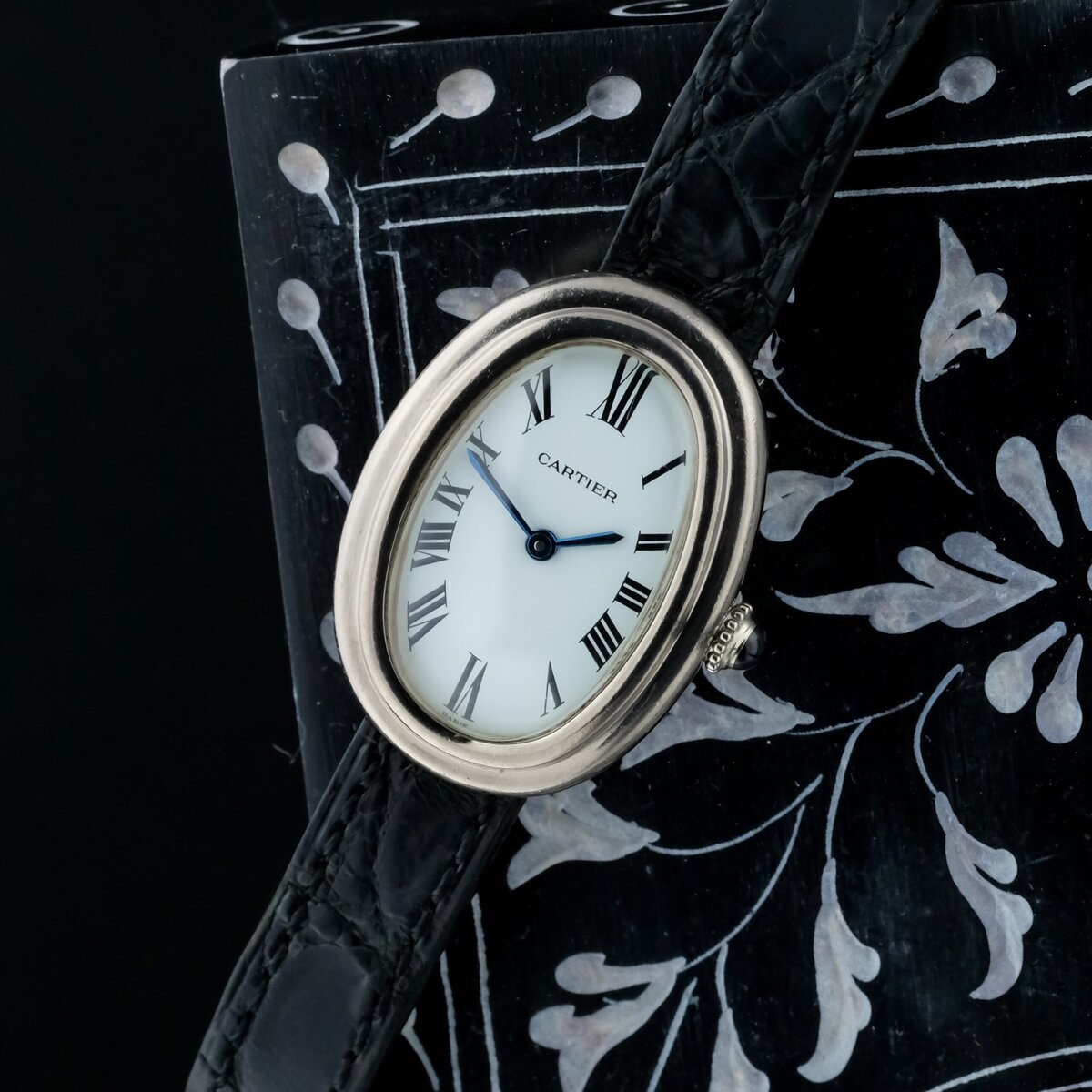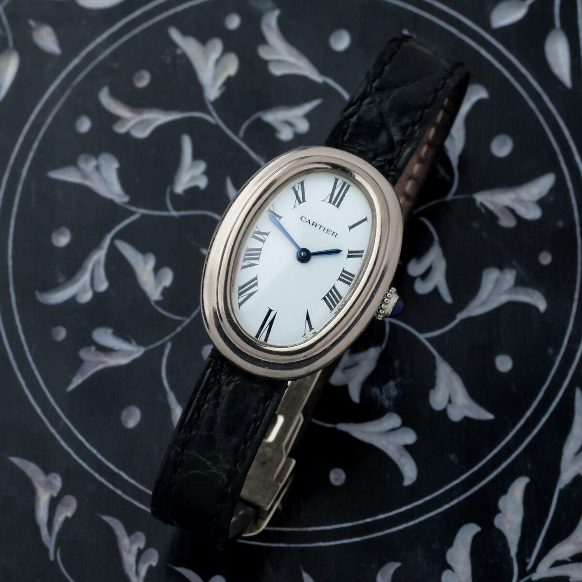 This example represents a very scarce execution of the Baignoire in white gold with Vendôme lugs, combining refined proportions, historical significance, and Cartier’s unmistakable Parisian elegance.