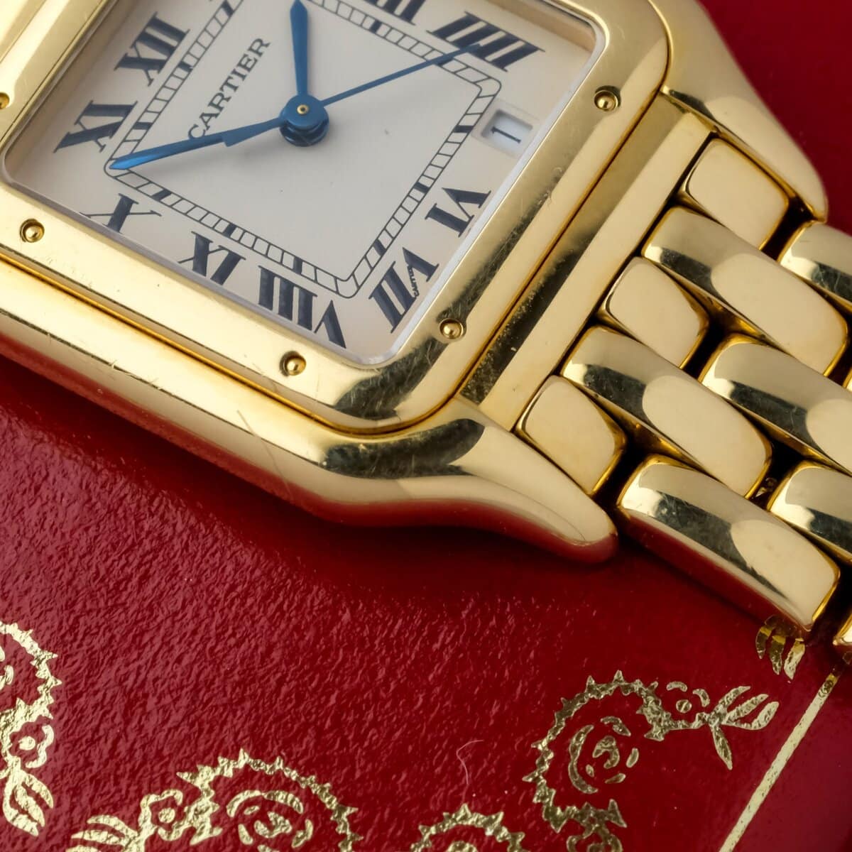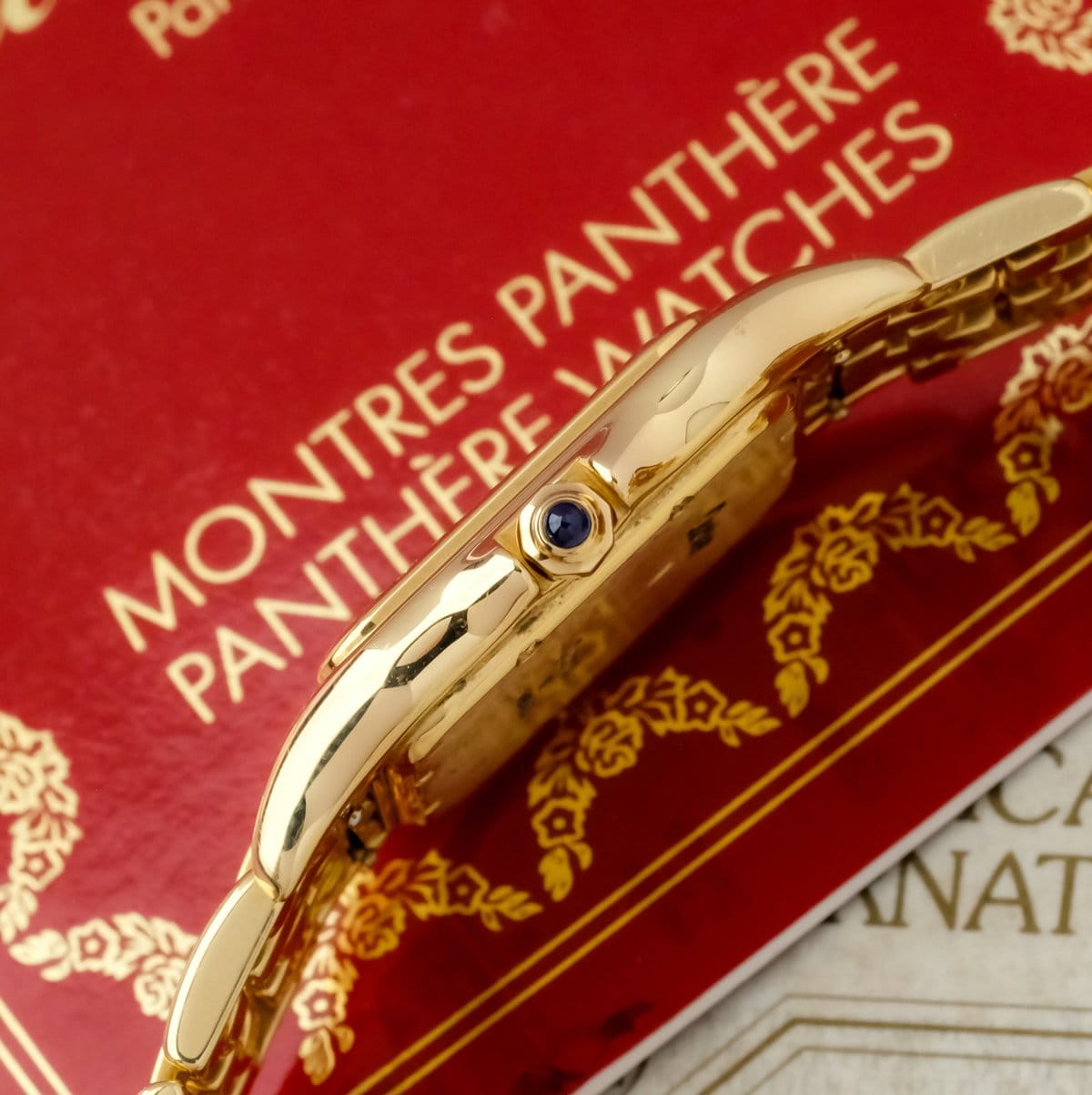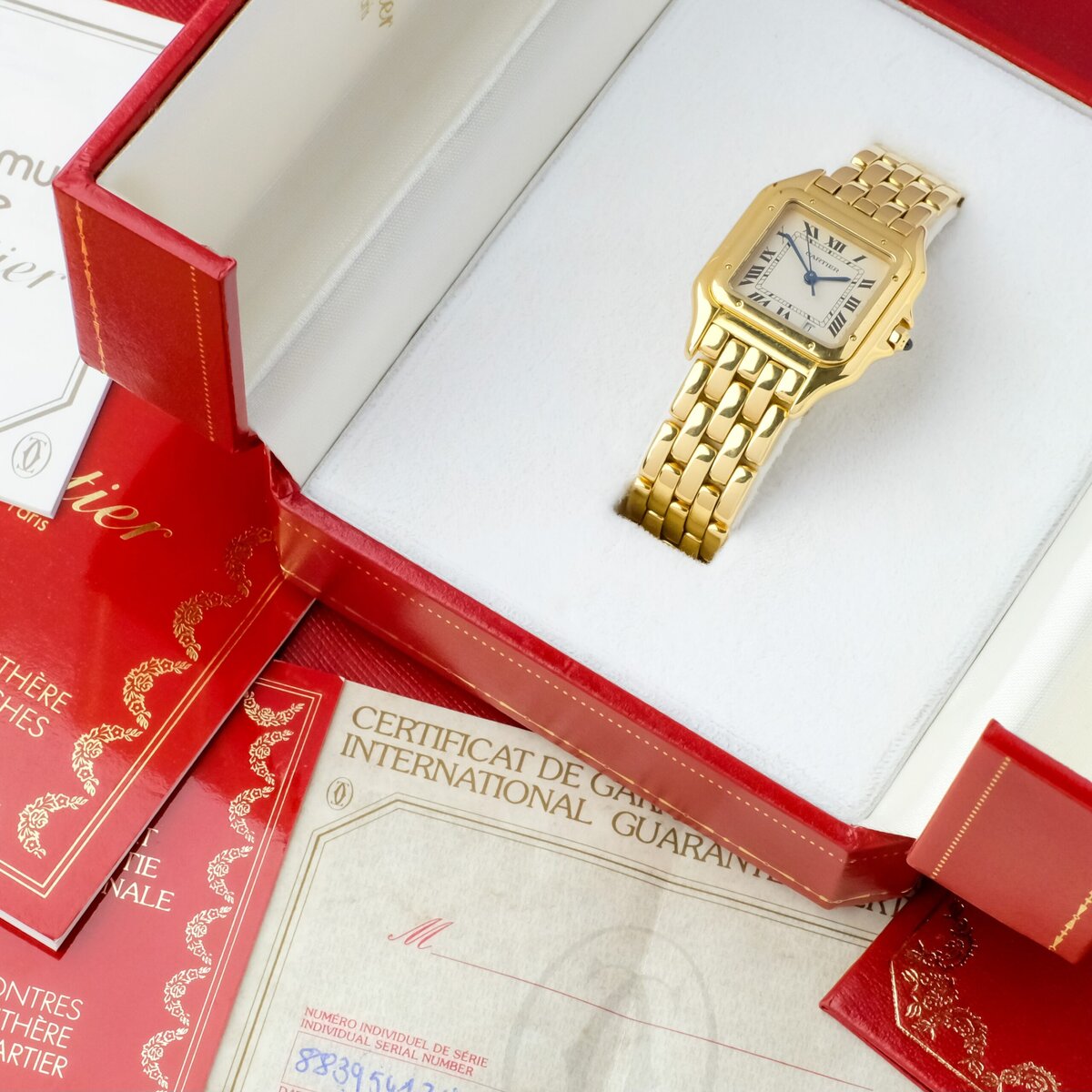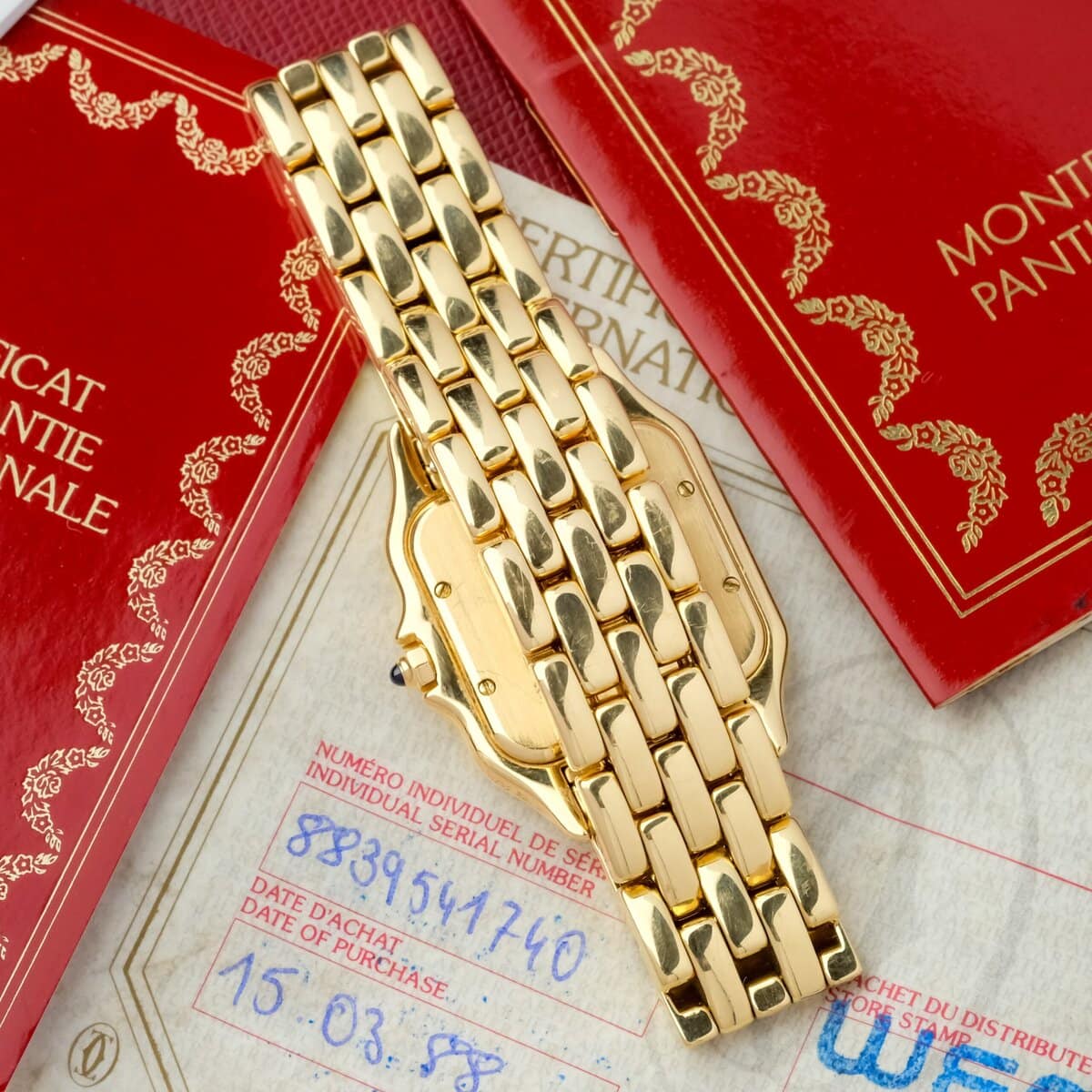 Cartier Panthère reference 8839 in 18k yellow gold, measuring 27 millimeters and powered by a quartz movement. This example dates from 1988 and features the classic Panthère case paired with the iconic integrated yellow gold bracelet.