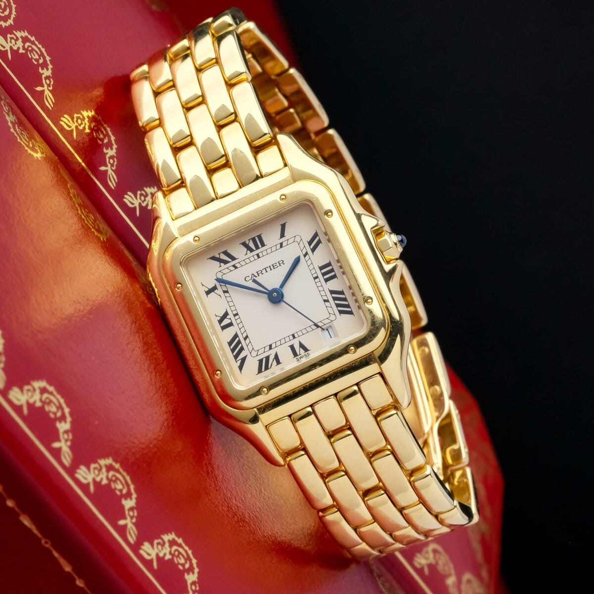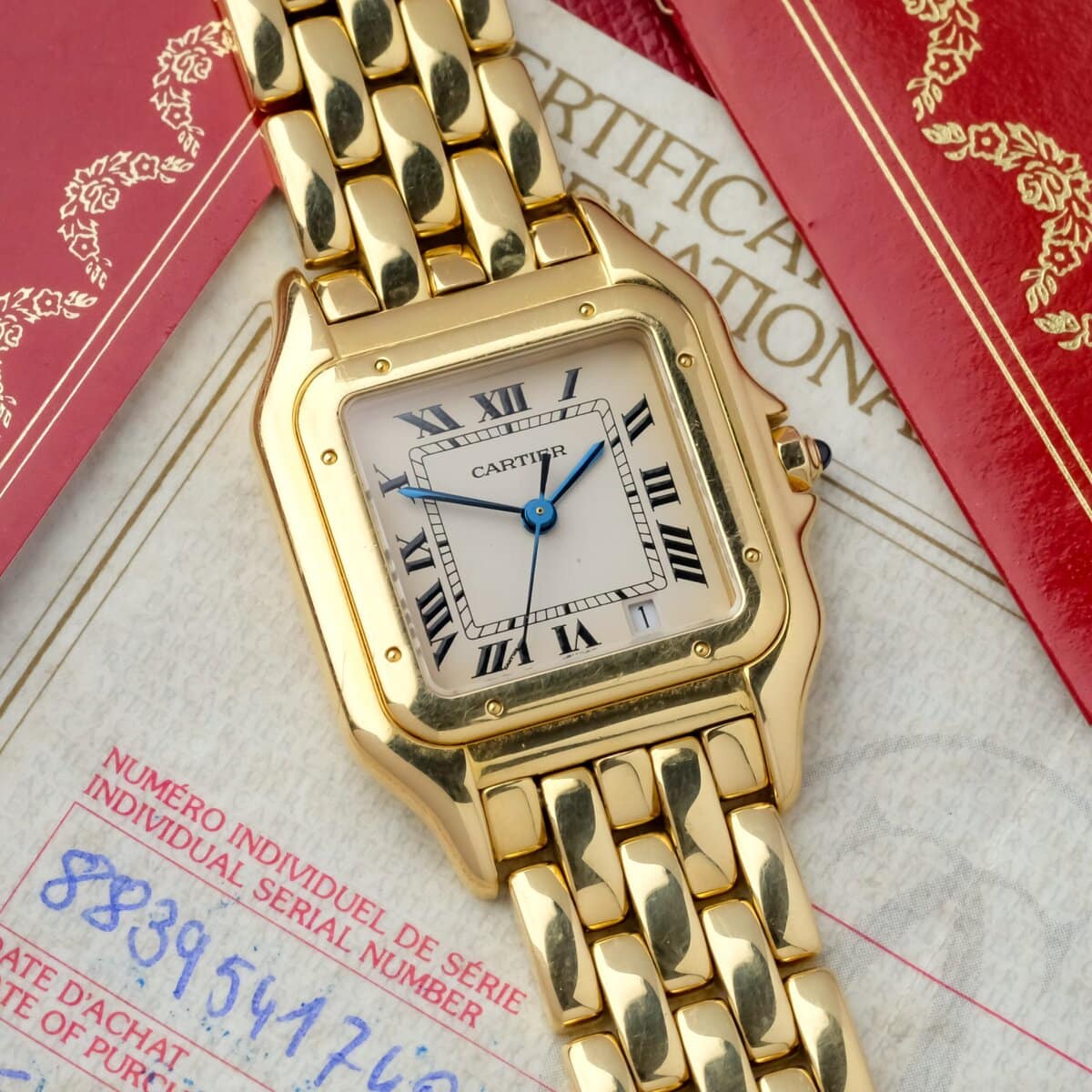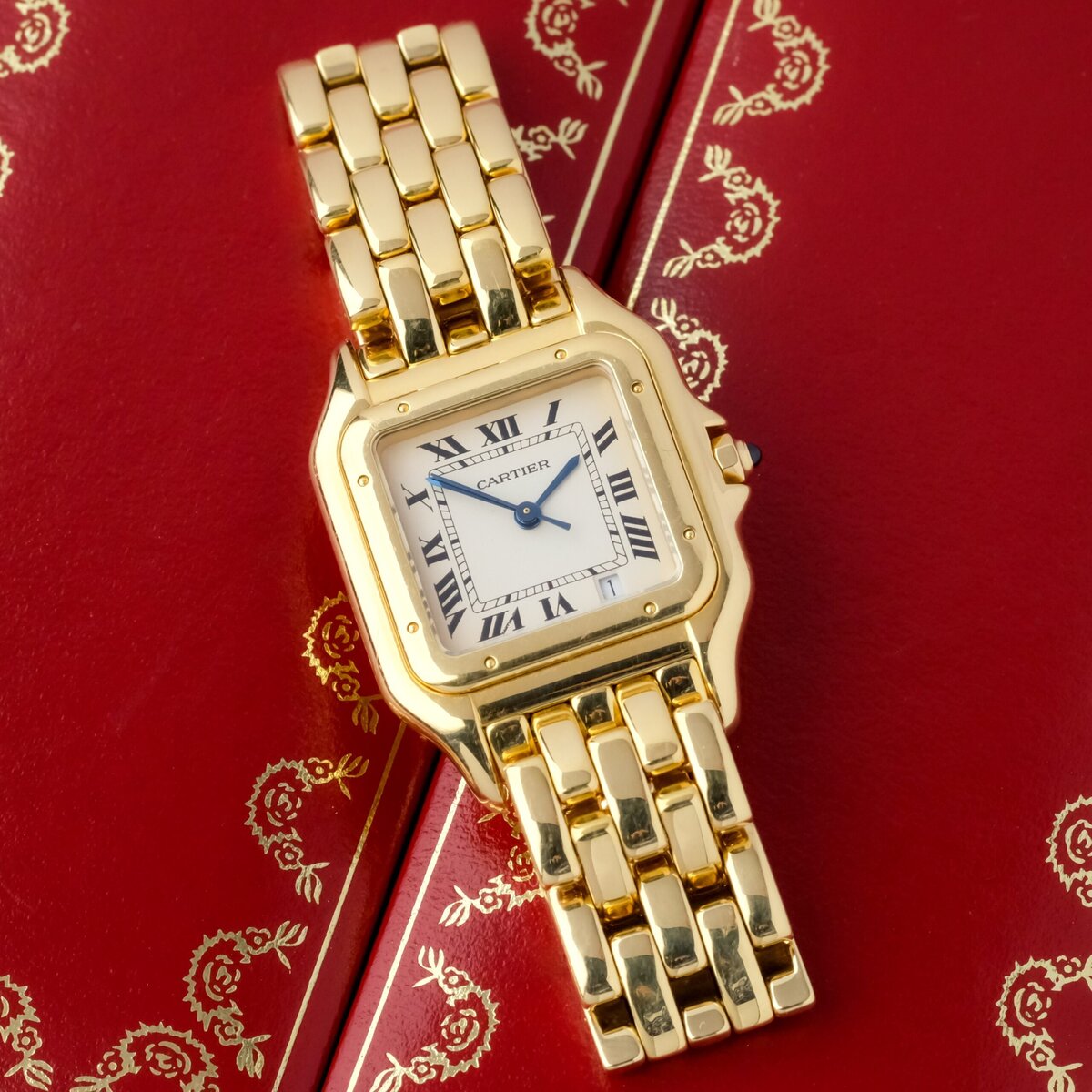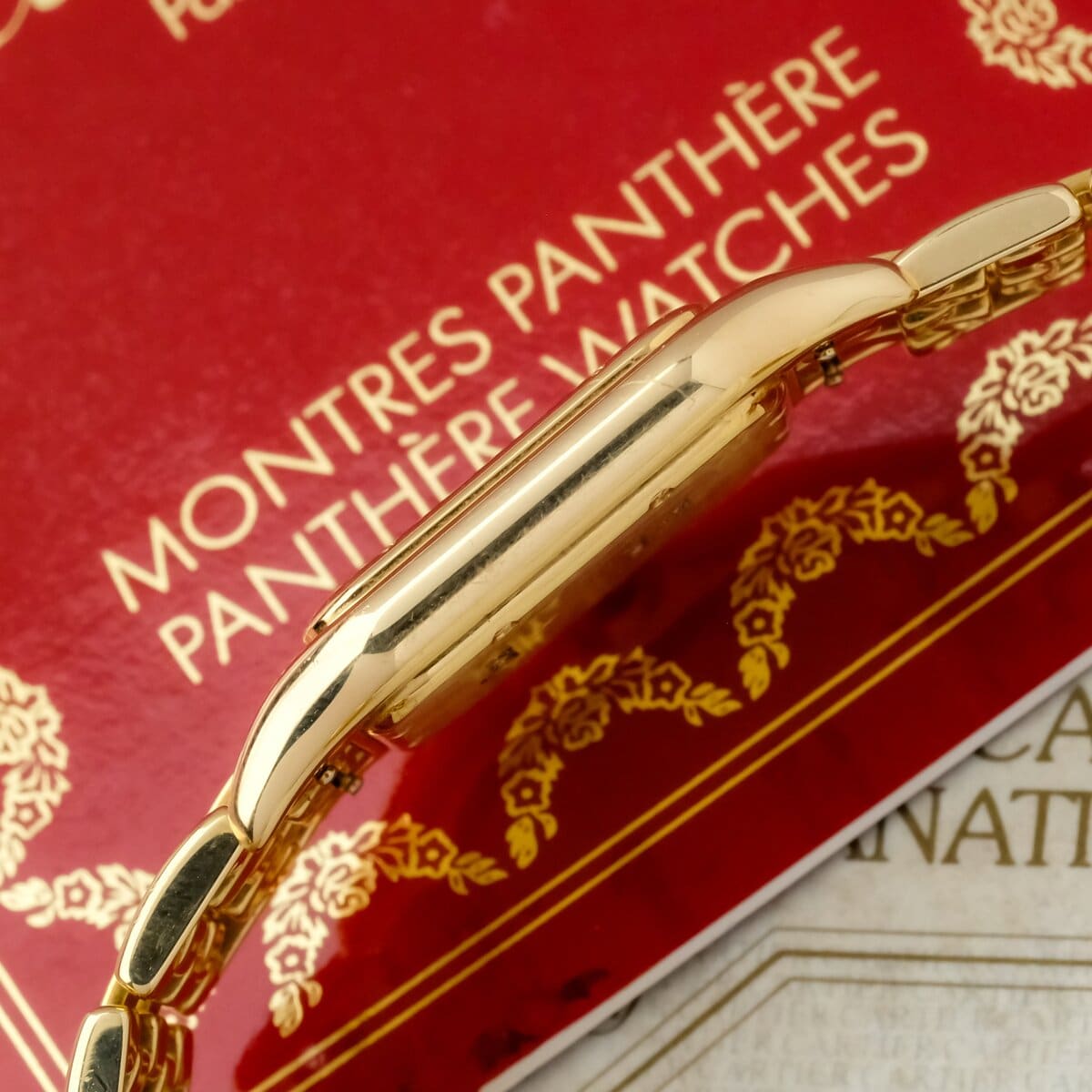 Cartier Panthère reference 8839 in 18k yellow gold, measuring 27 millimeters and powered by a quartz movement. This example dates from 1988 and features the classic Panthère case paired with the iconic integrated yellow gold bracelet.