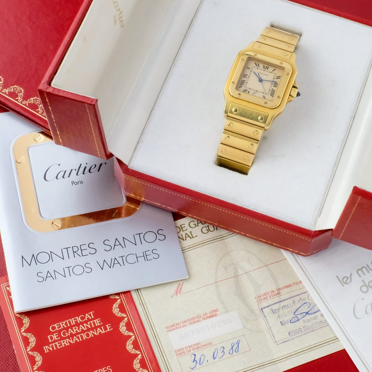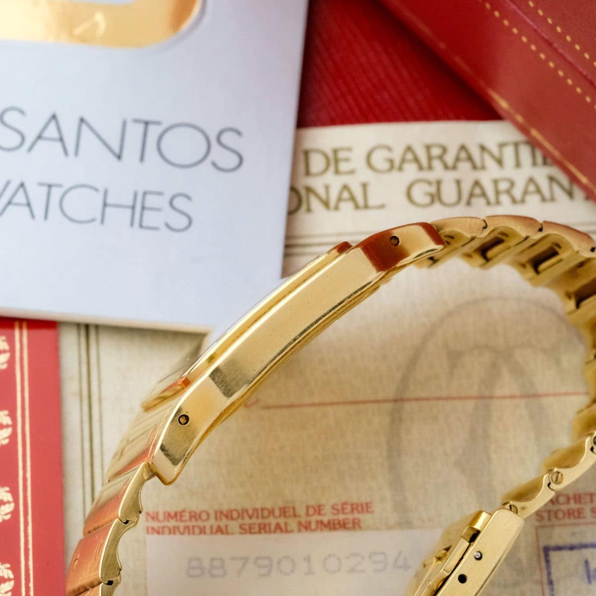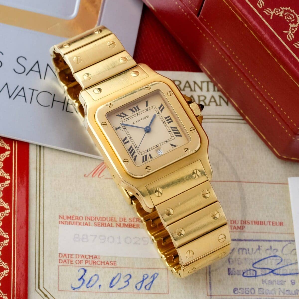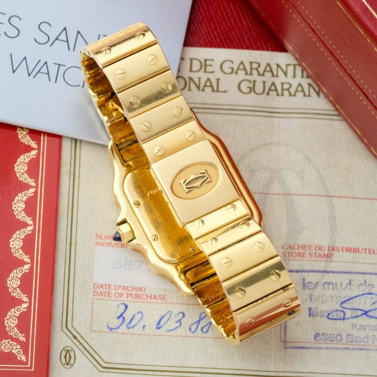 Offered as a full set, including its original box and papers, this 887901 is a rare all-gold Santos in excellent condition. It is an ideal piece for collectors seeking both Cartier heritage and timeless design in a pure, luxurious execution.