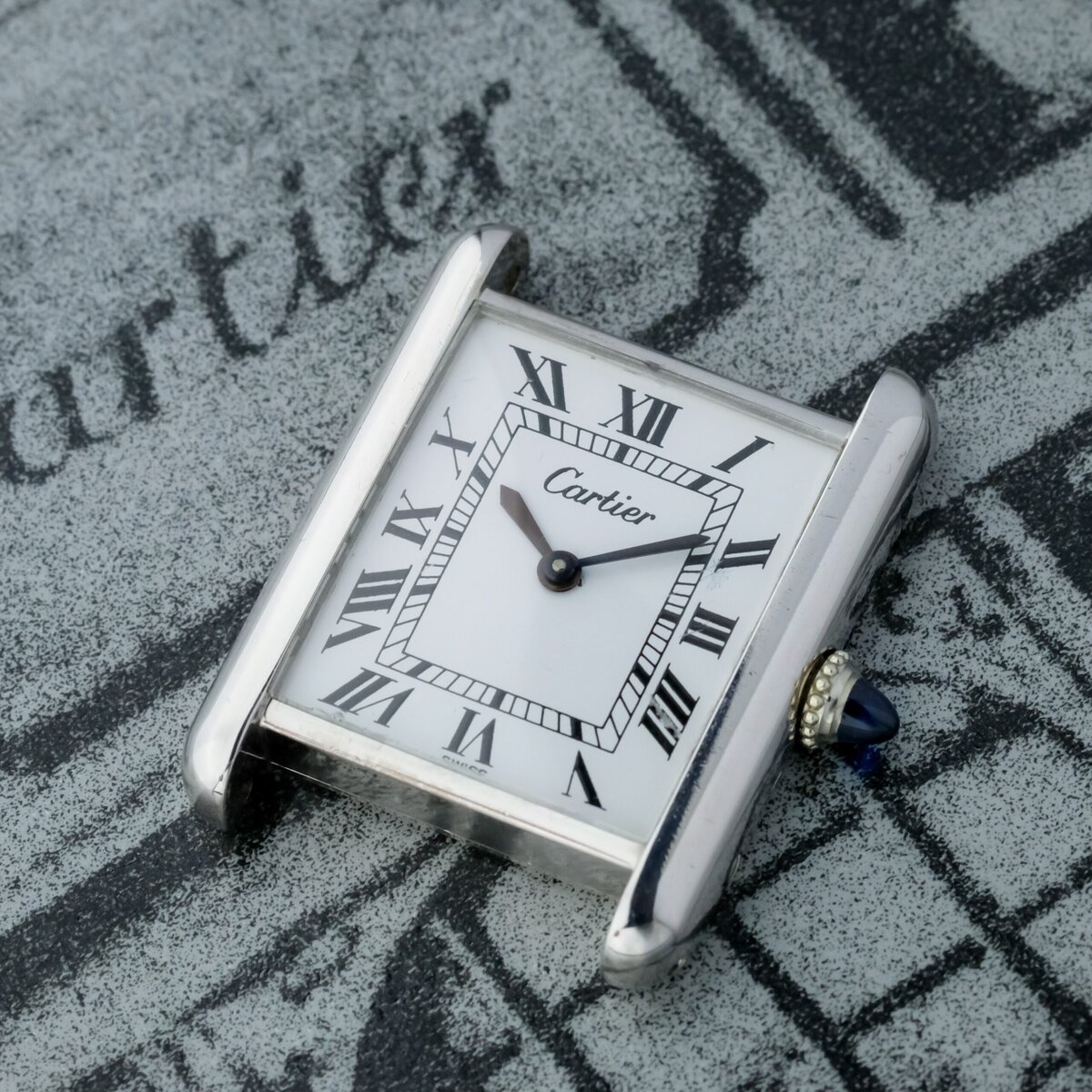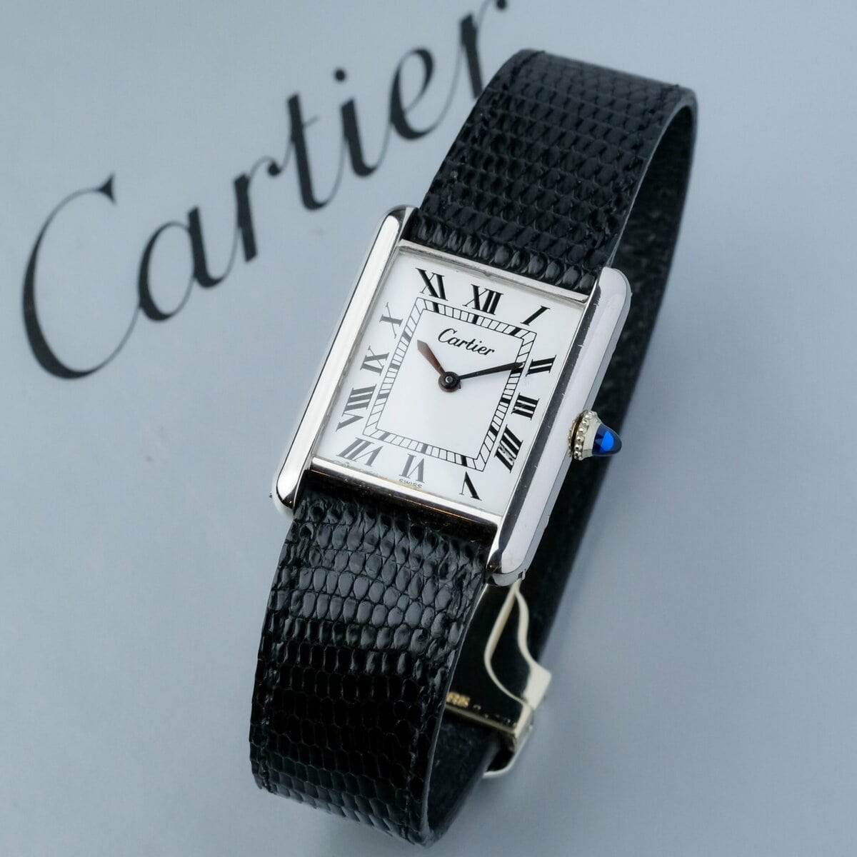 Powered by a manual winding movement, the watch captures the charm of classic watchmaking, paired with the iconic Cartier design language: clean rectangular form, cabochon crown, and minimalist detailing. It comes fitted with a matching 18k white gold Cartier folding clasp, completing the period correct set.