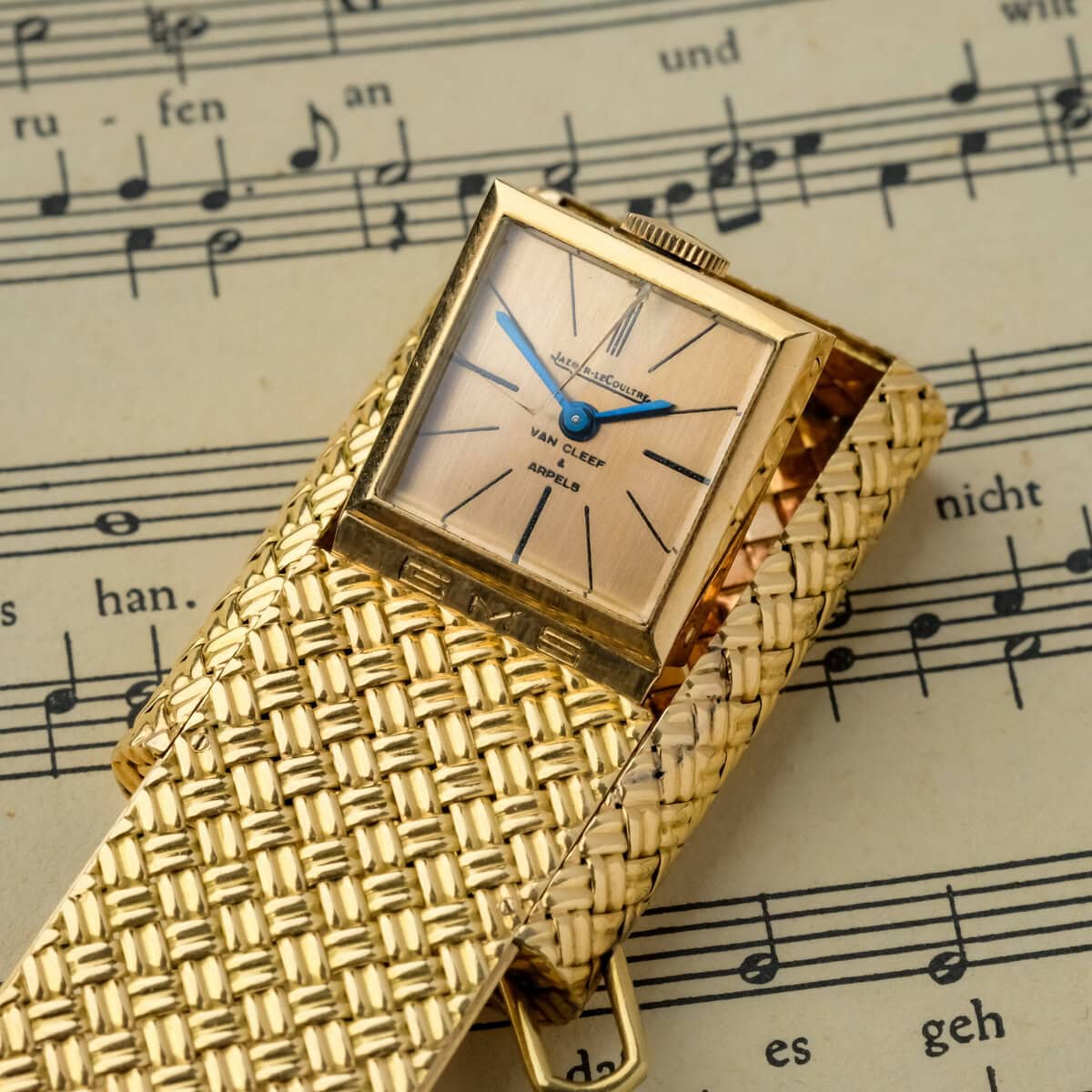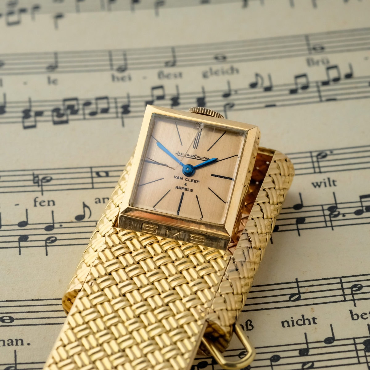 The champagne toned dial is signed by both Jaeger LeCoultre and Van Cleef & Arpels, underscoring the prestigious collaboration between two of the most respected names in fine watchmaking and high jewelry. The blued hands and minimalist markers reflect a refined aesthetic that balances functionality with pure design elegance.