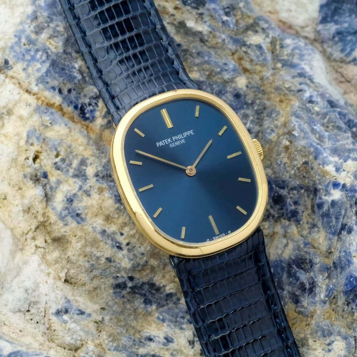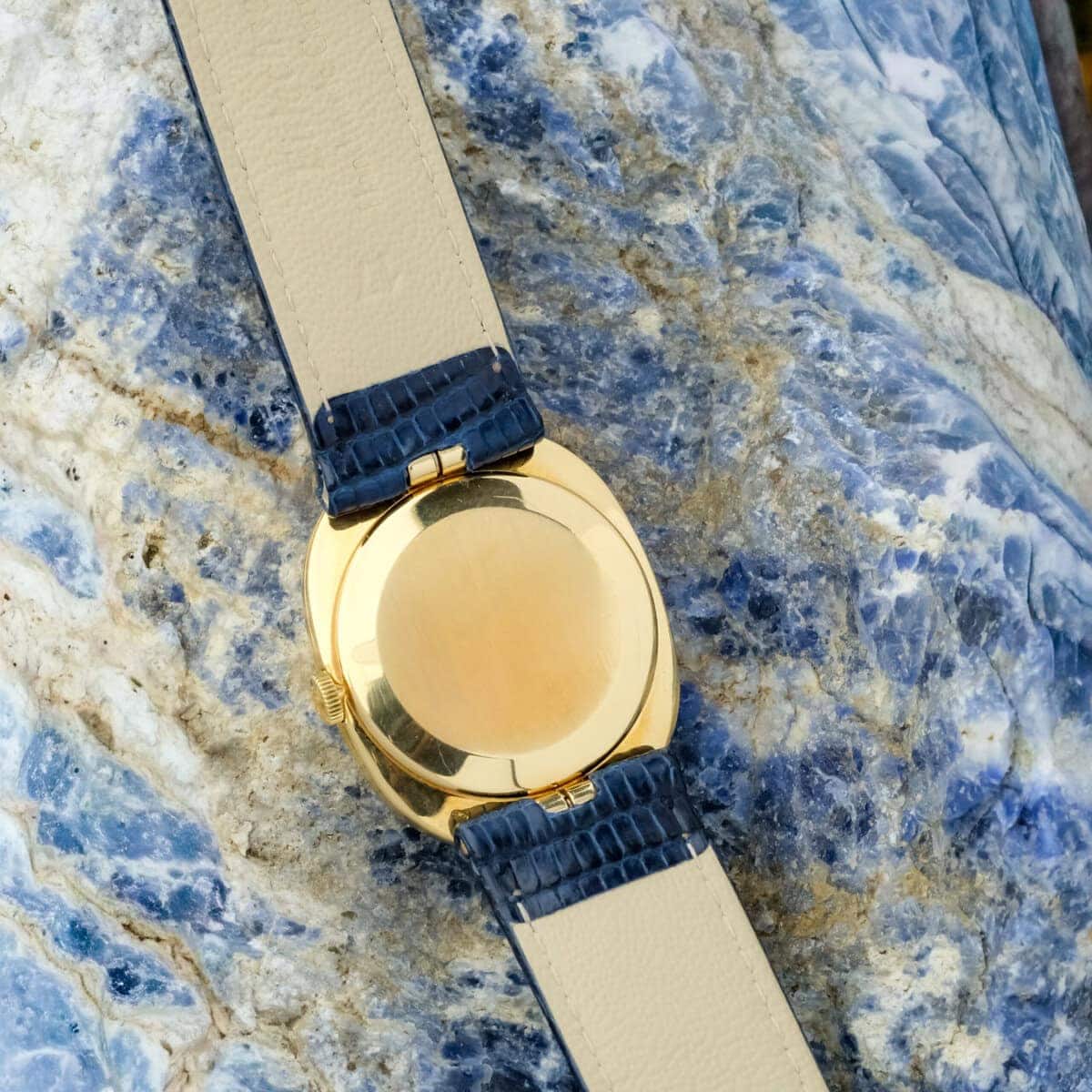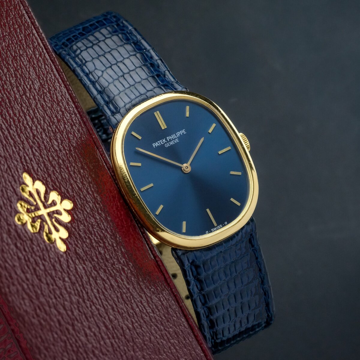 This Patek Philippe Ellipse d’Or reference 3648 is a refined and elegant example of the maison’s iconic oval dress watch, defined by perfect proportions and timeless simplicity. The 27 by 32 millimeter case offers a sleek profile that sits beautifully on the wrist, remaining true to the minimalist philosophy behind the Ellipse design. The deep blue sunburst dial is signed with sigma marks flanking the “Swiss” text at 6 o’clock, indicating the use of solid gold for the applied indexes. This detail, along with the clean dial layout and absence of a seconds hand, reflects the understated elegance that defines the Ellipse line. Powered by a manual winding movement and fitted with a non-Patek gold-plated buckle, this reference offers a more accessible entry point into vintage Patek Philippe while retaining the core design elements and craftsmanship that make the Ellipse d’Or such a timeless classic. *if sold within the European Union the watch is subjective to 19% VAT
