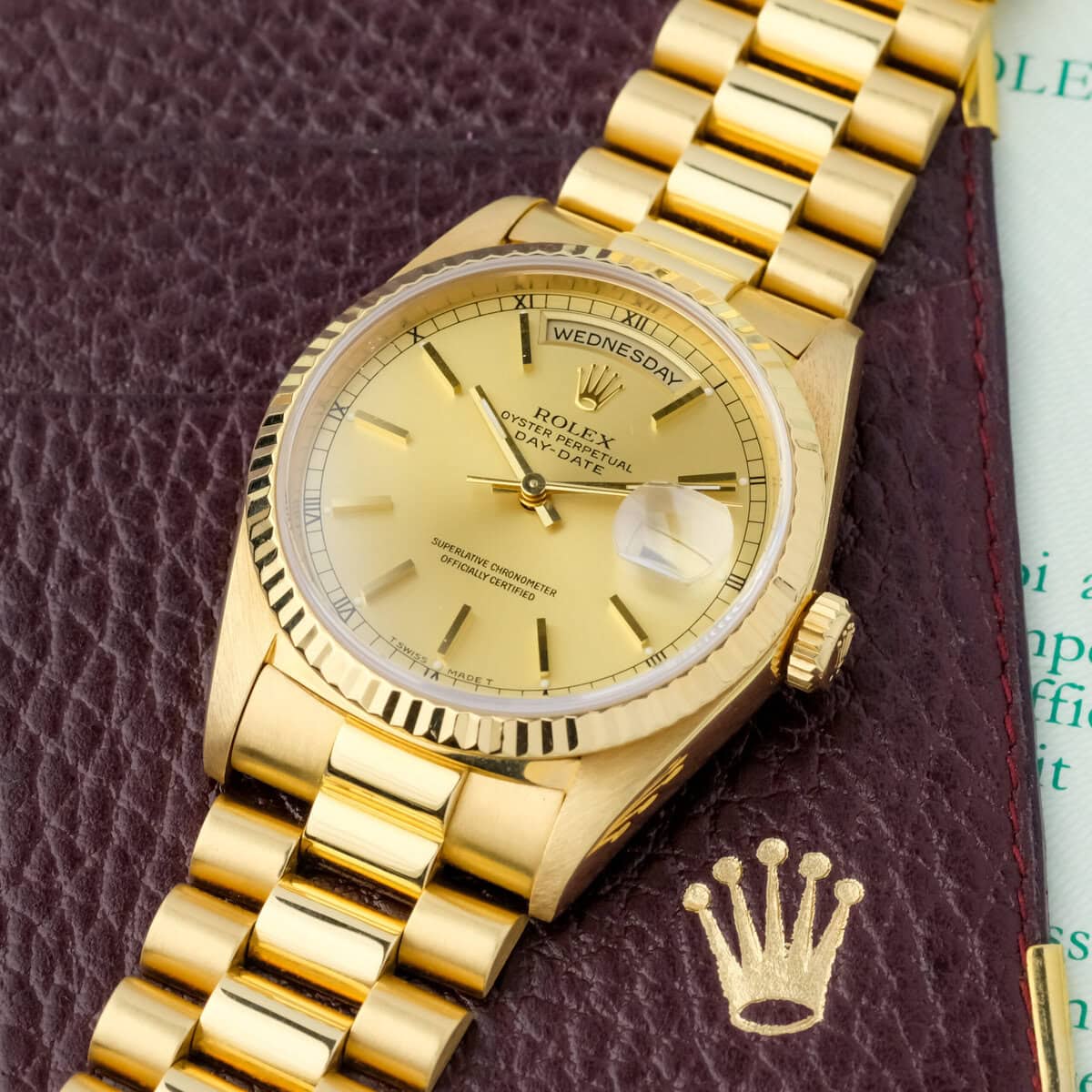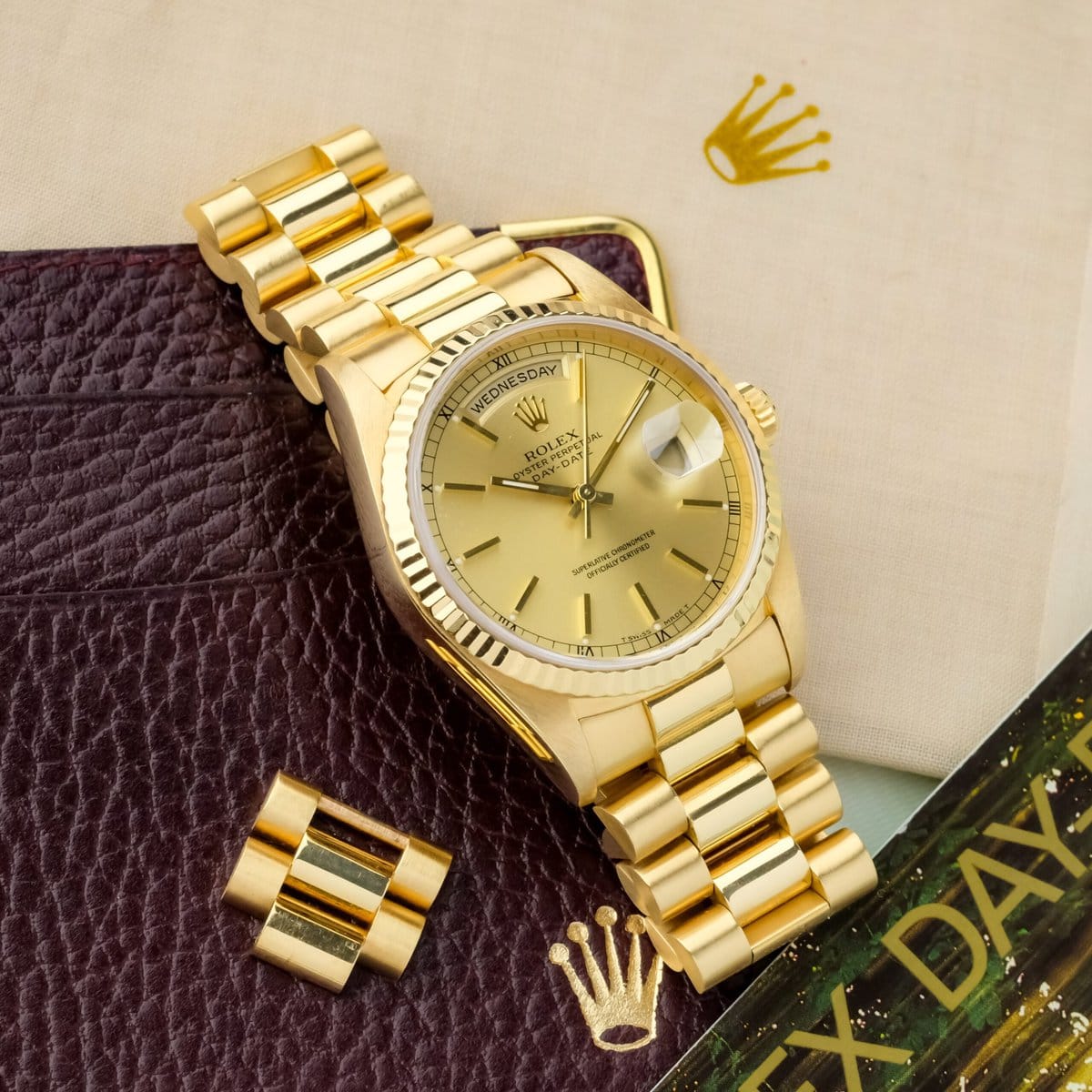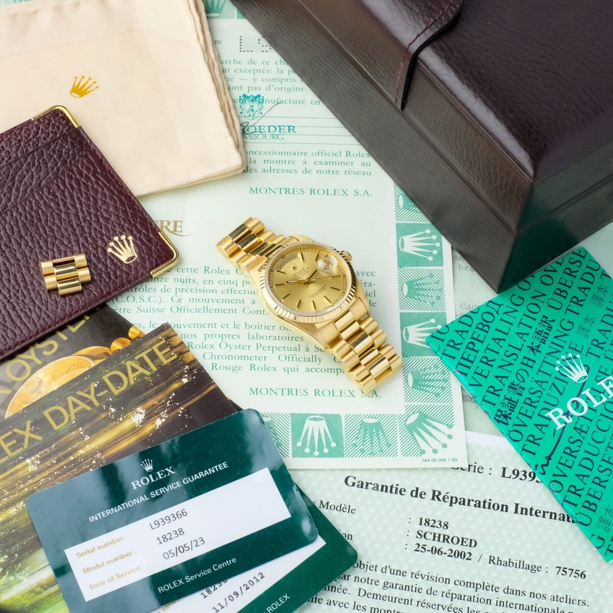 This Rolex Day Date reference 18238 is a quintessential example of one of the brand’s most iconic and prestigious timepieces. Crafted entirely in 18k yellow gold, the 36 millimeter case embodies the perfect balance of elegance and presence that has defined the Day Date since its debut. The champagne dial, complemented by applied hour markers and the signature day and date windows, exudes timeless sophistication. Powered by Rolex’s automatic caliber featuring the double quick set function, it offers both precision and everyday practicality. This example is offered as a complete full set including its original box, booklets and cardholder, and is accompanied by two official Rolex service receipts, the most recent from 2023. It remains in excellent overall condition and stands as a true symbol of refinement and success, representing the enduring legacy of one of Rolex’s most legendary designs.