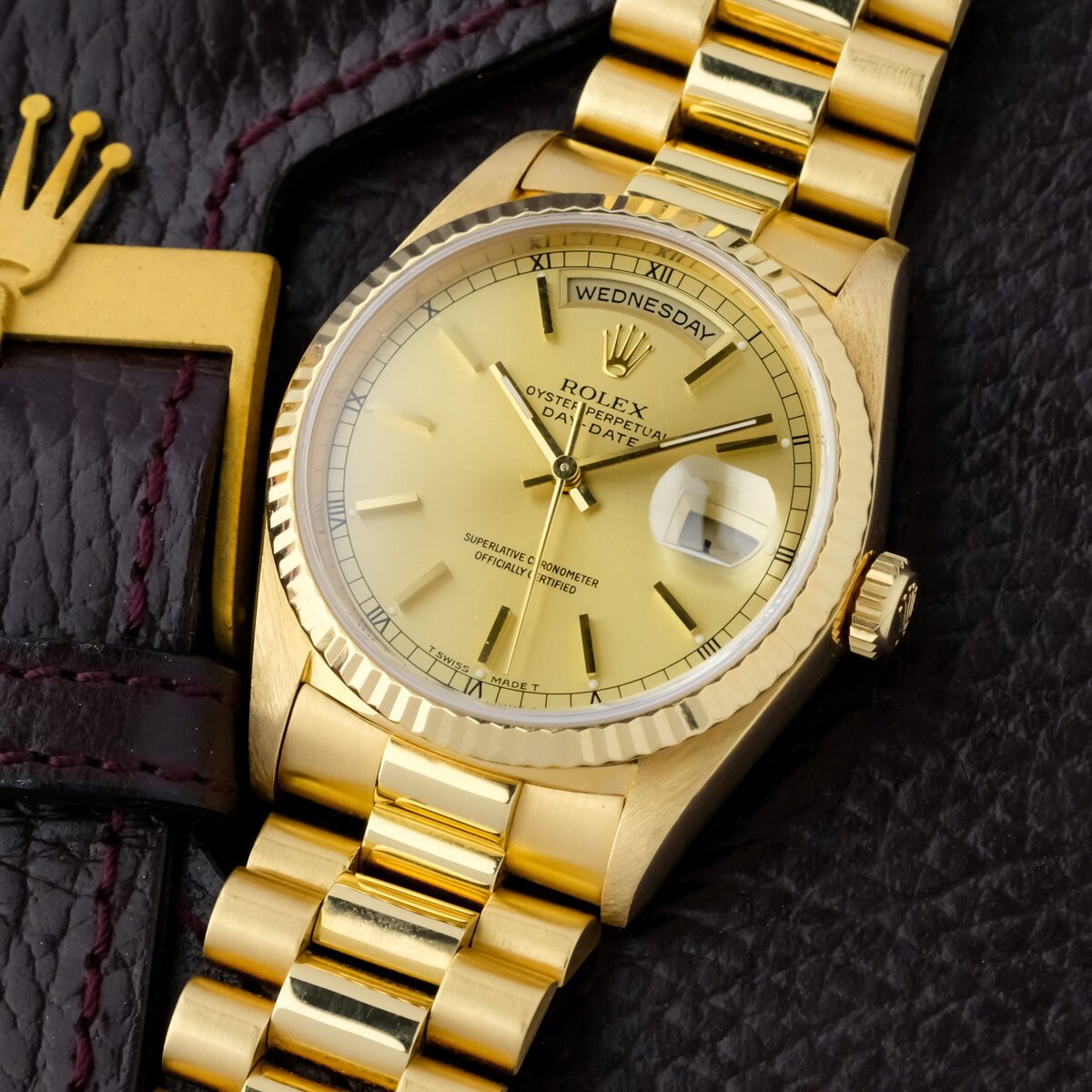The champagne dial, complemented by applied hour markers and the signature day and date windows, exudes timeless sophistication. Powered by Rolex’s automatic caliber featuring the double quick set function, it offers both precision and everyday practicality.
