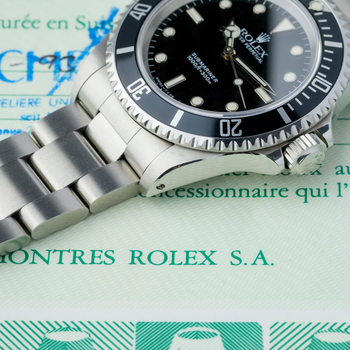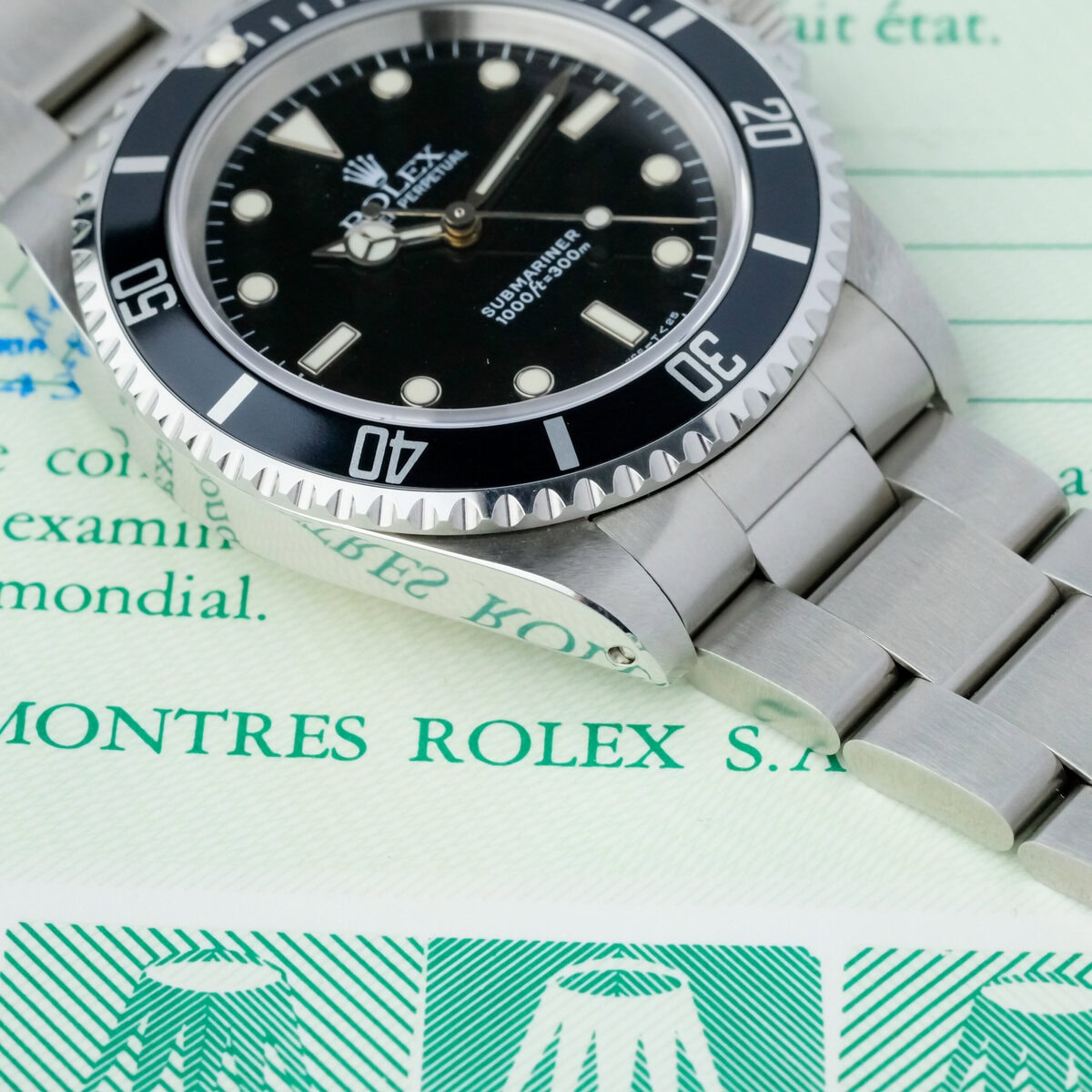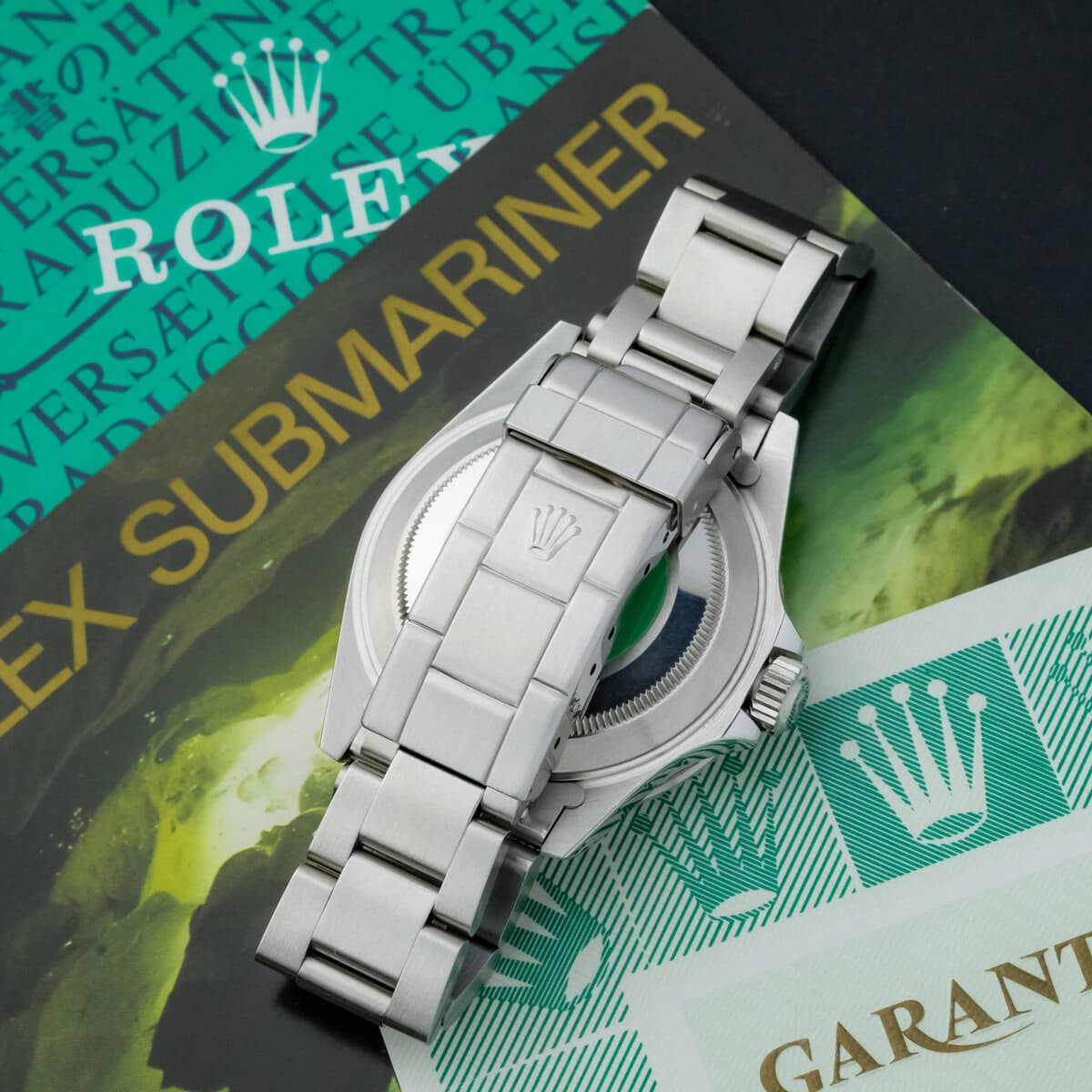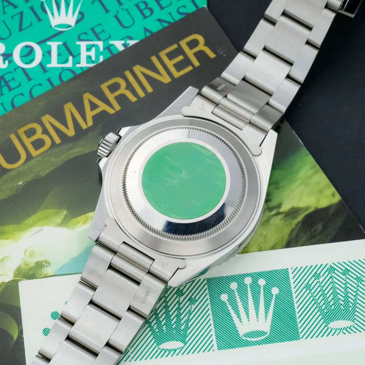 The stainless steel case retains its sharp factory finishing with crisp edges, and the original caseback sticker is still perfectly preserved. Measuring 40 millimeters, the watch carries the classic proportions that have defined the Submariner for decades, paired with a clean black dial free of a date window for pure symmetry.