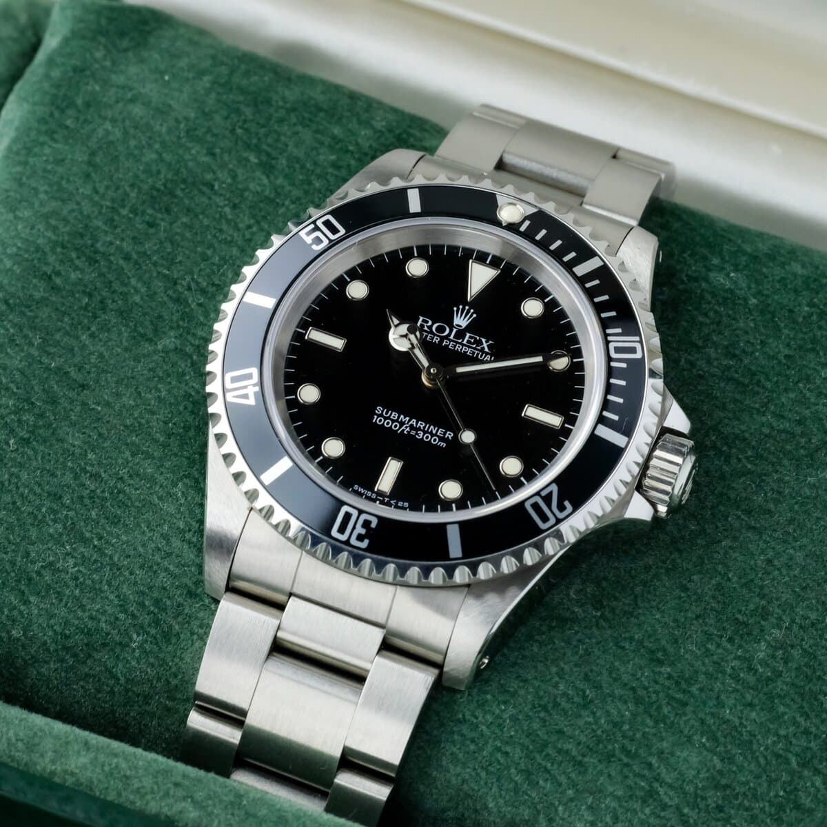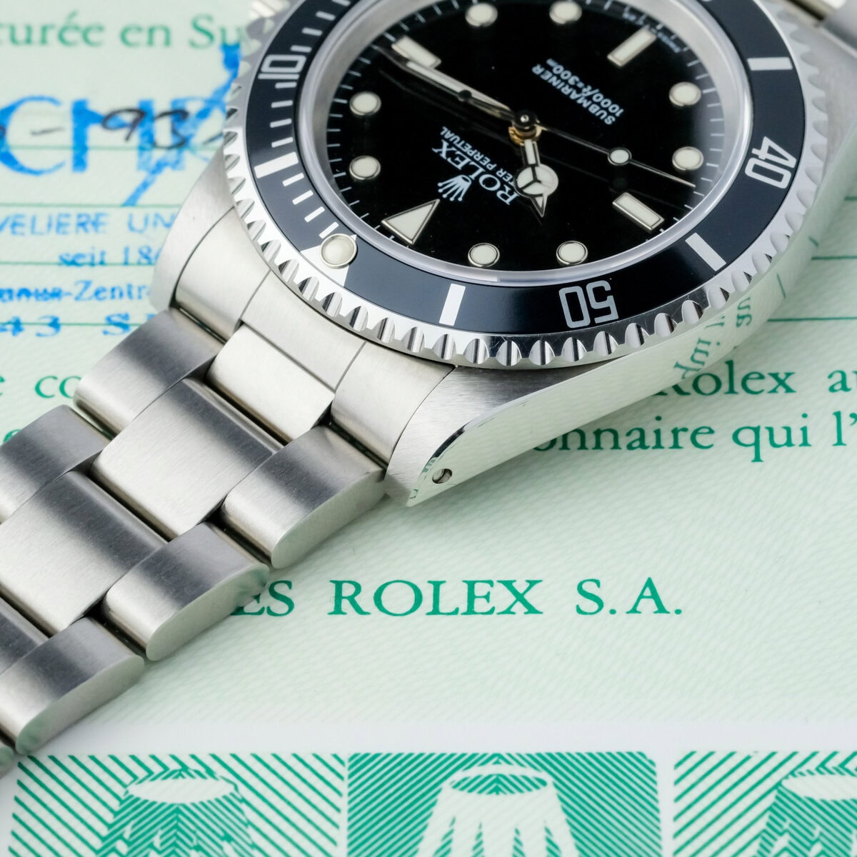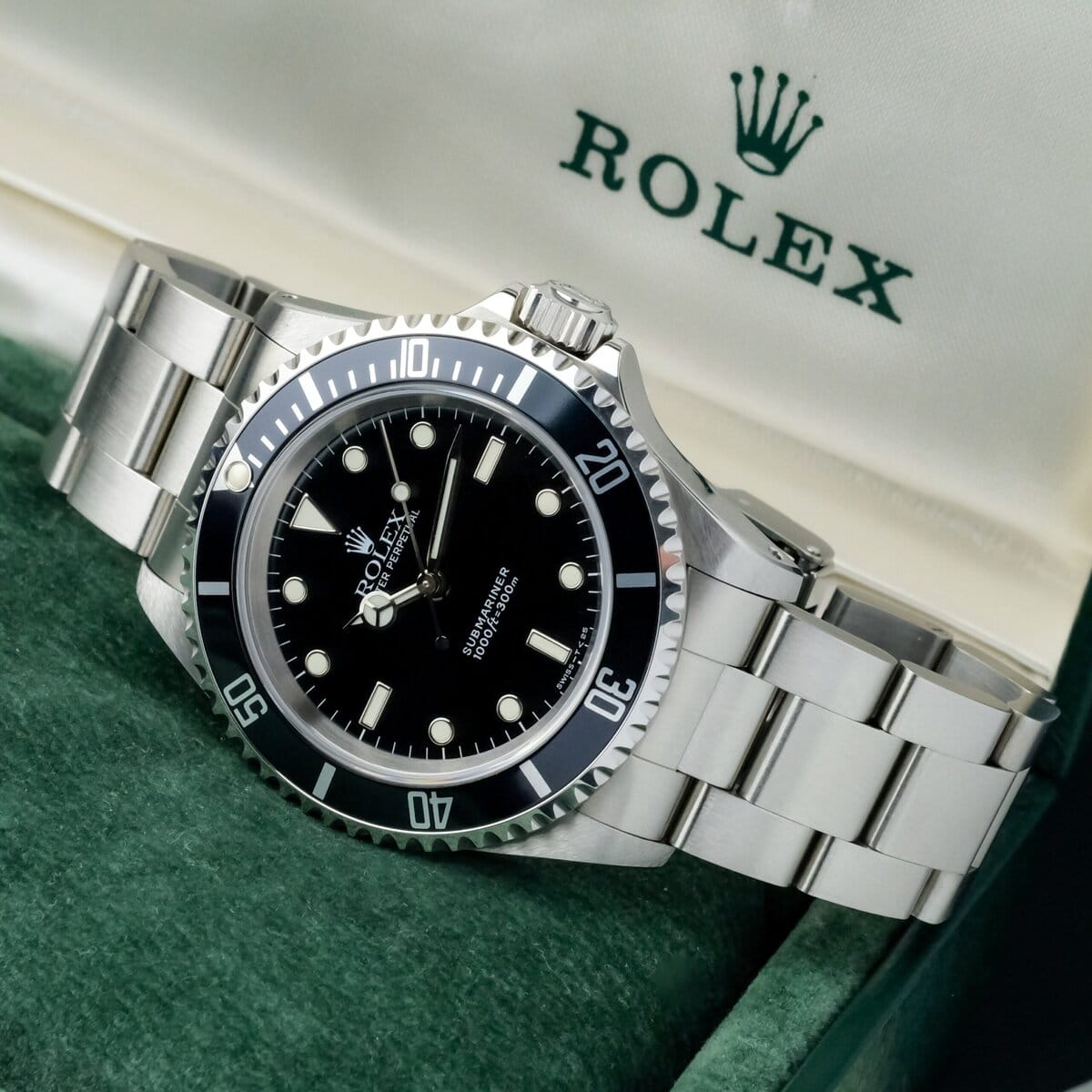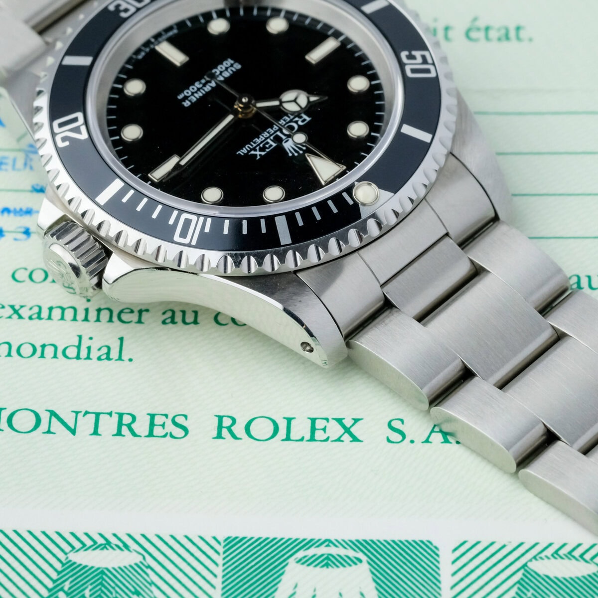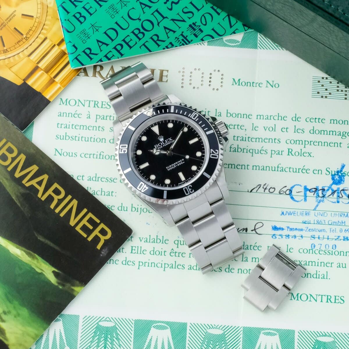 The stainless steel case retains its sharp factory finishing with crisp edges, and the original caseback sticker is still perfectly preserved. Measuring 40 millimeters, the watch carries the classic proportions that have defined the Submariner for decades, paired with a clean black dial free of a date window for pure symmetry.