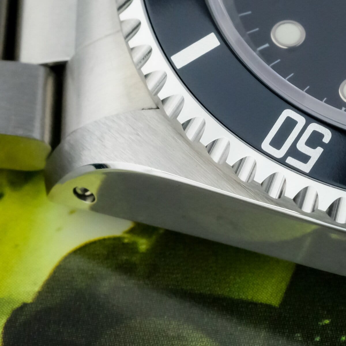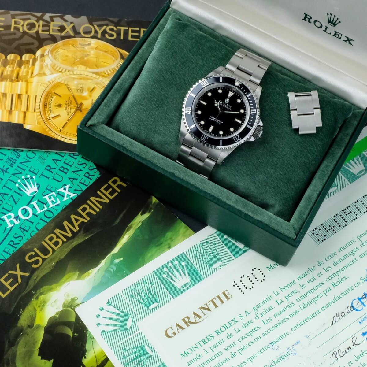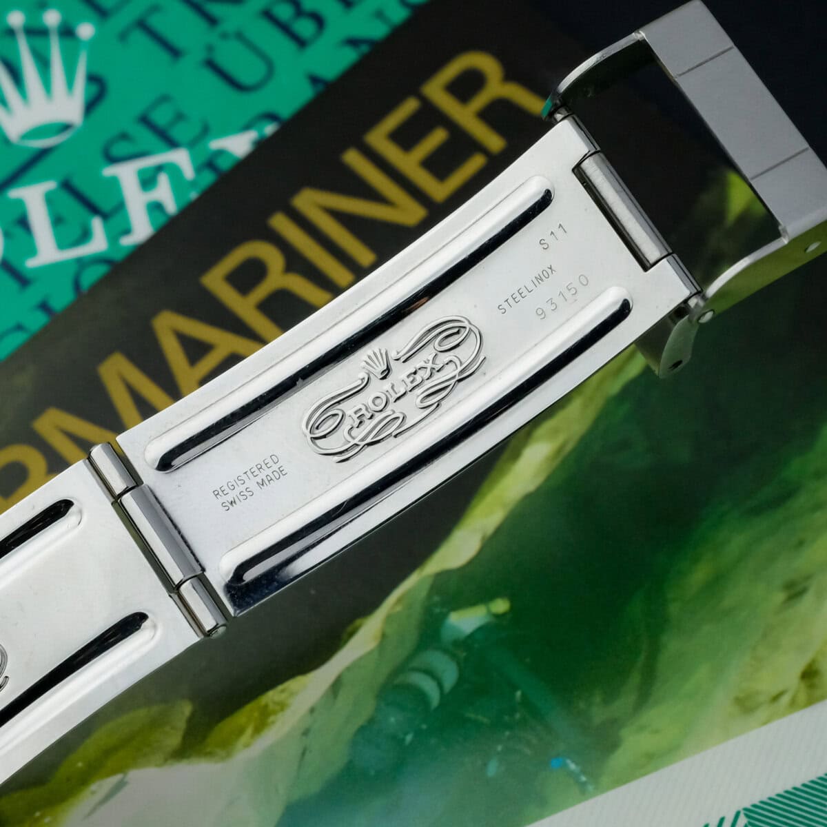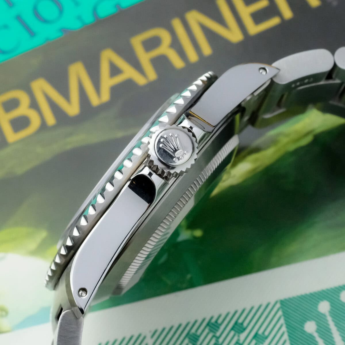 The stainless steel case retains its sharp factory finishing with crisp edges, and the original caseback sticker is still perfectly preserved. Measuring 40 millimeters, the watch carries the classic proportions that have defined the Submariner for decades, paired with a clean black dial free of a date window for pure symmetry.
