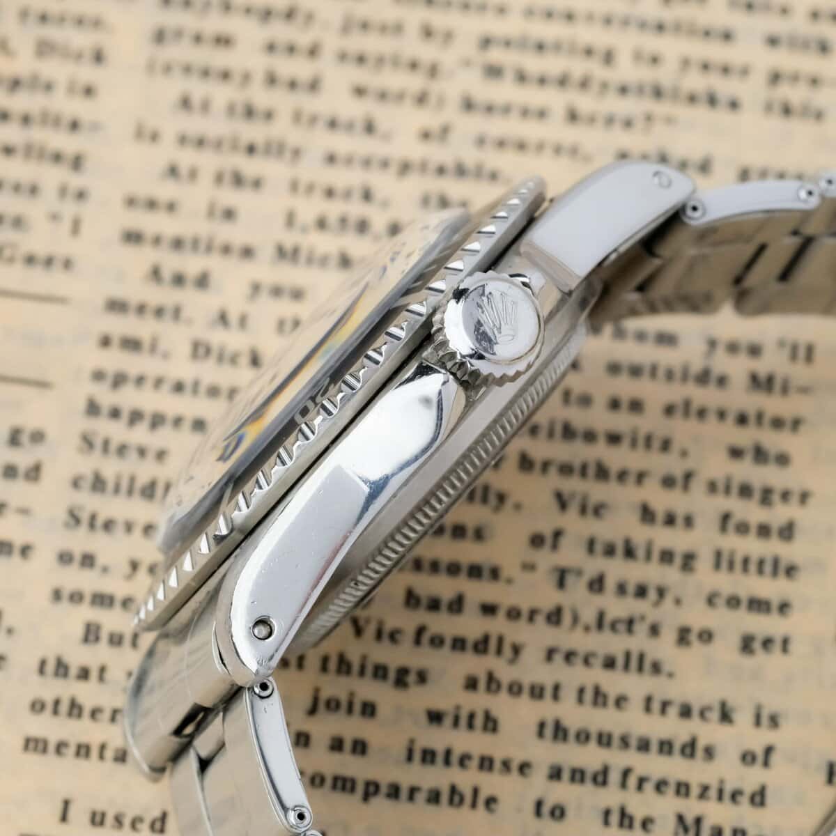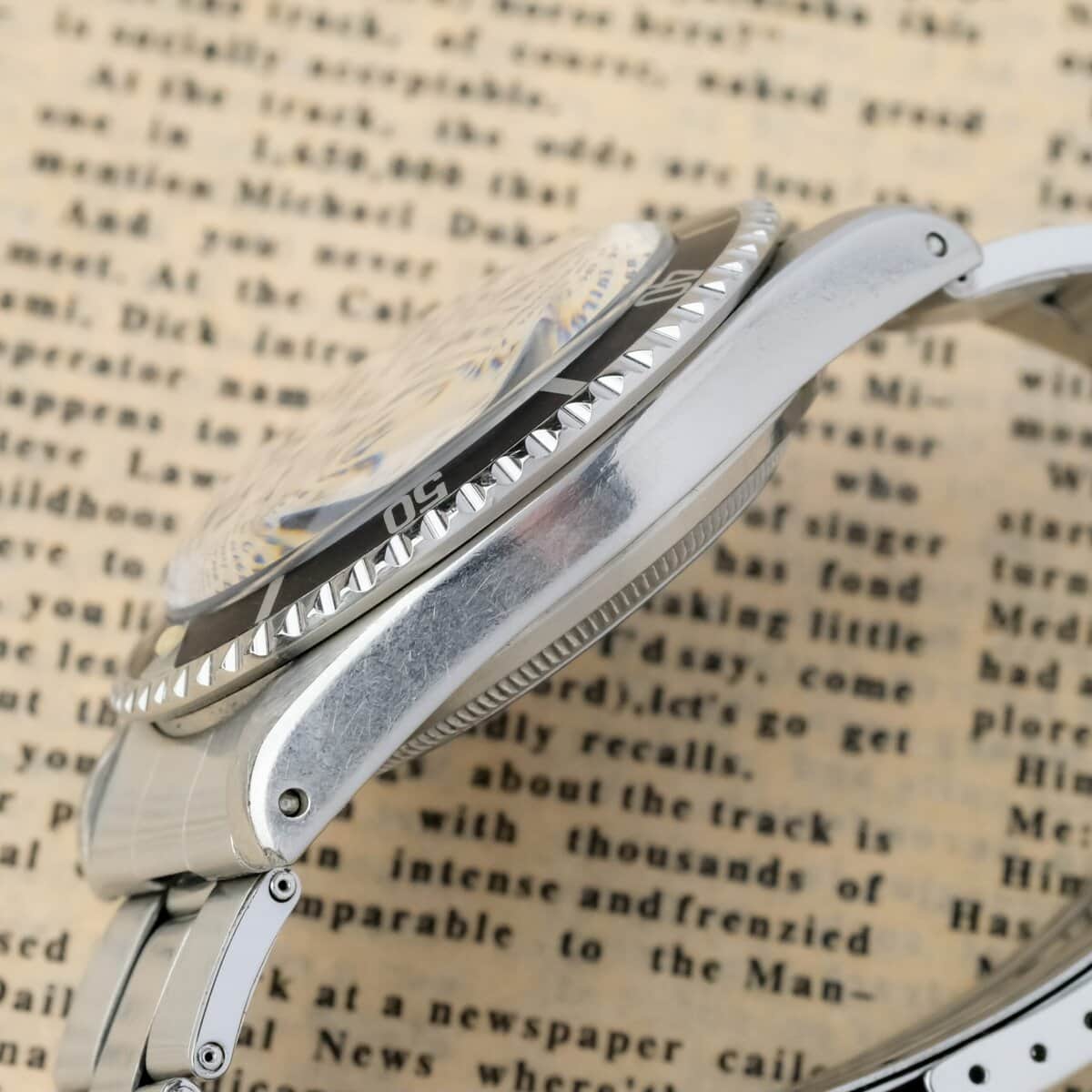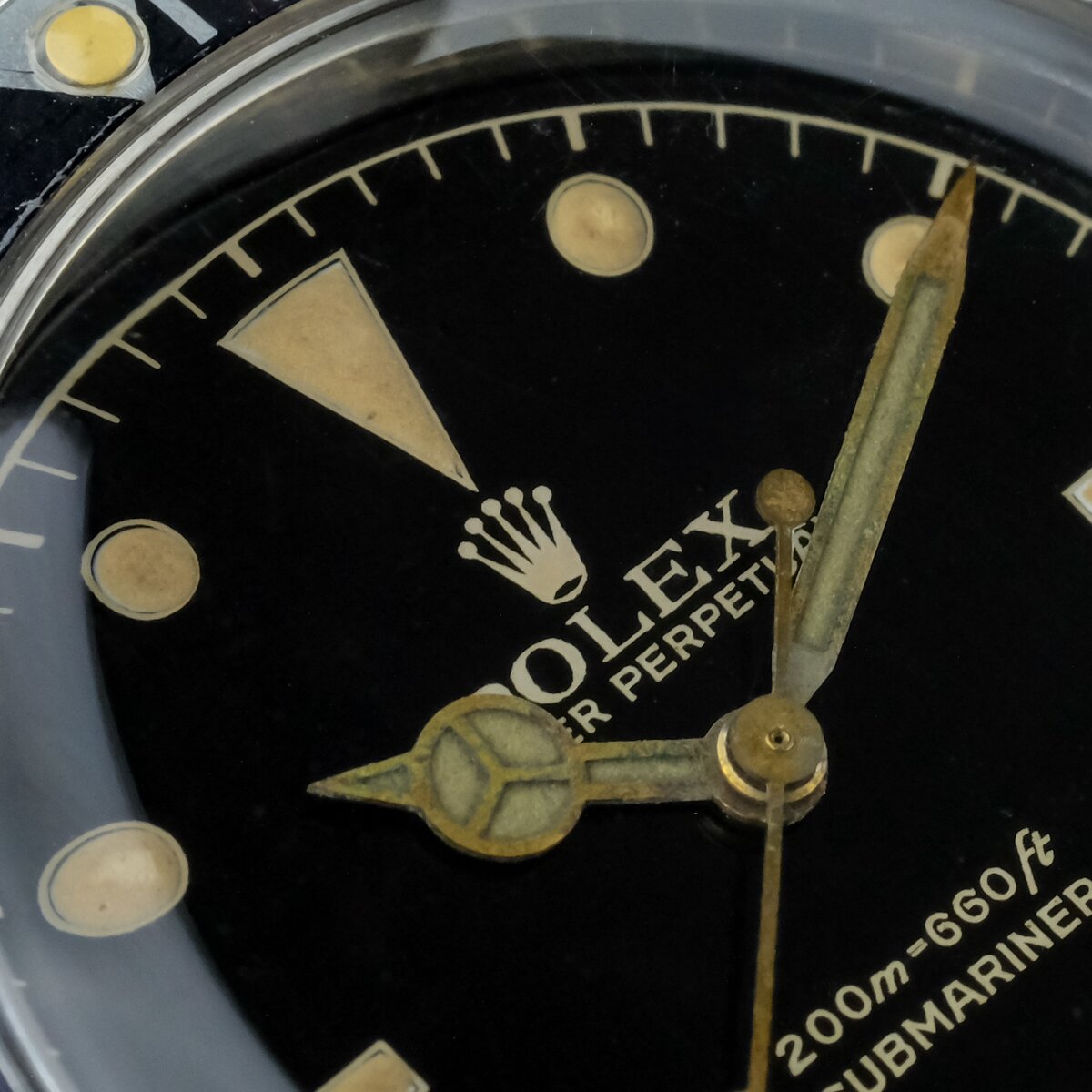 The watch shows a beautiful and even patina across the hands and hour markers, giving the glossy black gilt dial a warm and characterful vintage appearance, with light signs of the hands moving on the dial. The rotating bezel remains in good condition.
