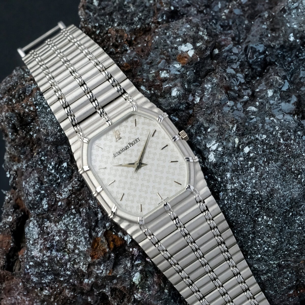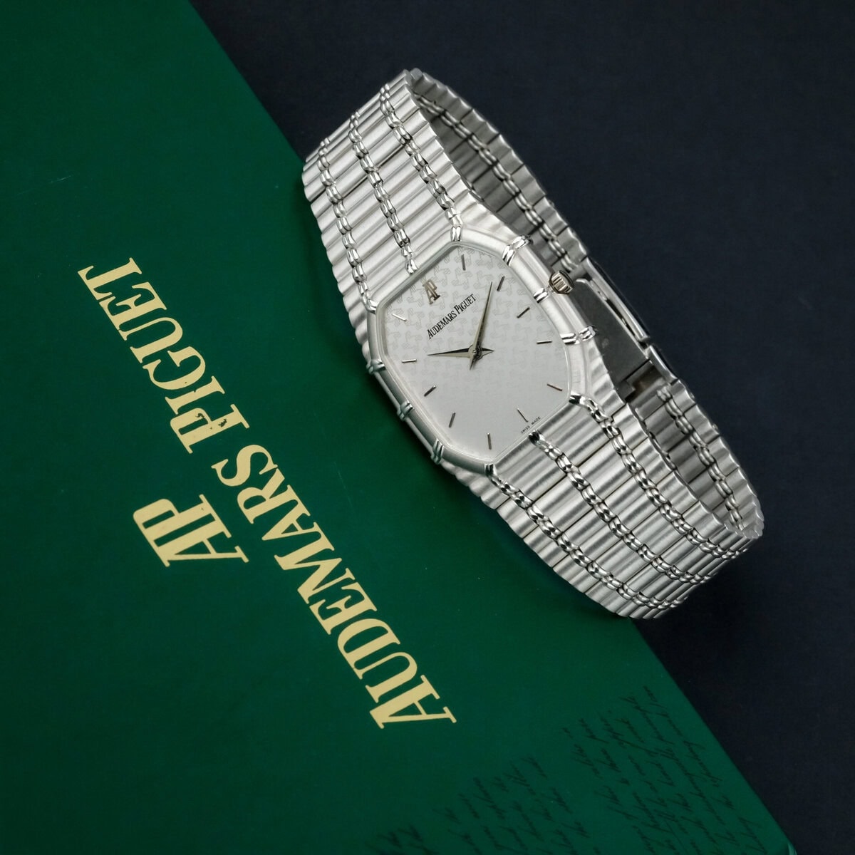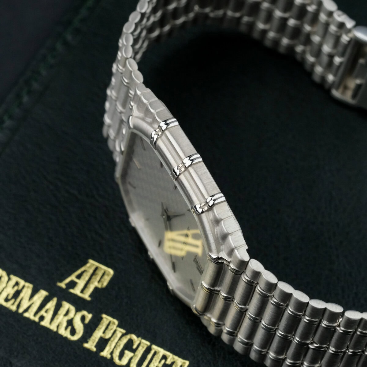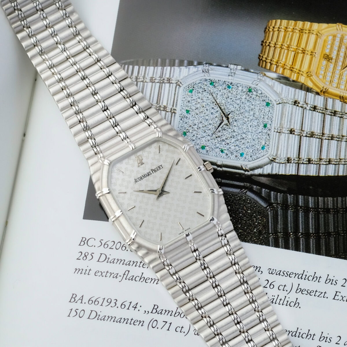 Diese Audemars Piguet Bamboo ist ein außergewöhnlich seltener und eleganter Zeitmesser aus der goldenen Ära des Schweizer Uhrendesigns. Die aus massivem Weißgold gefertigte Uhr verfügt über ein markantes Gehäuse im Bambus-Stil und ein integriertes Armband, das sich mit skulpturalen Details und Raffinesse nahtlos um das Handgelenk legt. Das 27 mal 32 Millimeter große Gehäuse beherbergt ein schlankes Uhrwerk mit Handaufzug, das die Tradition der Marke in Bezug auf feine Handwerkskunst und mechanische Eleganz widerspiegelt. Die Gesamtästhetik ist kühn und anmutig zugleich und verbindet eine schmuckähnliche Textur mit minimalistischer Uhrmacherkunst. Dieses Exemplar ist in echtem „New Old Stock“-Zustand erhalten, zeigt keine Anzeichen von Verschleiß und behält durchweg seine originale Werkslackierung. Es wird als komplettes Set geliefert, einschließlich Originalbox und Papieren, was es zu einem außergewöhnlichen Sammlerstück macht. Selten auf dem Markt und in diesem Zustand praktisch unmöglich zu finden, ist dies eine einzigartige Gelegenheit, eine echte Audemars Piguet Design-Ikone aus einer äußerst kreativen Periode in der Geschichte der Marke zu besitzen. *bei Verkauf innerhalb der Europäischen Union unterliegt die Uhr der 19%igen Mehrwertsteuer