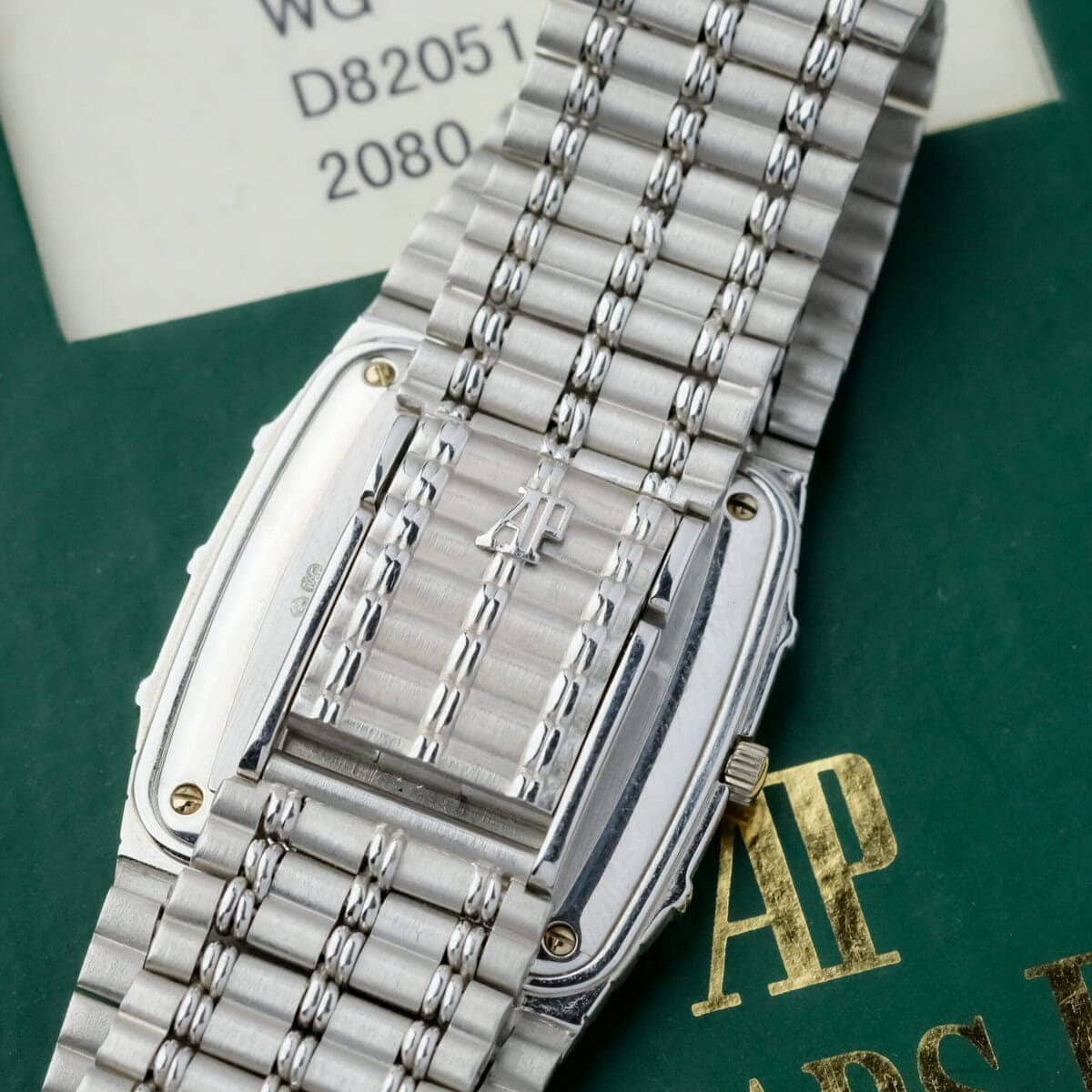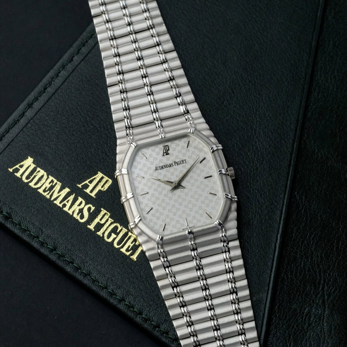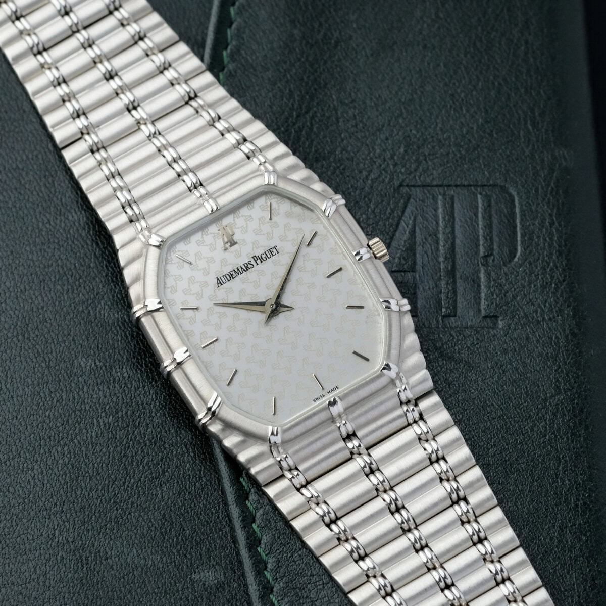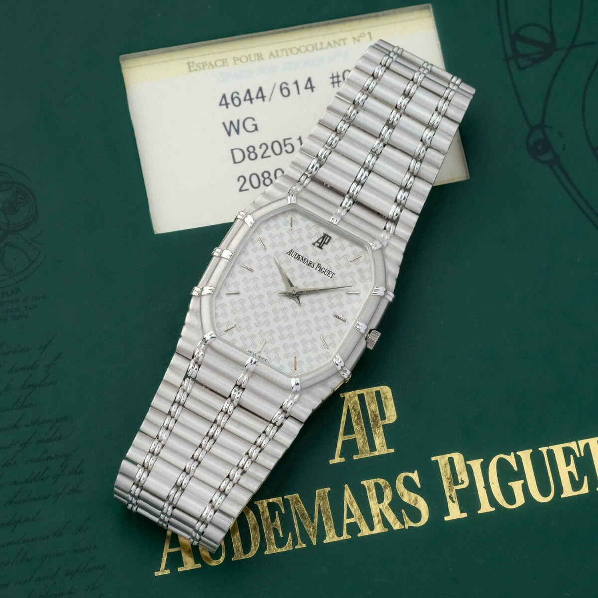 Diese Audemars Piguet Bamboo ist ein außergewöhnlich seltener und eleganter Zeitmesser aus der goldenen Ära des Schweizer Uhrendesigns. Die aus massivem Weißgold gefertigte Uhr verfügt über ein markantes Gehäuse im Bambus-Stil und ein integriertes Armband, das sich mit skulpturalen Details und Raffinesse nahtlos um das Handgelenk legt. Das 27 mal 32 Millimeter große Gehäuse beherbergt ein schlankes Uhrwerk mit Handaufzug, das die Tradition der Marke in Bezug auf feine Handwerkskunst und mechanische Eleganz widerspiegelt. Die Gesamtästhetik ist kühn und anmutig zugleich und verbindet eine schmuckähnliche Textur mit minimalistischer Uhrmacherkunst. Dieses Exemplar ist in echtem „New Old Stock“-Zustand erhalten, zeigt keine Anzeichen von Verschleiß und behält durchweg seine originale Werkslackierung. Es wird als komplettes Set geliefert, einschließlich Originalbox und Papieren, was es zu einem außergewöhnlichen Sammlerstück macht. Selten auf dem Markt und in diesem Zustand praktisch unmöglich zu finden, ist dies eine einzigartige Gelegenheit, eine echte Audemars Piguet Design-Ikone aus einer äußerst kreativen Periode in der Geschichte der Marke zu besitzen. *bei Verkauf innerhalb der Europäischen Union unterliegt die Uhr der 19%igen Mehrwertsteuer