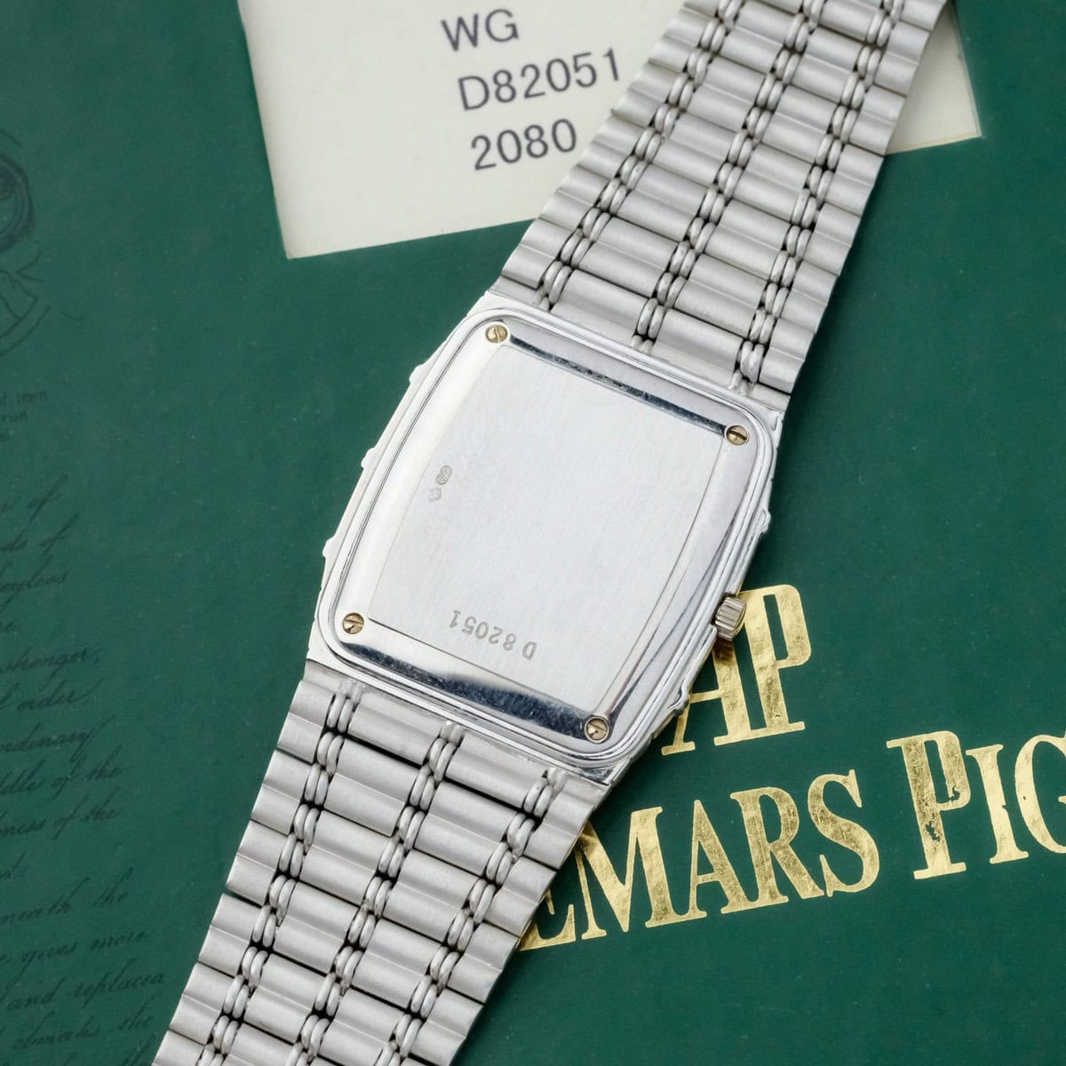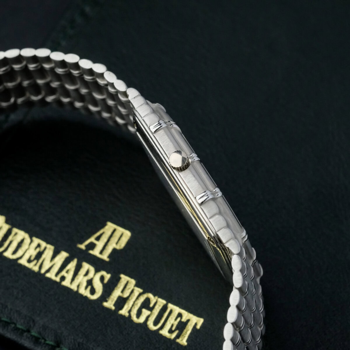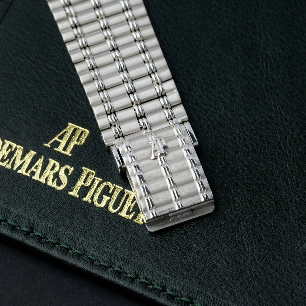 Dieses Exemplar ist in echtem "New Old Stock"-Zustand erhalten, zeigt keine Anzeichen von Verschleiß und behält durchweg seine originale Werkslackierung. Es wird als komplettes Set geliefert, einschließlich Originalbox und Papieren, was es zu einem außergewöhnlichen Sammlerstück macht. Selten auf dem Markt und in diesem Zustand praktisch unmöglich zu finden, ist dies eine einzigartige Gelegenheit, eine echte Audemars Piguet Design-Ikone aus einer äußerst kreativen Periode in der Geschichte der Marke zu besitzen.