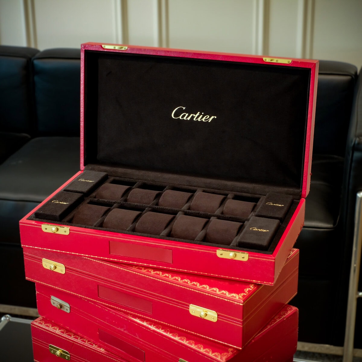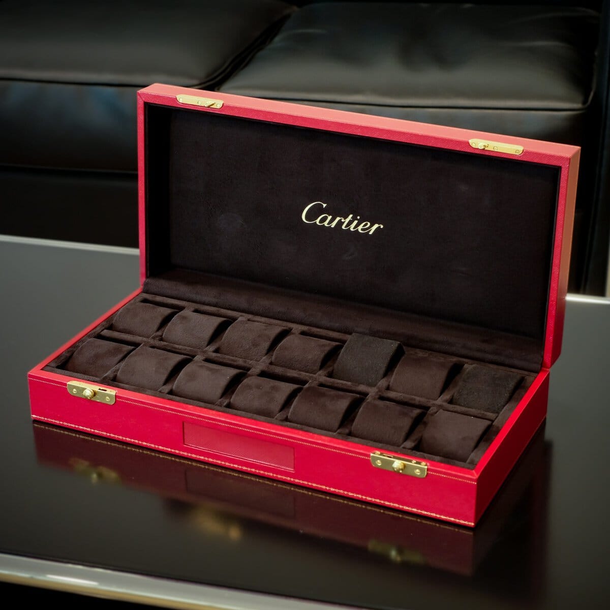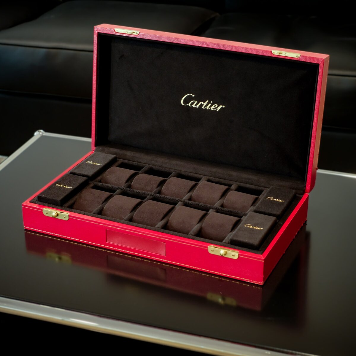 This Cartier collector’s watch box is a rare and elegant storage case available in both 10- and 12-slot configurations. Finished in Cartier’s signature red leather with gold detailing and a soft black velvet interior, it reflects the maison’s refined craftsmanship and attention to detail.