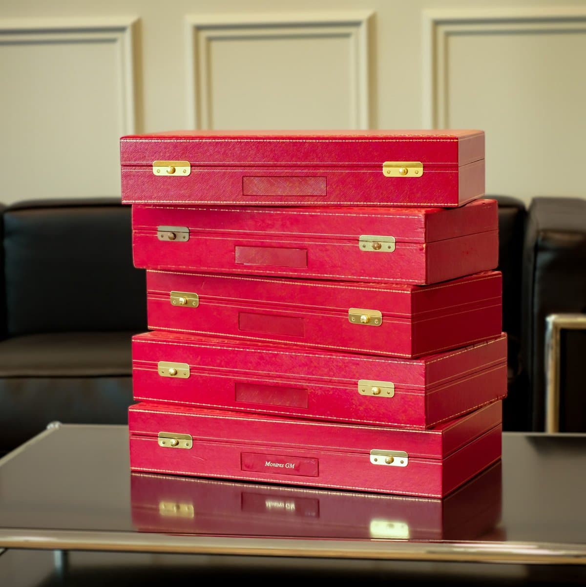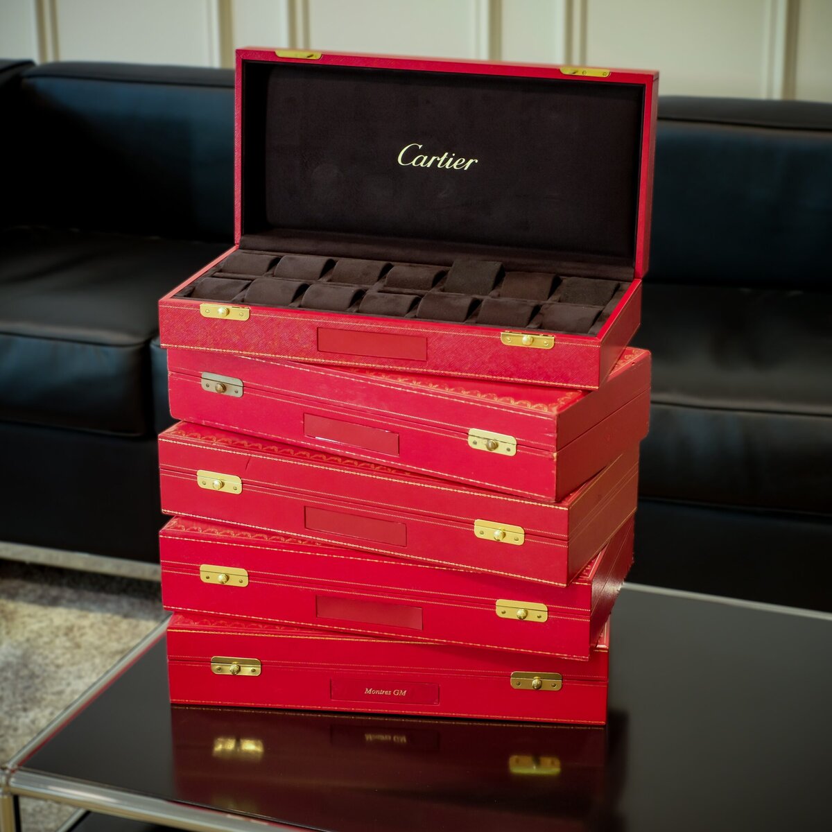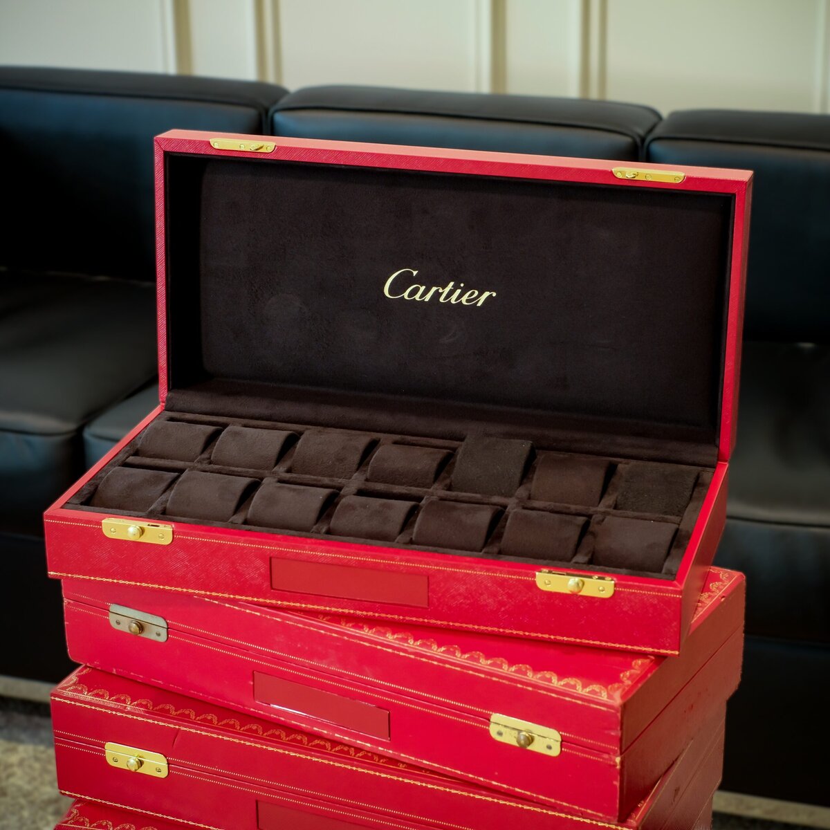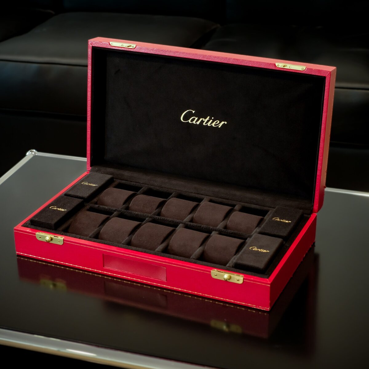 This Cartier collector’s watch box is a rare and elegant storage case available in both 10- and 12-slot configurations. Finished in Cartier’s signature red leather with gold detailing and a soft black velvet interior, it reflects the maison’s refined craftsmanship and attention to detail.
