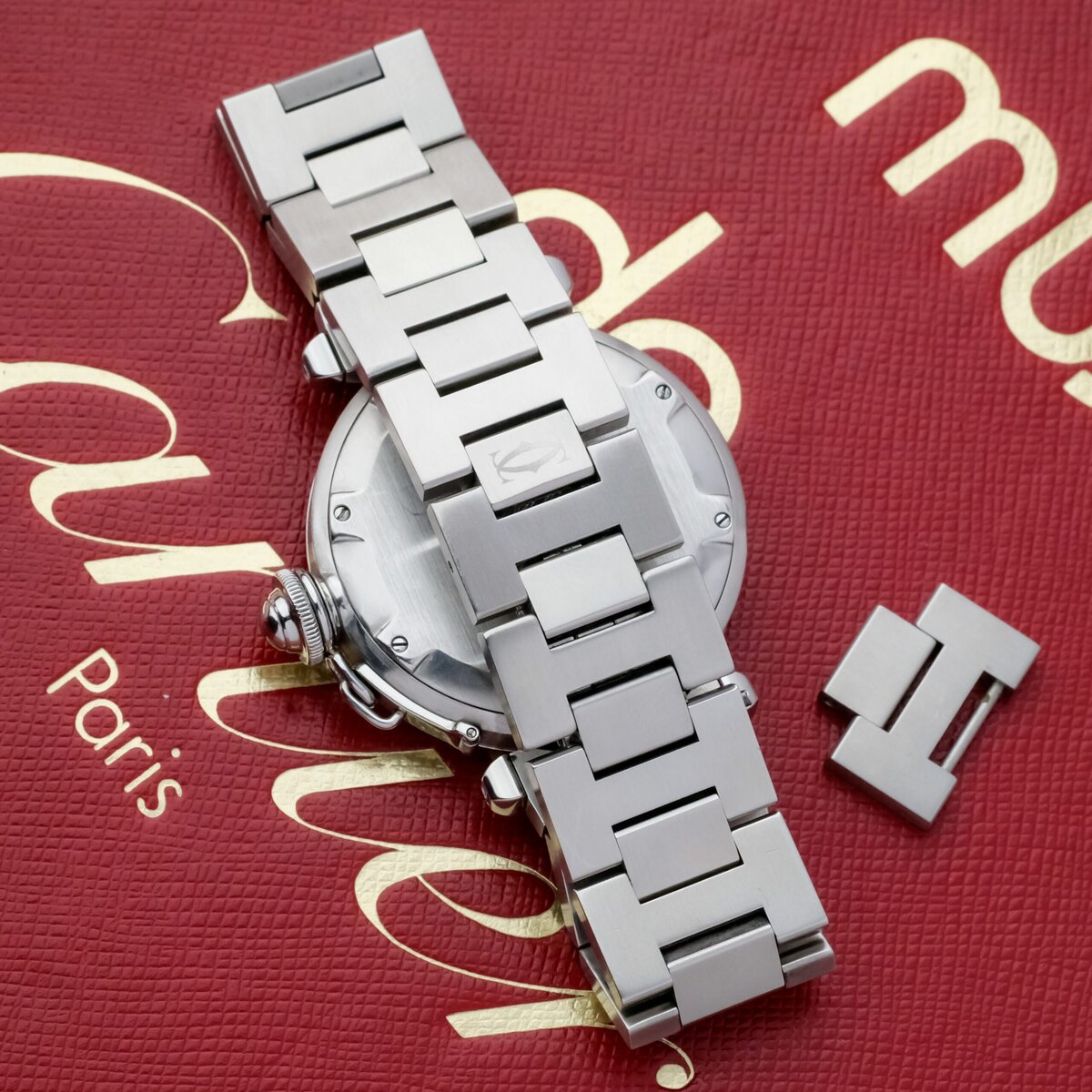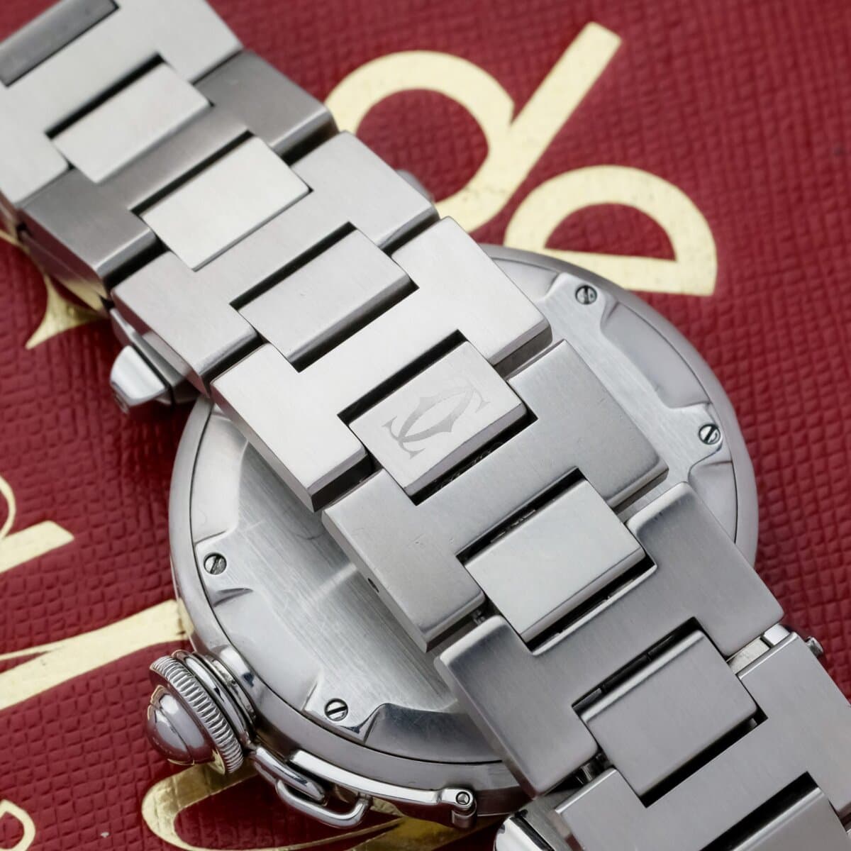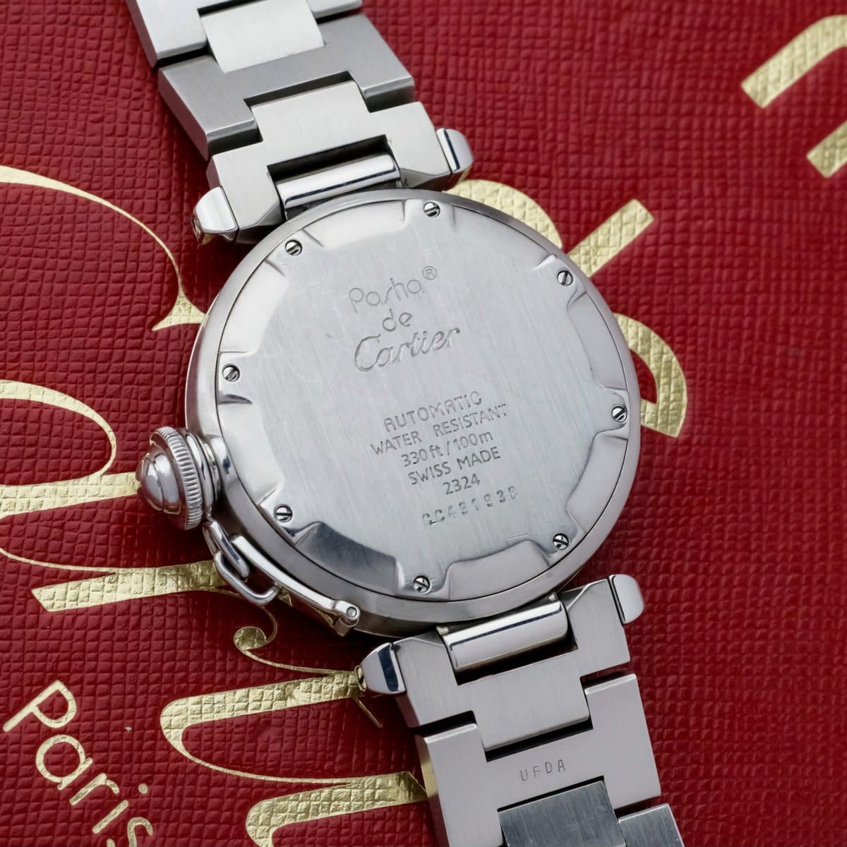 Cartier Pasha Automatic Referenz 2324 in Edelstahl, angetrieben von einem Automatikwerk und ausgestattet mit dem originalen Stahlarmband. Diese klassische Pasha verfügt über die charakteristische verschraubte Krone mit Sicherheitskette, ein charakteristisches Element des Designs des Modells.