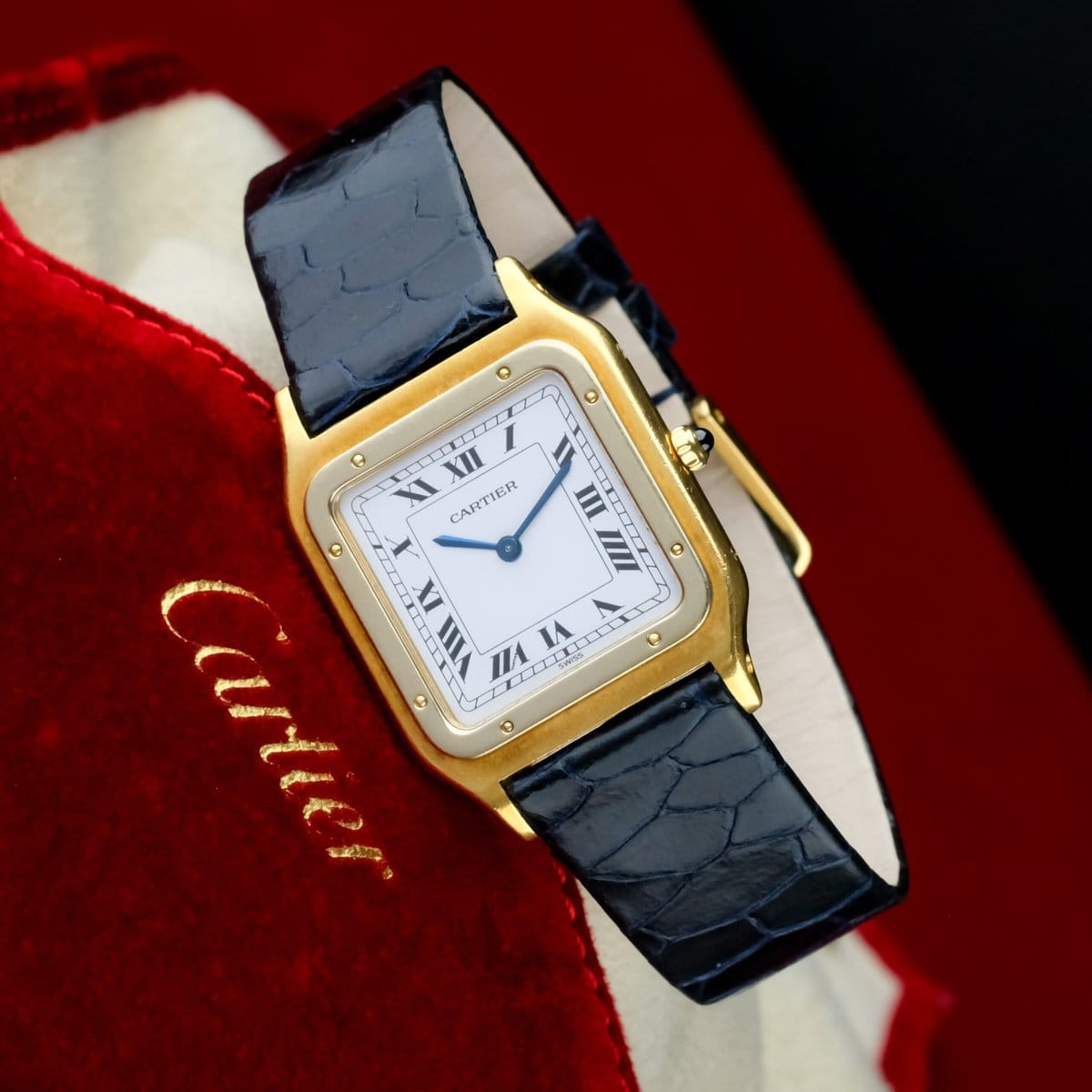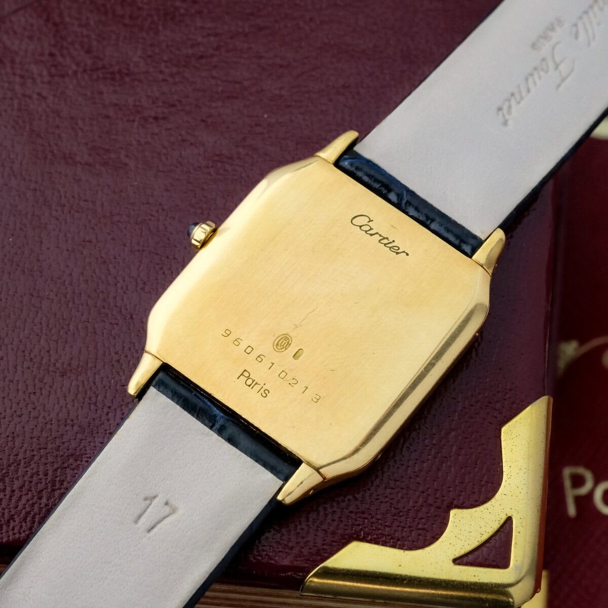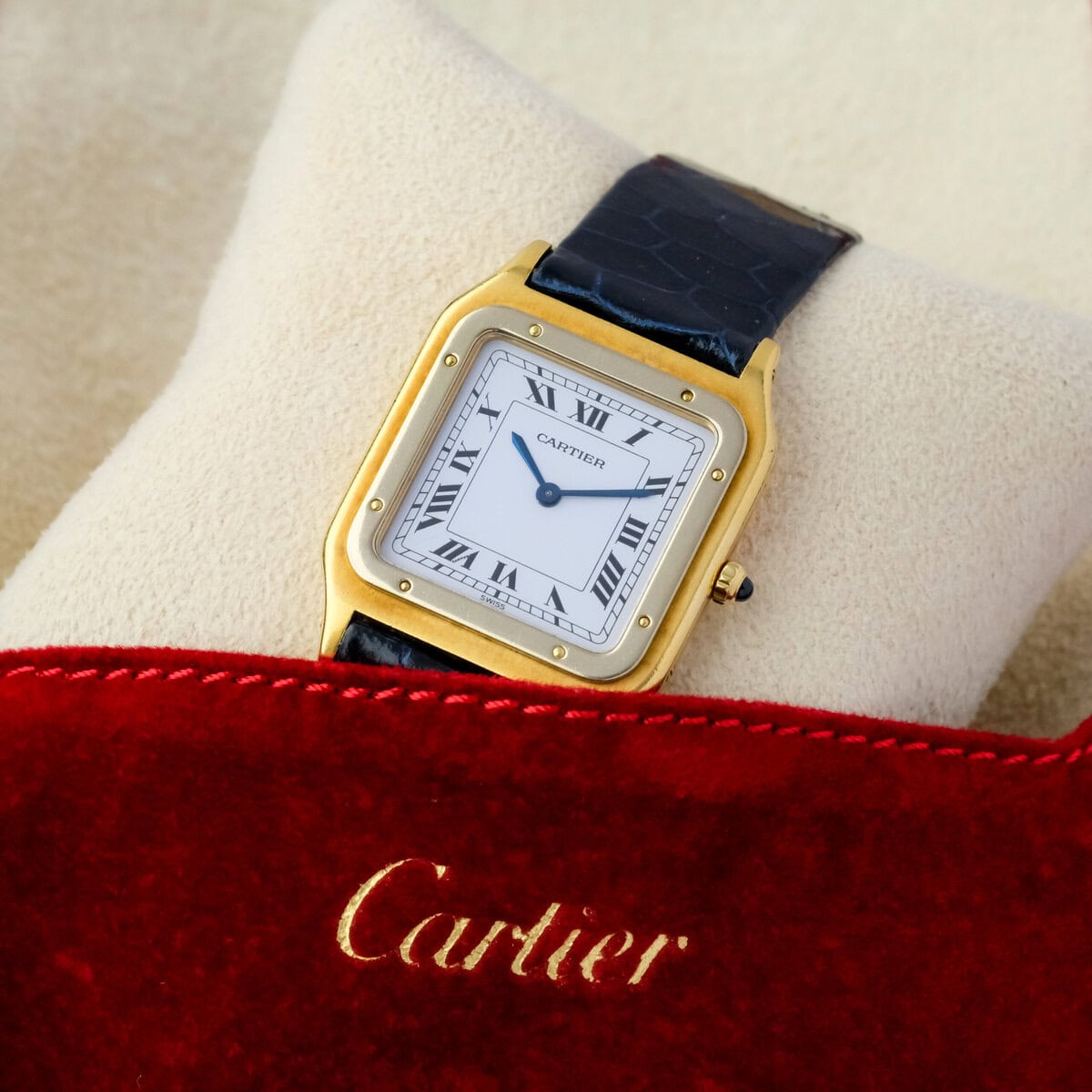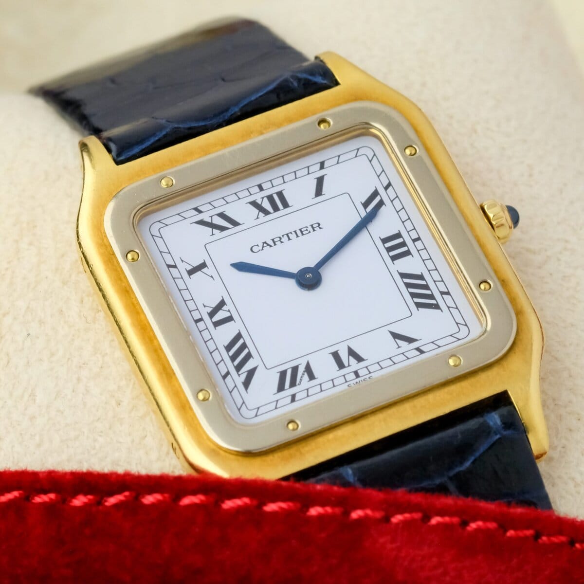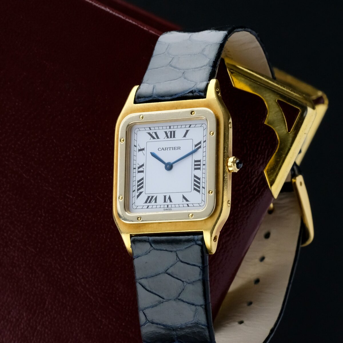Nur als Uhr angeboten, ist dies ein raffiniertes und elegantes Beispiel der Santos Dumont Extra Plate, die technische Exzellenz, edle Materialien und eine der attraktivsten zwei Goldausführungen von Cartier kombiniert.