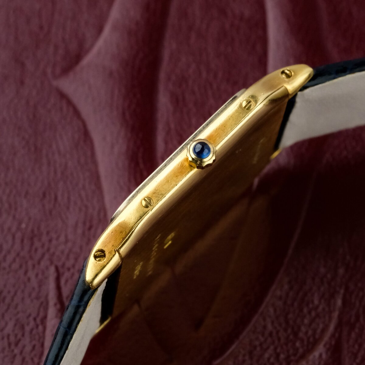 Cartier Santos Dumont Extra Plate „Deux Ors“ Referenz 96061 aus 18 Karat Gelbgold mit einer Lünette aus Weißgold, 27 mal 36 Millimeter groß und angetrieben vom ultraflachen Handaufzugskaliber 21 von F Piguet. Dieses Modell der Extra Plate zeichnet sich durch sein außergewöhnlich schlankes Profil und seine raffinierten Proportionen aus.Die begehrte Deux Ors-Konfiguration kombiniert zwei Goldlegierungen, Gelbgold für das Gehäuse und Weißgold für die Lünette, ein subtiles Designdetail mit hohem Sammlerwert, das in der französischen Designsprache von Cartier wurzelt. Das Zifferblatt ist sauber und gut erhalten, und das Gehäuse behält eine starke Definition mit scharfen Linien. Nur als Uhr angeboten, ist dies ein raffiniertes und elegantes Beispiel der Santos Dumont Extra Plate, die technische Exzellenz, edle Materialien und eine der attraktivsten zwei Goldausführungen von Cartier kombiniert.