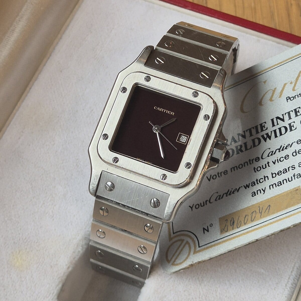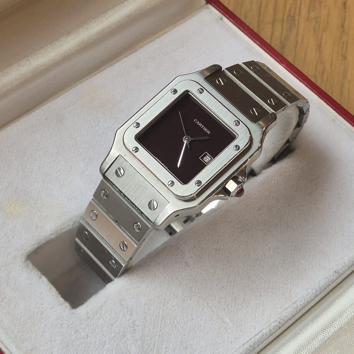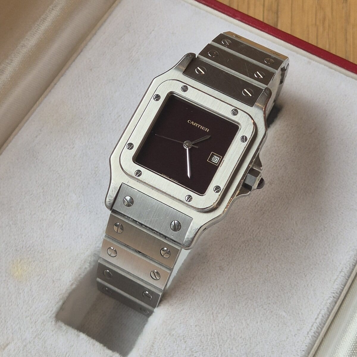 Cartier Santos Carrée GM Referenz 2960 Burgundy aus Edelstahl, 29 mal 41 Millimeter groß und von einem Automatikwerk angetrieben. Dieses Exemplar verfügt über das begehrte Swiss Made-Zifferblatt in Burgunderrot, eine seltene und äußerst attraktive Konfiguration, die der Uhr einen starken monochromen Charakter mit ausgezeichneter Farbtiefe verleiht.