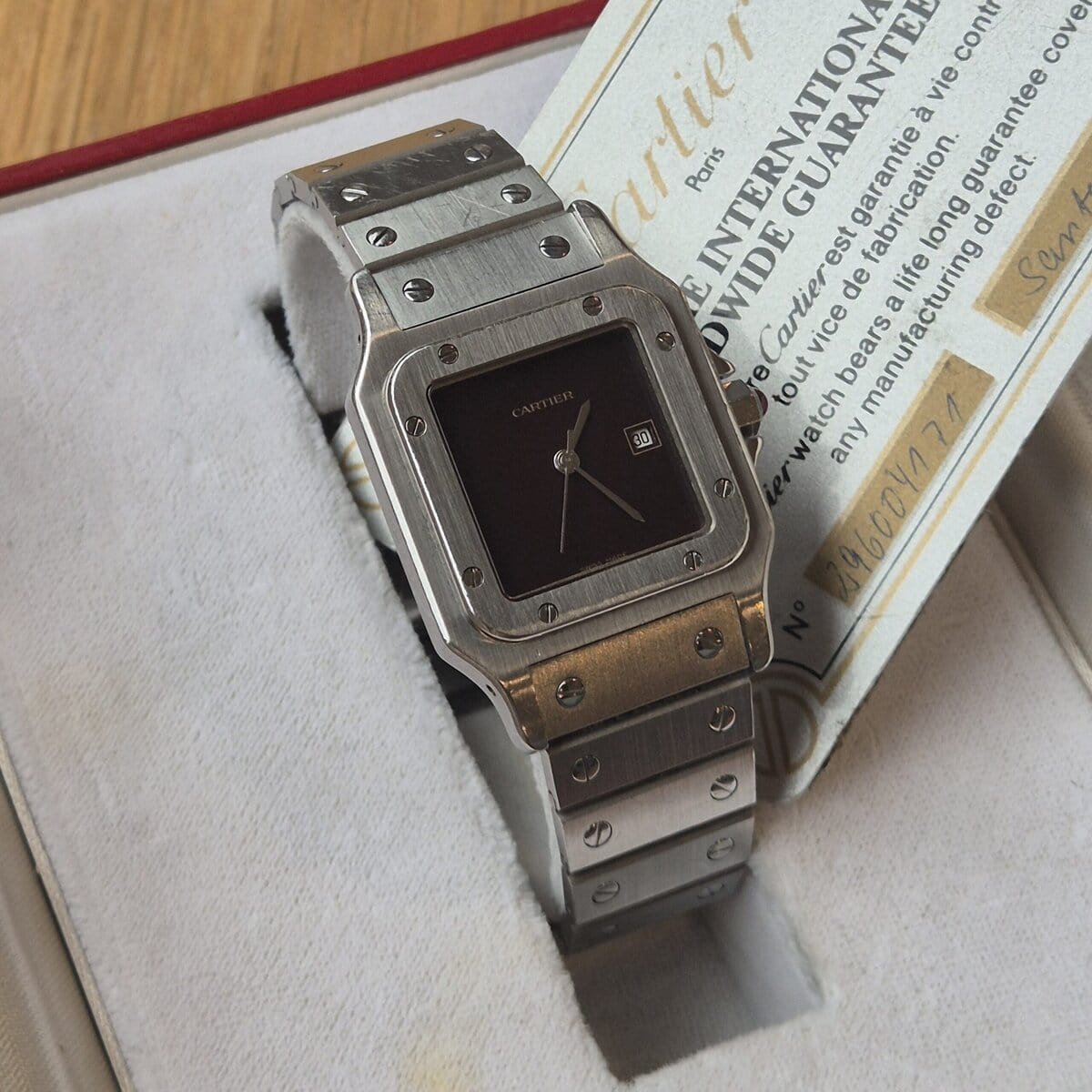 Diese Santos Carrée GM, die als komplettes Set angeboten wird, hebt sich durch die Kombination einer seltenen Zifferblattfarbe mit einem guten Gesamtzustand und einer vollständigen Präsentation als Sammlerstück und unverwechselbare Variante hervor.