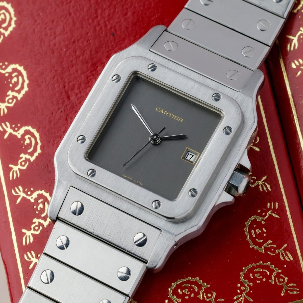 Cartier Santos Carrée Ghost Dial Referenz 2960 in Edelstahl, Messung 29 mal 41 Millimeter und angetrieben von einem Automatikwerk. Dieses Exemplar verfügt über das begehrte Swiss Made Geisterzifferblatt, das der Uhr ihr unverwechselbares monochromes und dezentes Aussehen verleiht.