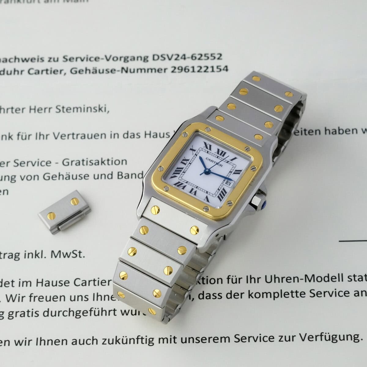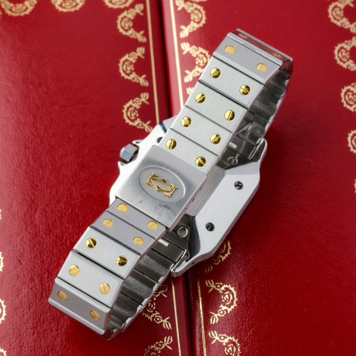 Diese Cartier Santos Carrée Ref. 2961 ist eine klassische zweifarbige Version eines der ikonischsten Modelle von Cartier. Sie kombiniert Edelstahl und 18-karätiges Gelbgold in einem Design, das zeitlos bleibt und sofort erkennbar ist. Die Uhr hatte einen Service von Cartier.