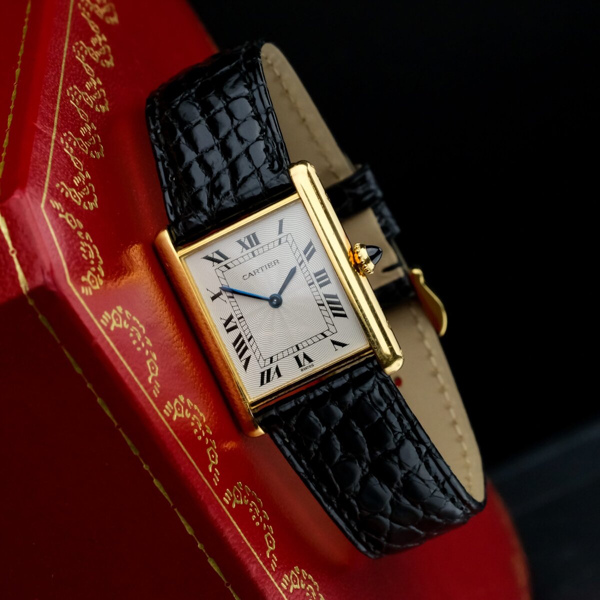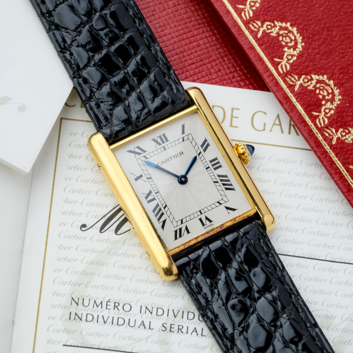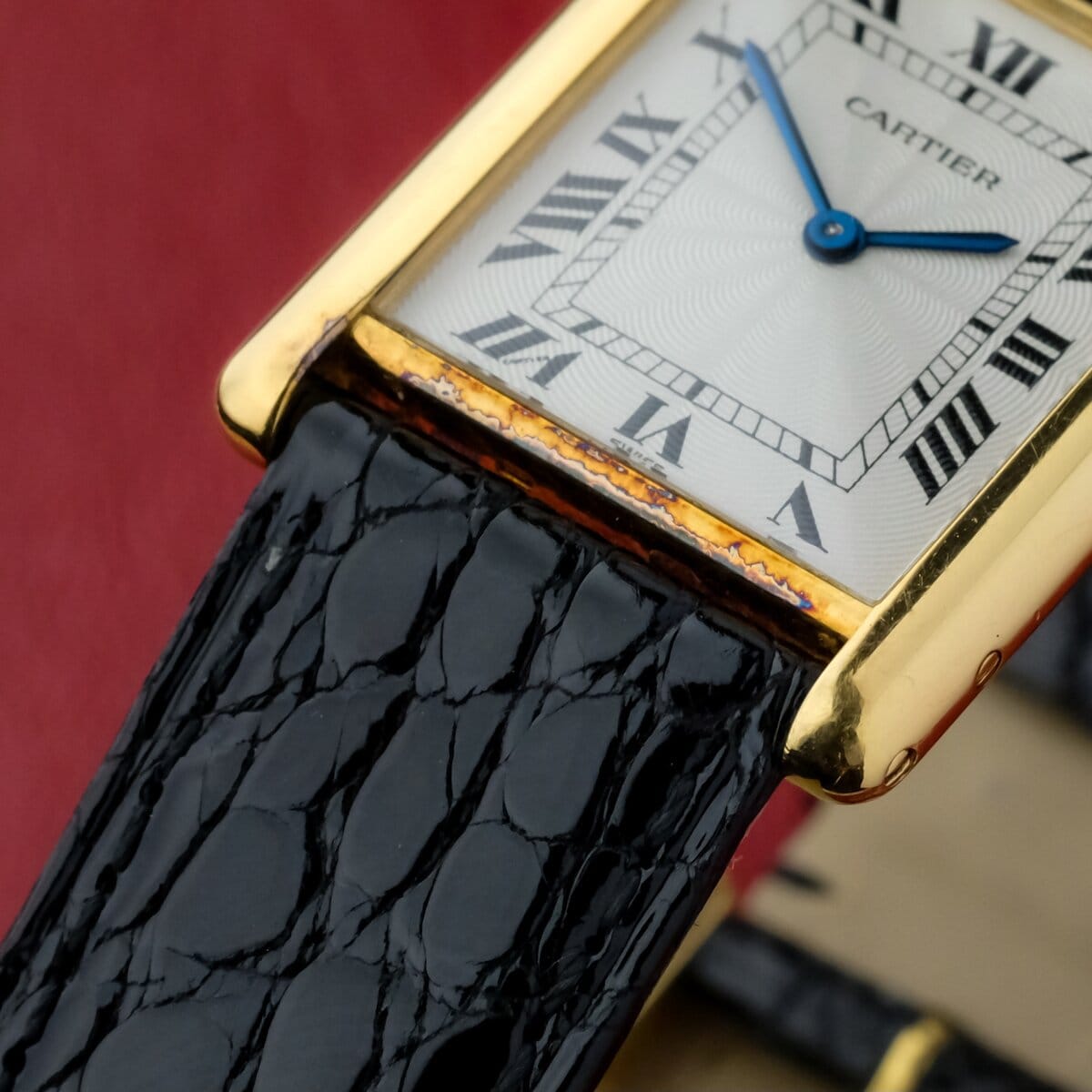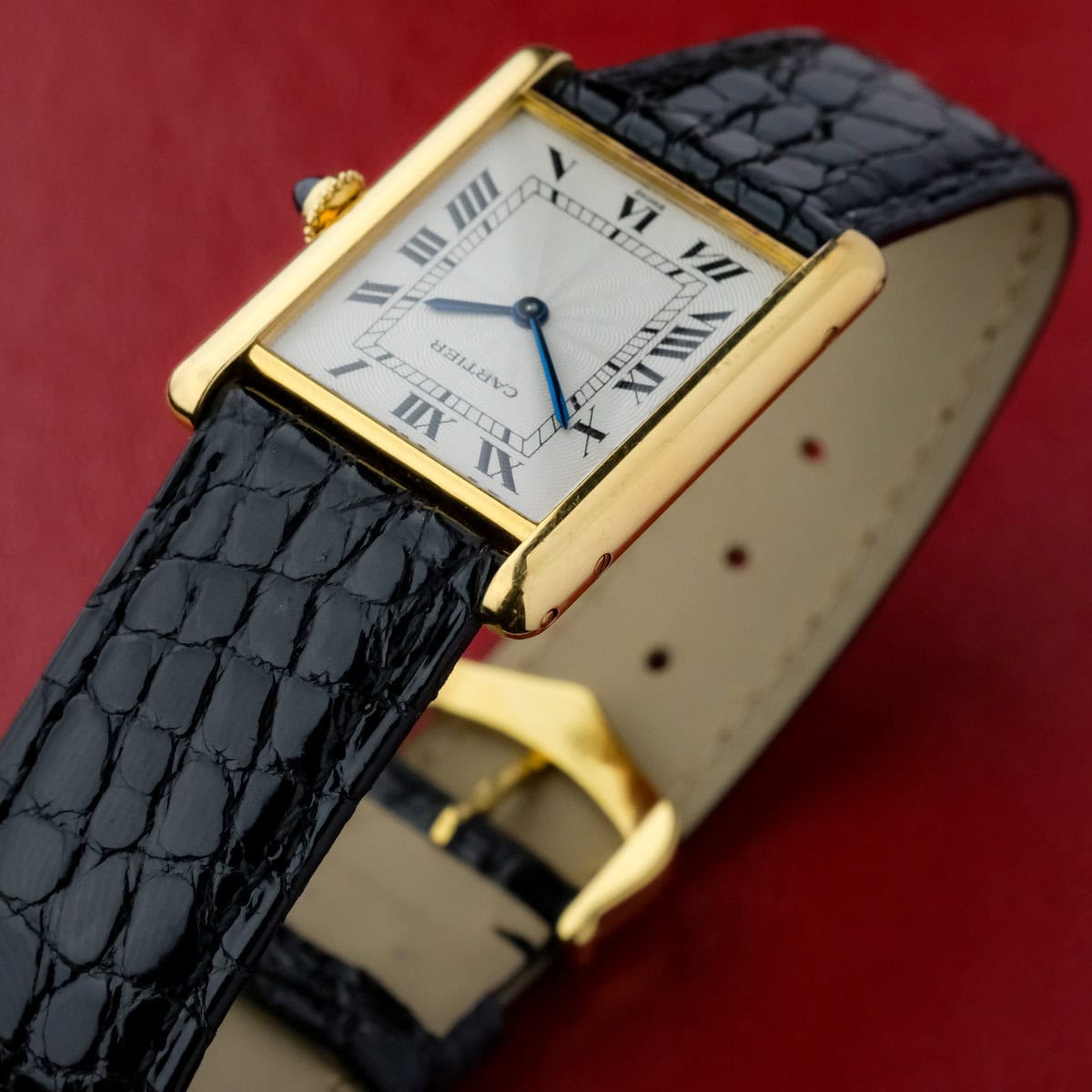 Das guillochierte Zifferblatt ist in hervorragendem Zustand und zeigt die für Cartier charakteristischen römischen Ziffern, die gebläuten Stahlzeiger und die Minutenzählung mit bemerkenswerter Klarheit. Das Uhrwerk mit Handaufzug bewahrt den Charme der traditionellen Uhrmacherkunst und das schlanke Profil, das die Linie Extra Plate auszeichnet, und macht sie zu einer diskreten und zugleich raffinierten Wahl.