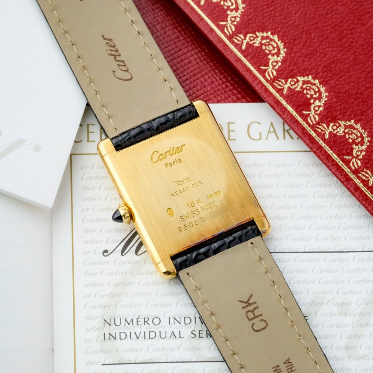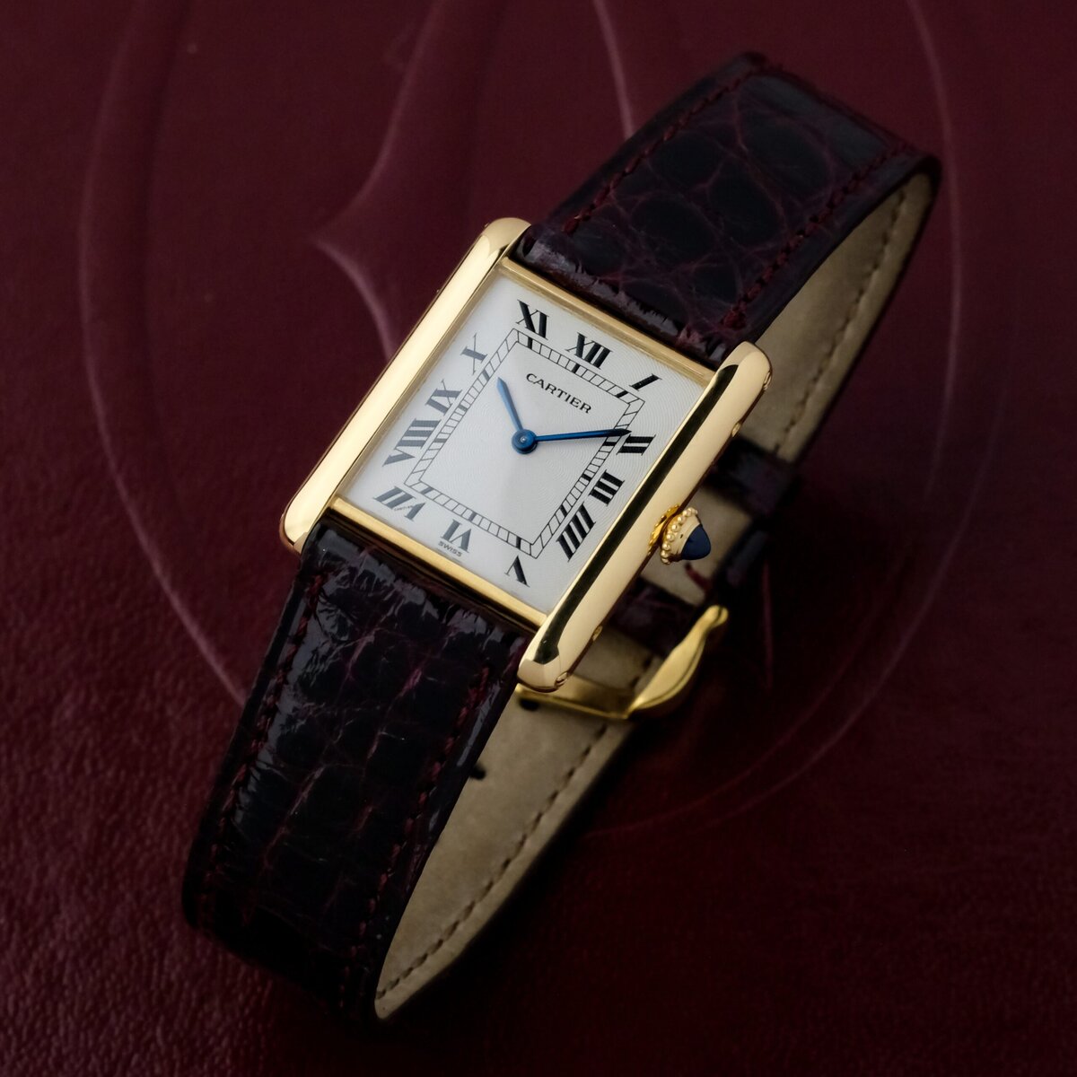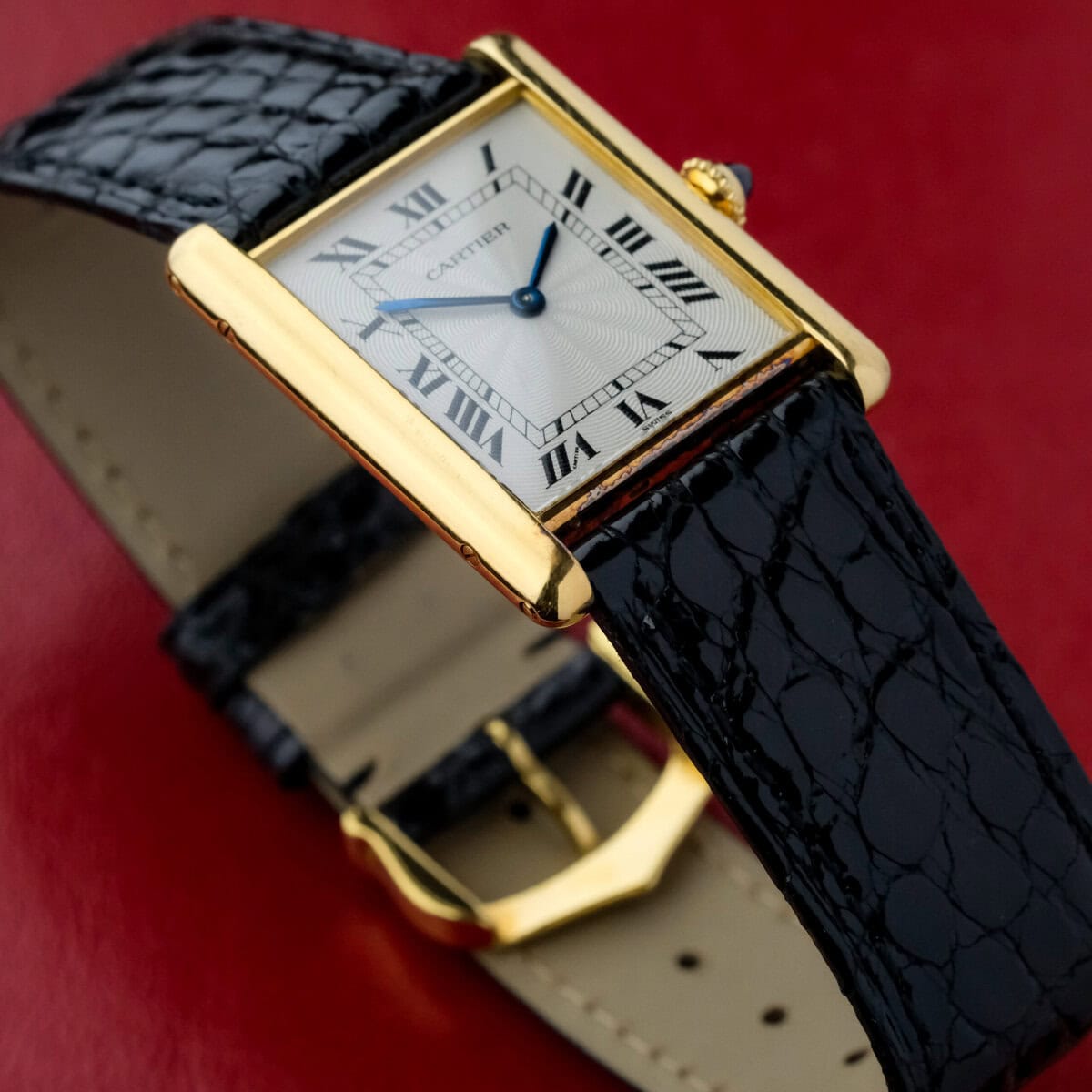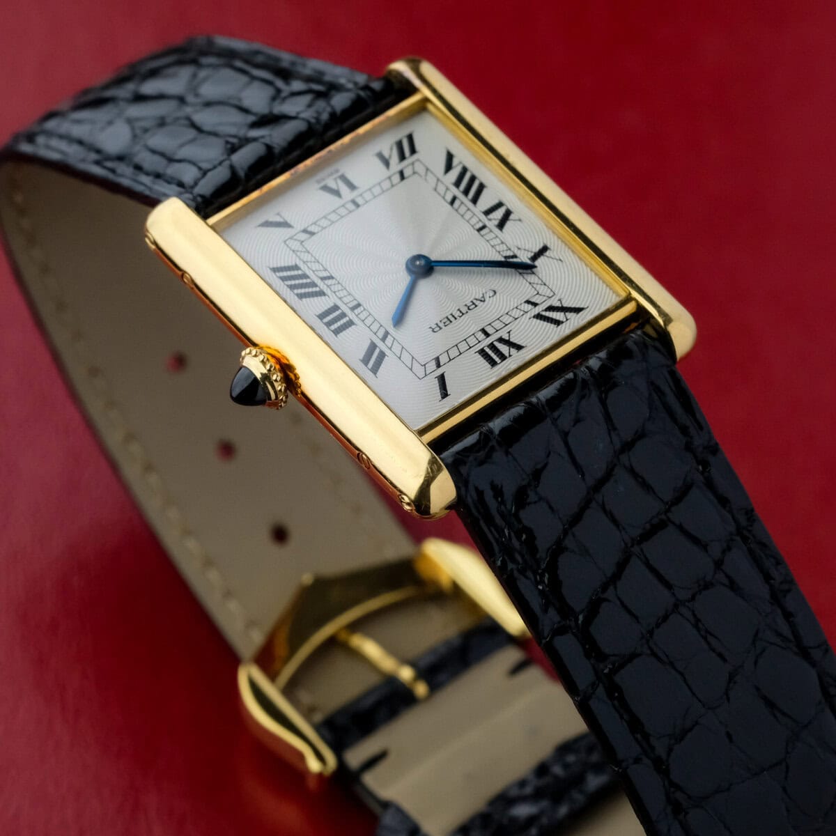 Das guillochierte Zifferblatt ist in hervorragendem Zustand und zeigt die für Cartier charakteristischen römischen Ziffern, die gebläuten Stahlzeiger und die Minutenzählung mit bemerkenswerter Klarheit. Das Uhrwerk mit Handaufzug bewahrt den Charme der traditionellen Uhrmacherkunst und das schlanke Profil, das die Linie Extra Plate auszeichnet, und macht sie zu einer diskreten und zugleich raffinierten Wahl.