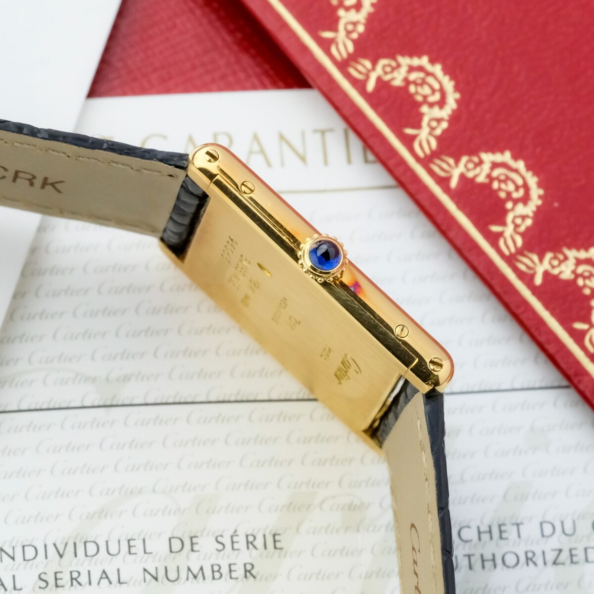 Diese Uhr wird mit geöffneten Papieren und ihrer Cartier-Box angeboten. Sie ist ein begehrenswertes und vollständiges Exemplar der Tank Louis in einem klassischen großen Format, das weiterhin den Ruf von Cartier für raffiniertes Design verkörpert.