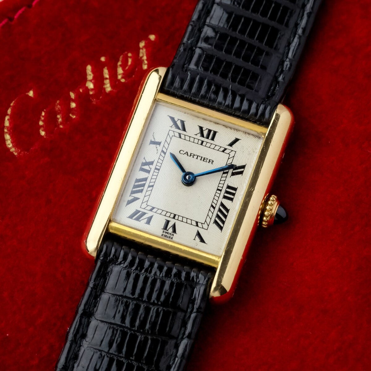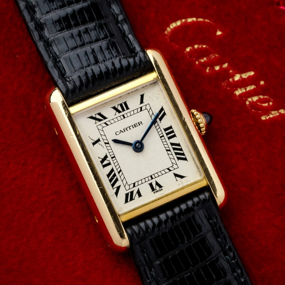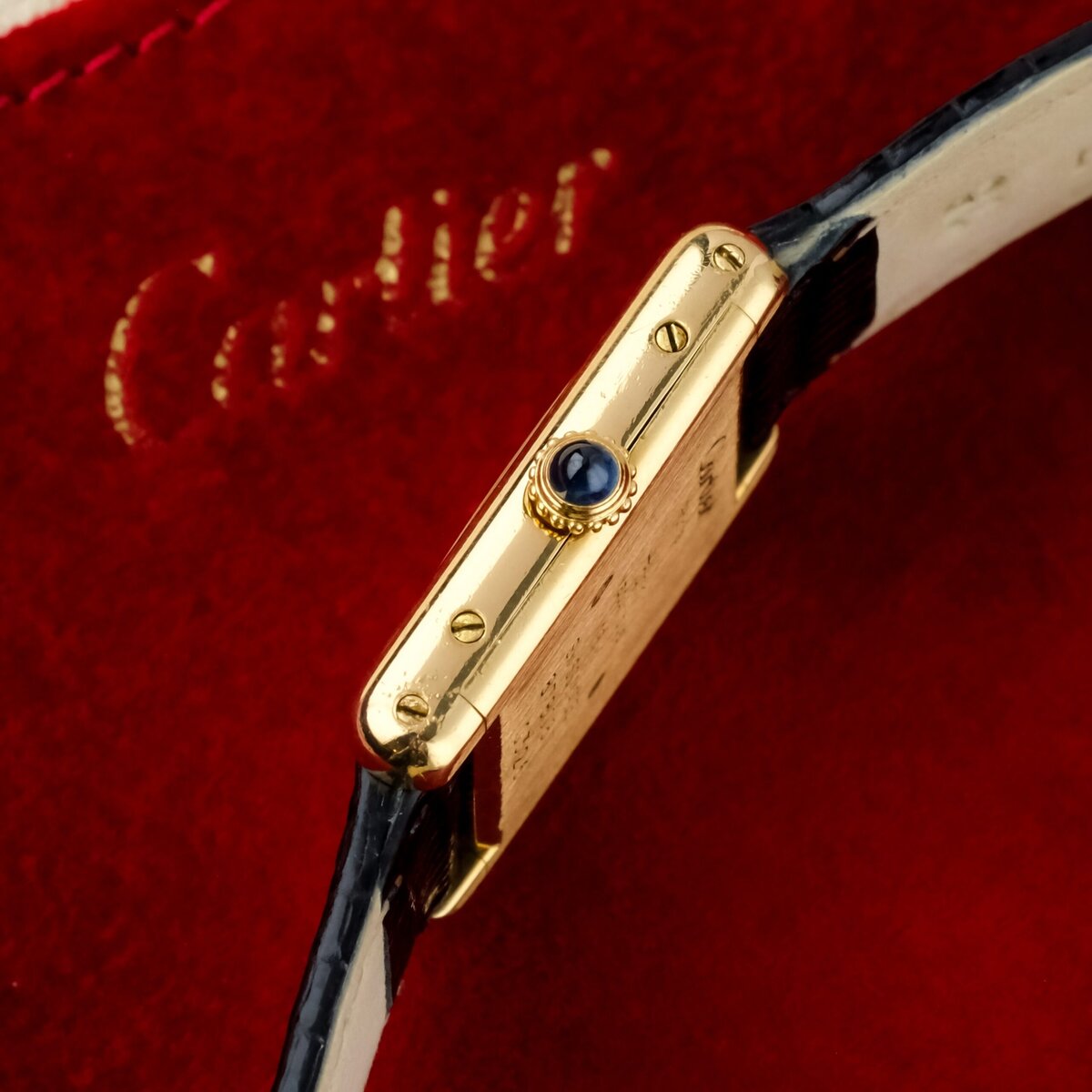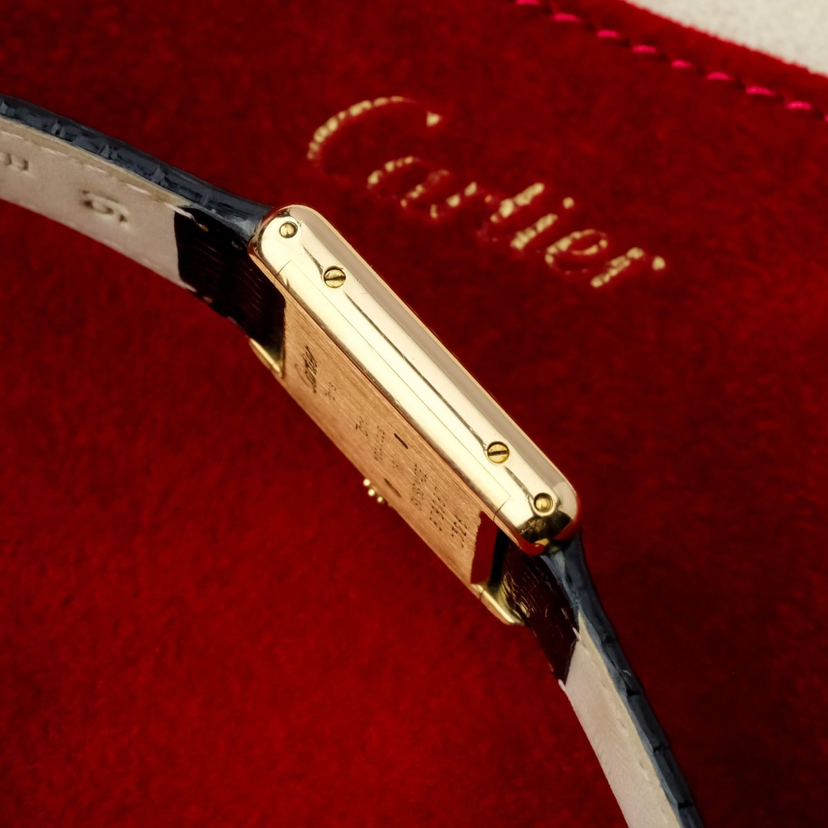 Die Uhr verfügt über ein guillochiertes Zifferblatt mit leichten Gebrauchsspuren, die bei näherer Betrachtung sichtbar sind, aber insgesamt sauber und attraktiv bleiben. Das Gehäuse ist gut erhalten, hat eine gleichmäßige Oberfläche und eine korrekte Form. Es ist mit einer vergoldeten Dornschließe ausgestattet, die nicht von Cartier stammt.