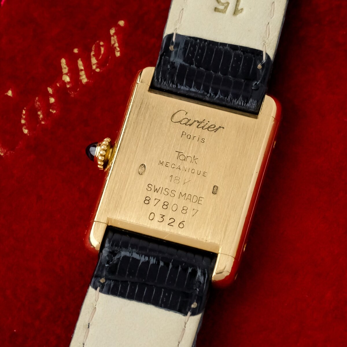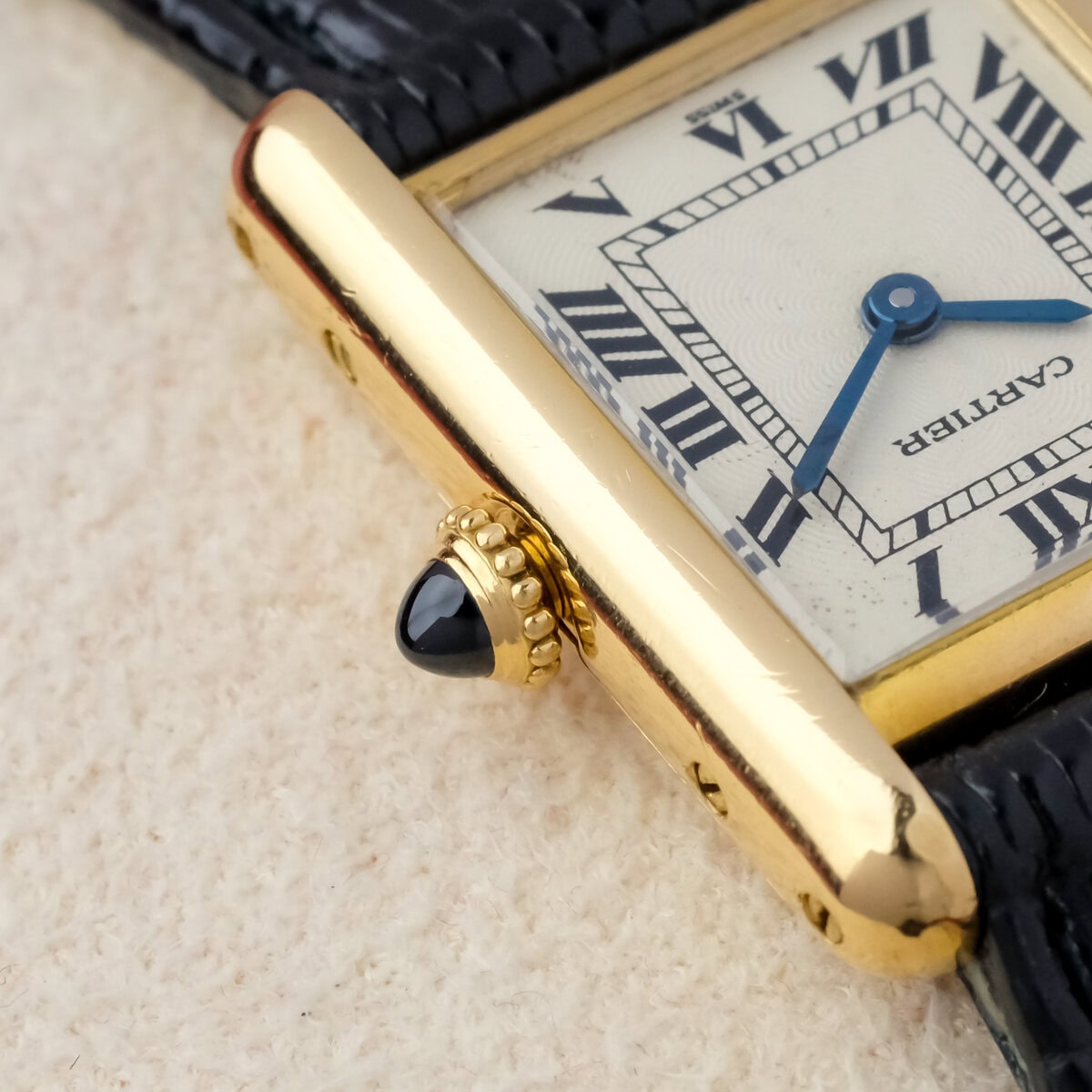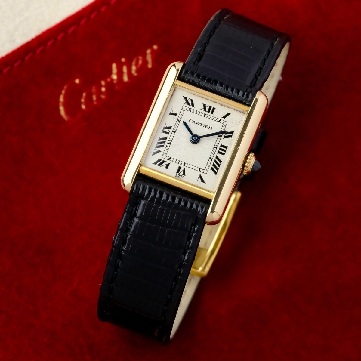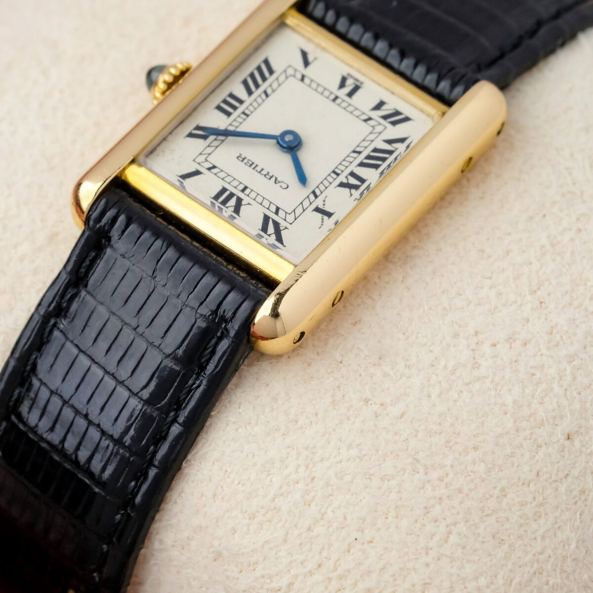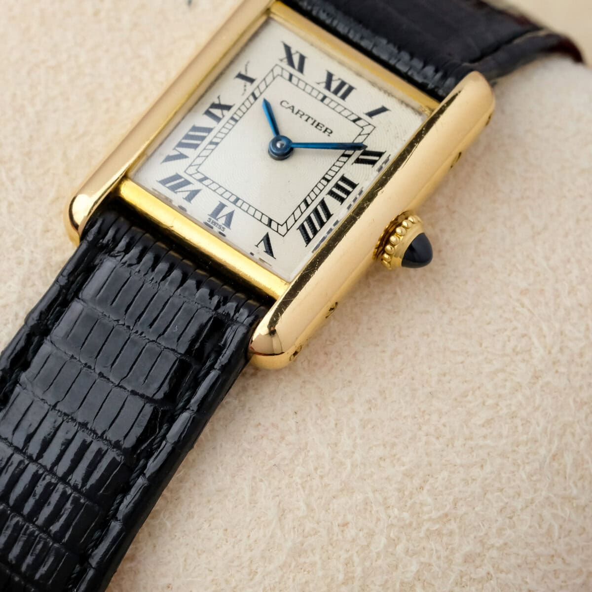 Die Uhr verfügt über ein guillochiertes Zifferblatt mit leichten Gebrauchsspuren, die bei näherer Betrachtung sichtbar sind, aber insgesamt sauber und attraktiv bleiben. Das Gehäuse ist gut erhalten, hat eine gleichmäßige Oberfläche und eine korrekte Form. Es ist mit einer vergoldeten Dornschließe ausgestattet, die nicht von Cartier stammt.