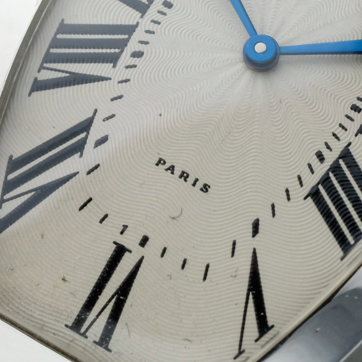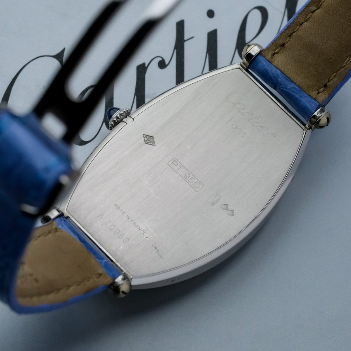 Powered by a hand wound movement, the watch retains the slim and curved profile that defines the Tonneau line, offering exceptional comfort and timeless sophistication. The silvered dial is beautifully preserved, showing the signature Cartier Roman numerals and blued steel hands in superb condition.