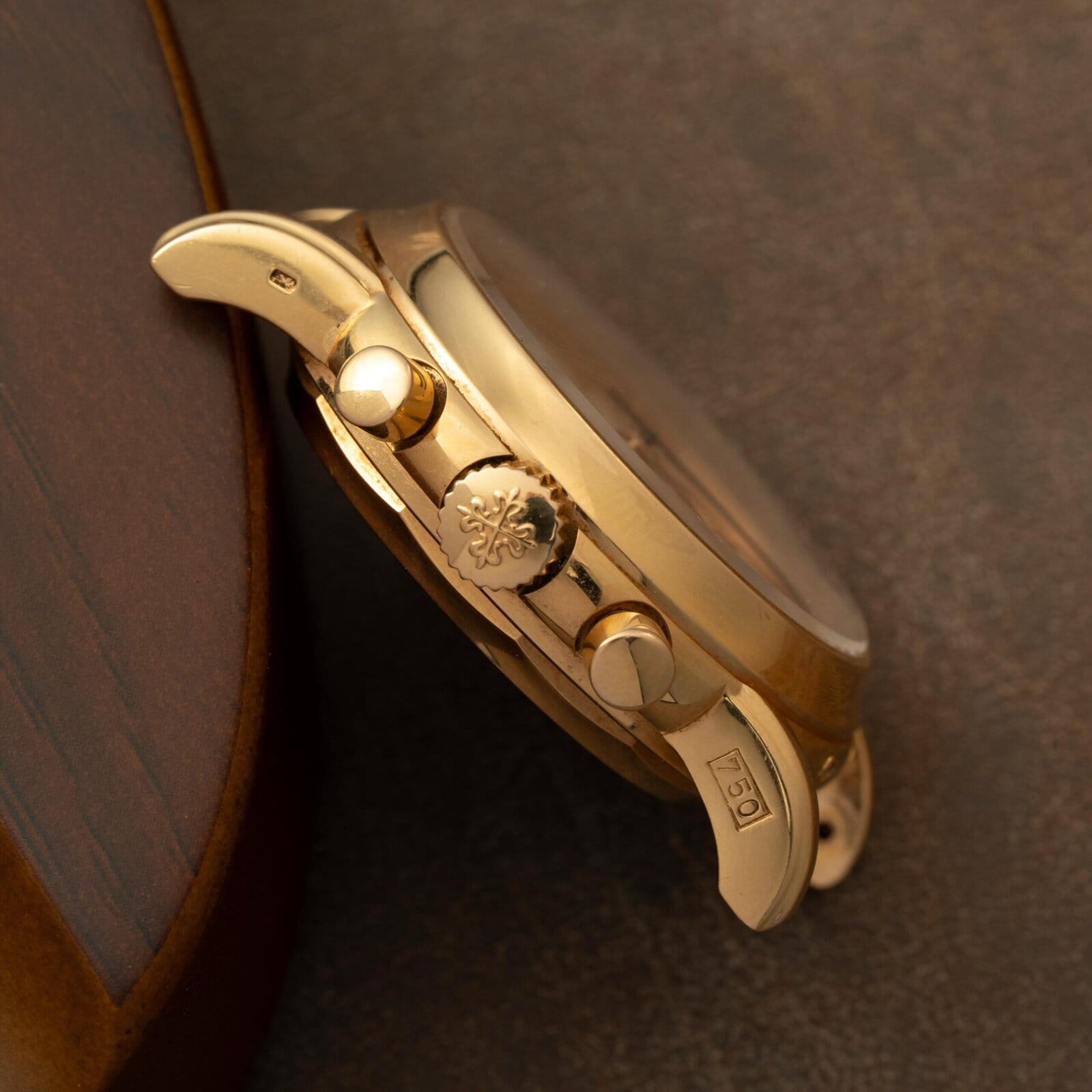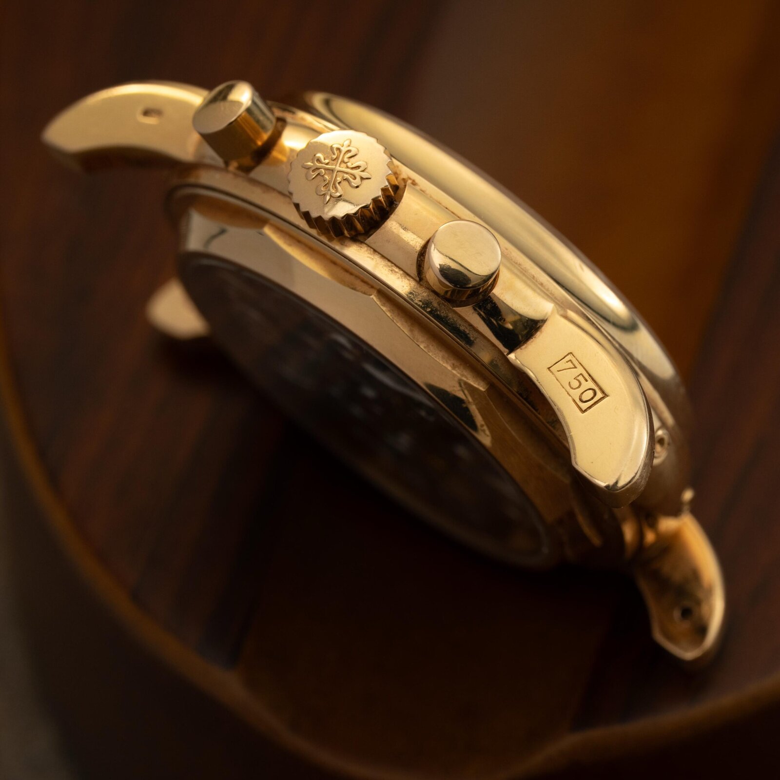 Datiert auf 1990 und begleitet von den Originalpapieren, zeichnet sich diese Uhr als absolute Rarität aus. Eine sehr begehrte 3971R in außergewöhnlichem Zustand, mit starken Punzen und voller mechanischer Bedeutung innerhalb der großen Komplikationslinie von Patek Philippe.
