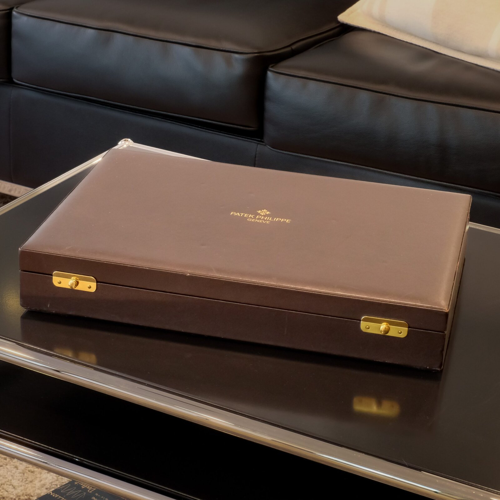 Der Zustand zeigt leichte Gebrauchsspuren, die dem Alter entsprechen, einschließlich leichter Eindrücke auf dem Außenleder, während sie voll funktionsfähig und optisch ansprechend bleibt. Eine raffinierte und sammelwürdige Patek Philippe Aufbewahrungslösung.