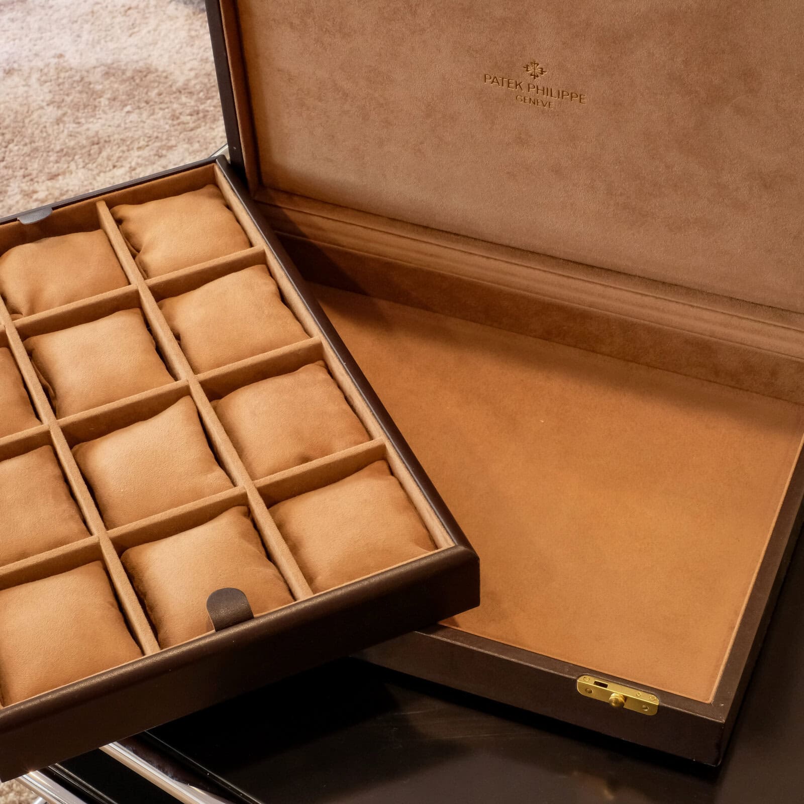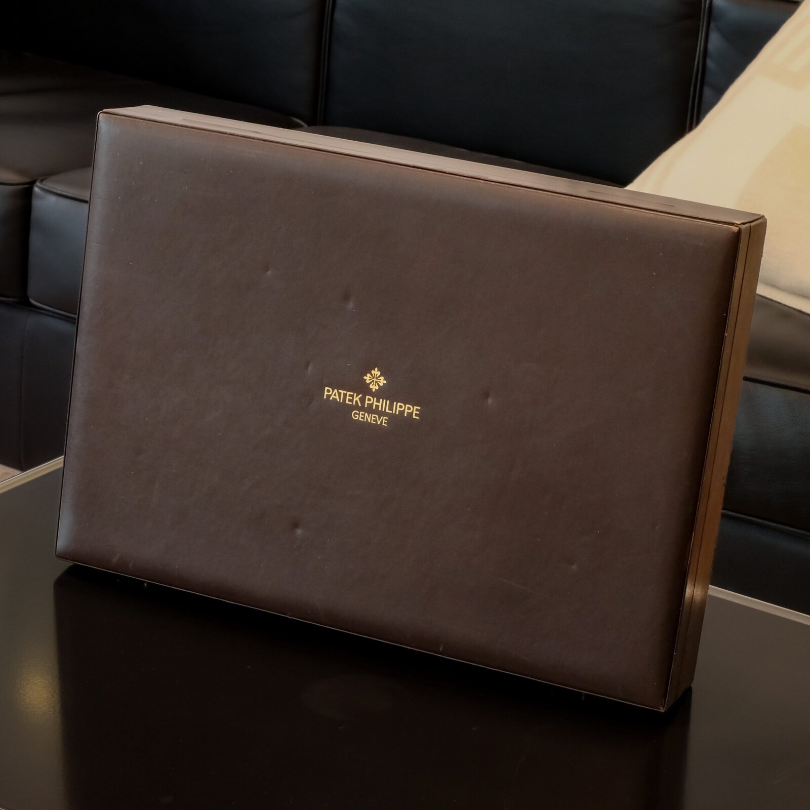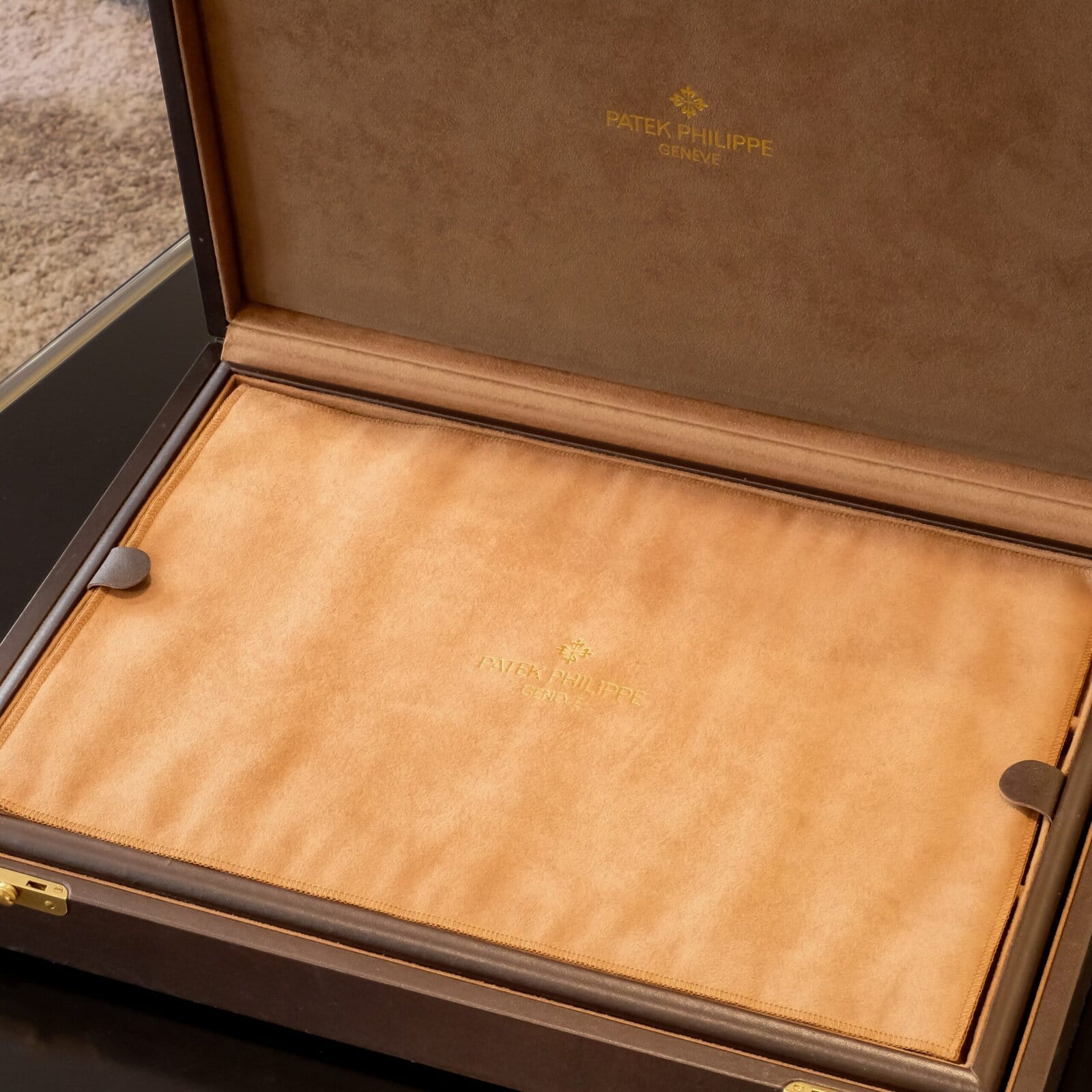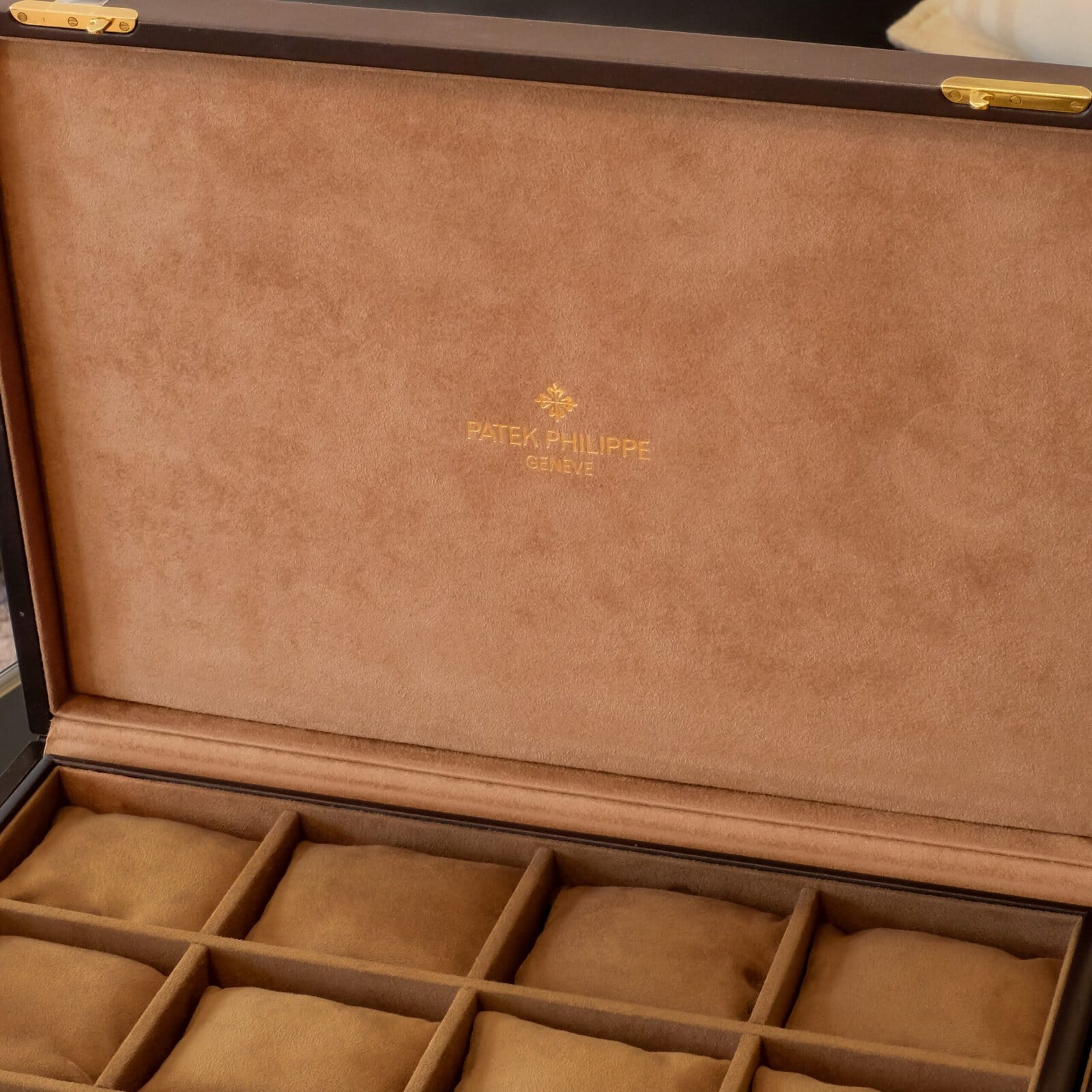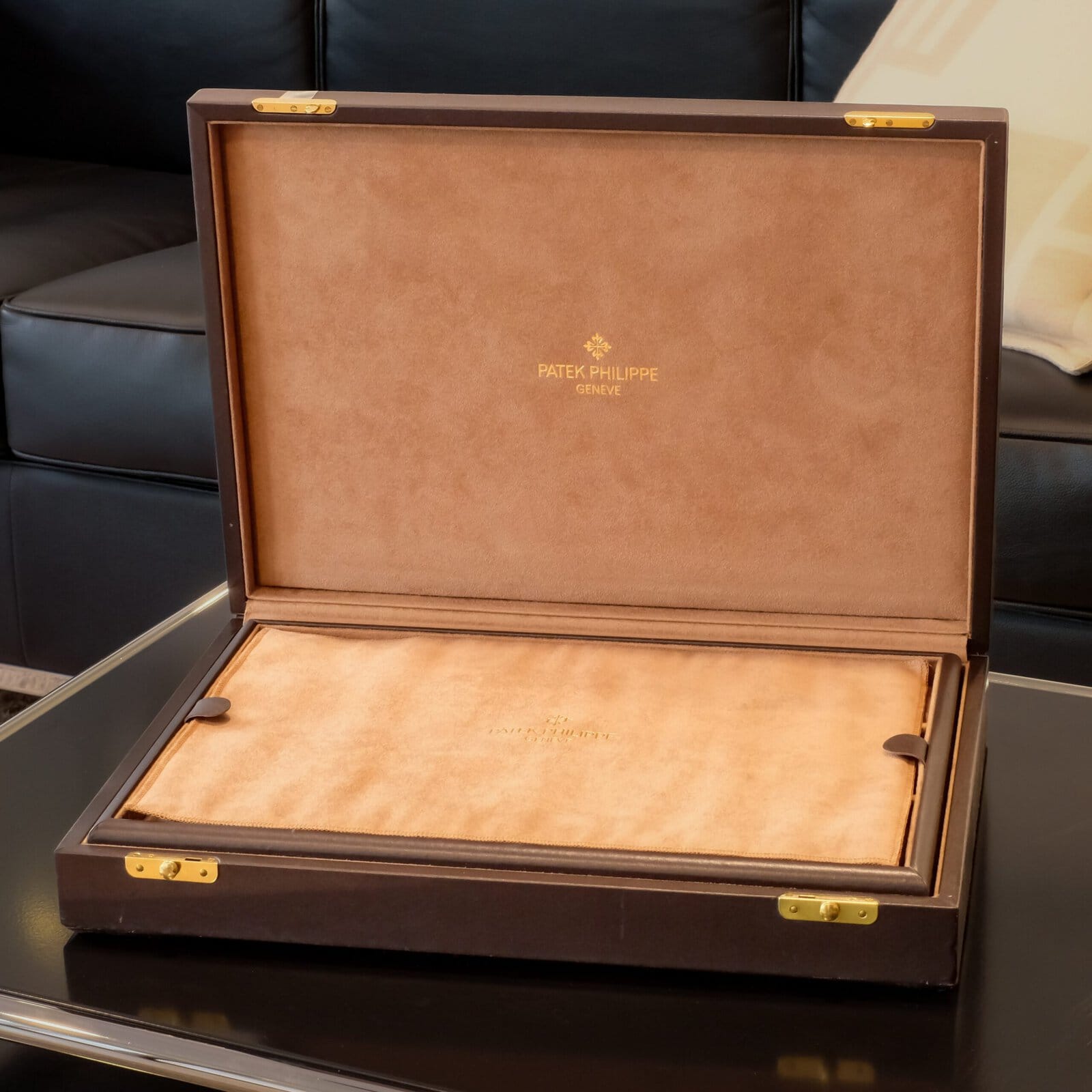 Die Verarbeitung ist von sehr hohem Standard, mit weichem Innenfutter und präziser Konstruktion, die typisch für Patek Philippe-Zubehör ist. Die Box bietet ein großes Fassungsvermögen und eine elegante Präsentation, wodurch sie sowohl für die Aufbewahrung als auch für die Präsentation ideal ist.