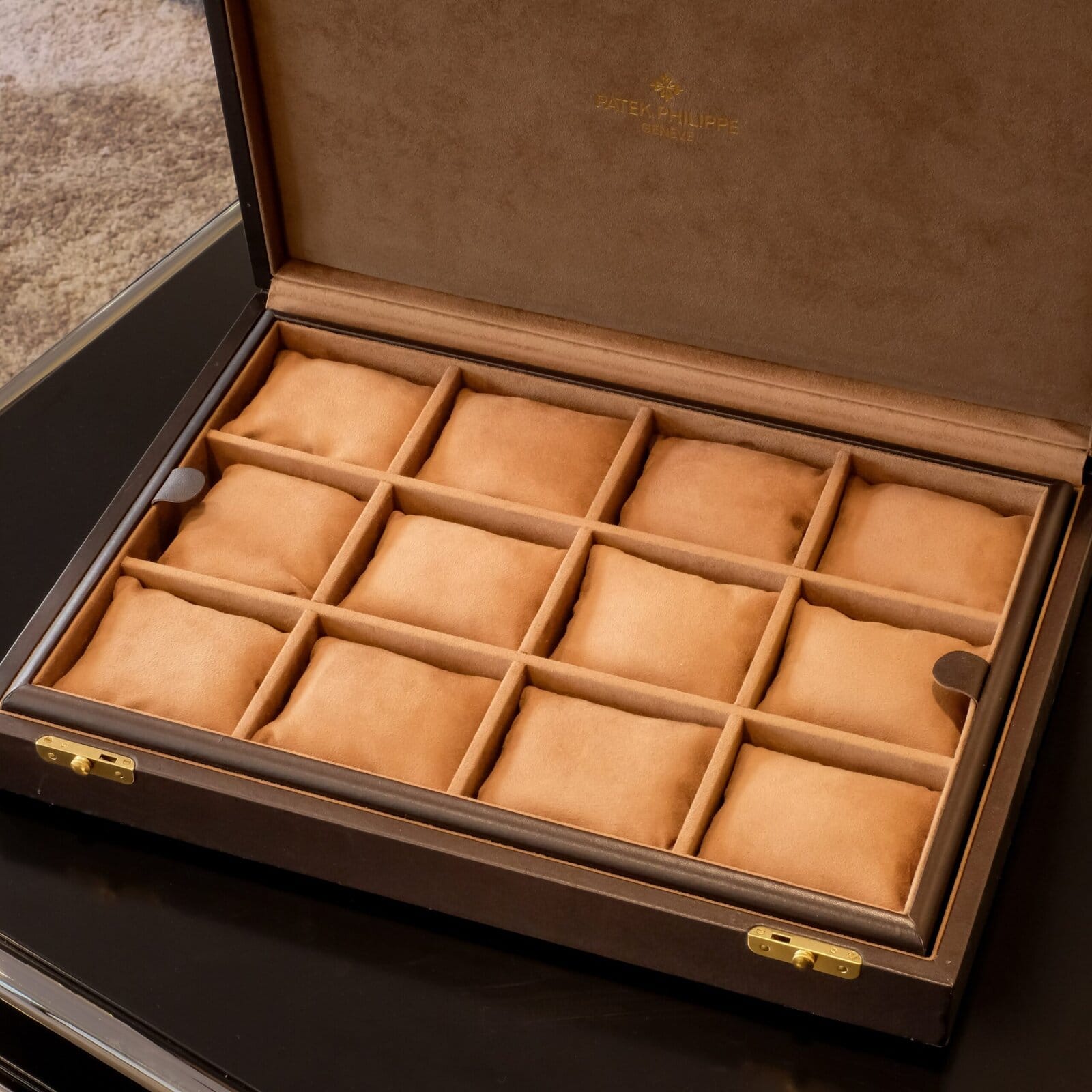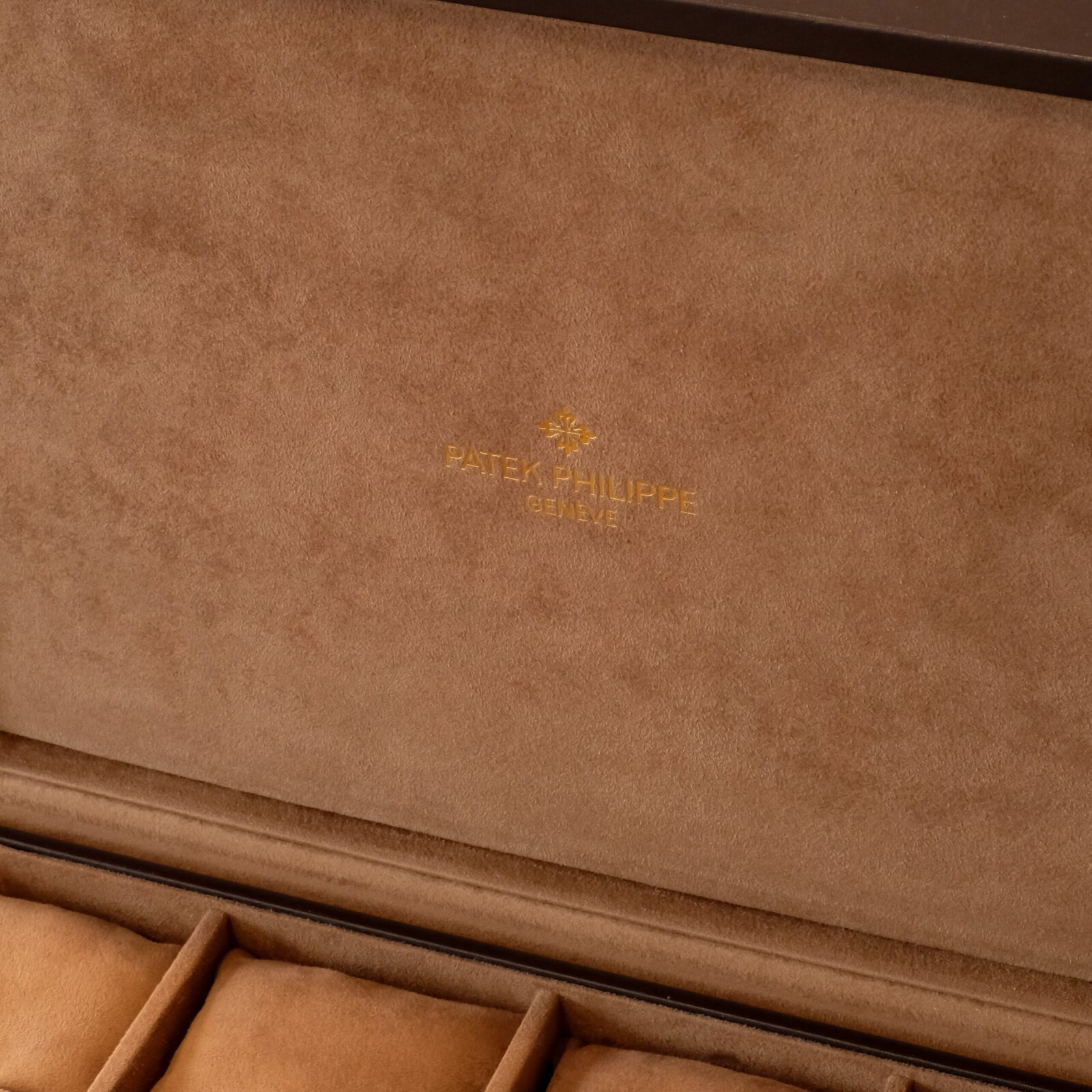Patek Philippe Sammleruhrenkoffer aus dunkelbraunem Leder mit geprägtem Patek Philippe Genève-Logo auf dem Deckel. Diese hochwertige Aufbewahrungsbox verfügt über einen Innenraum aus warmem Wildleder mit einem herausnehmbaren Fach, in dem mehrere einzelne Uhrenkissen untergebracht sind, die eine geordnete und sichere Aufbewahrung ermöglichen.