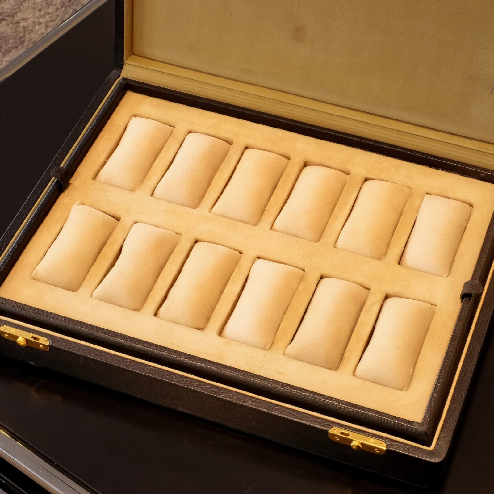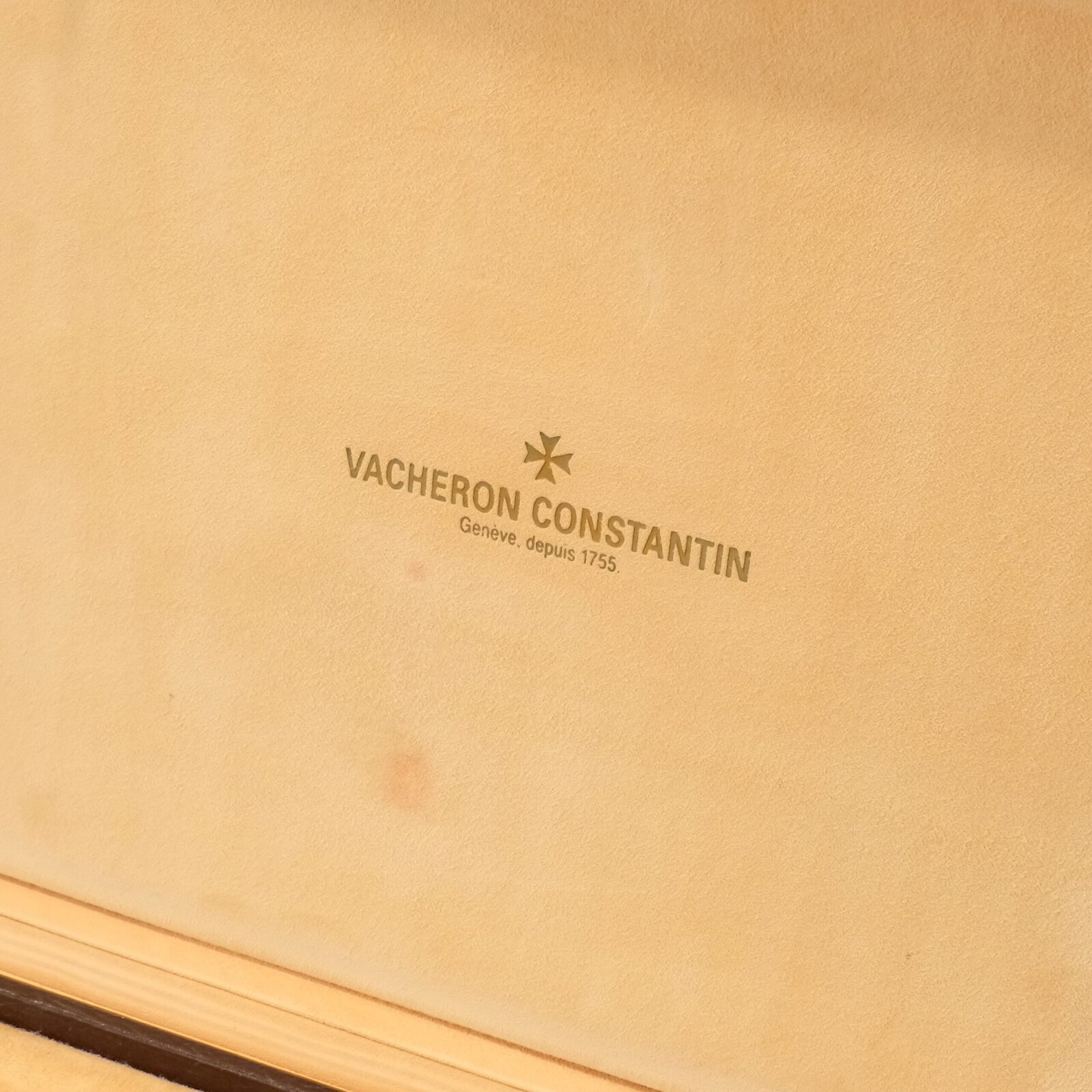 Das Innere ist in einem hellen Ton gehalten, der einen raffinierten Kontrast bietet und die Uhren schön zur Geltung bringt. Die Konstruktion und die Materialien spiegeln die hohe Qualität wider, die man mit Vacheron Constantin-Zubehör aus dieser Zeit verbindet.