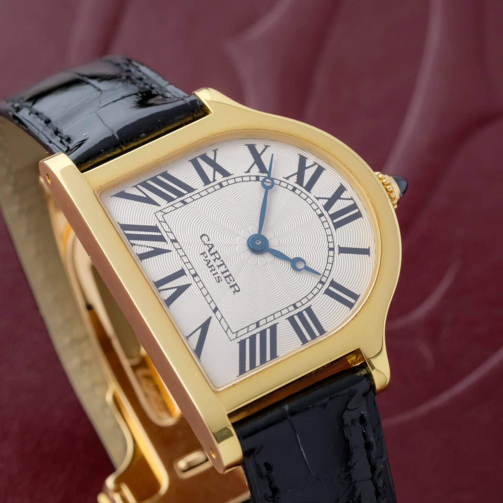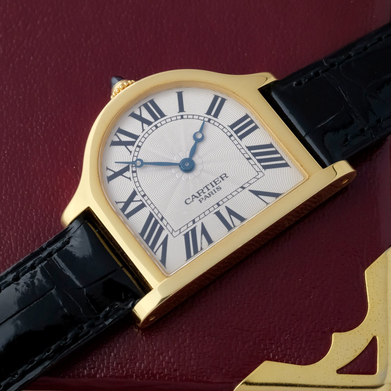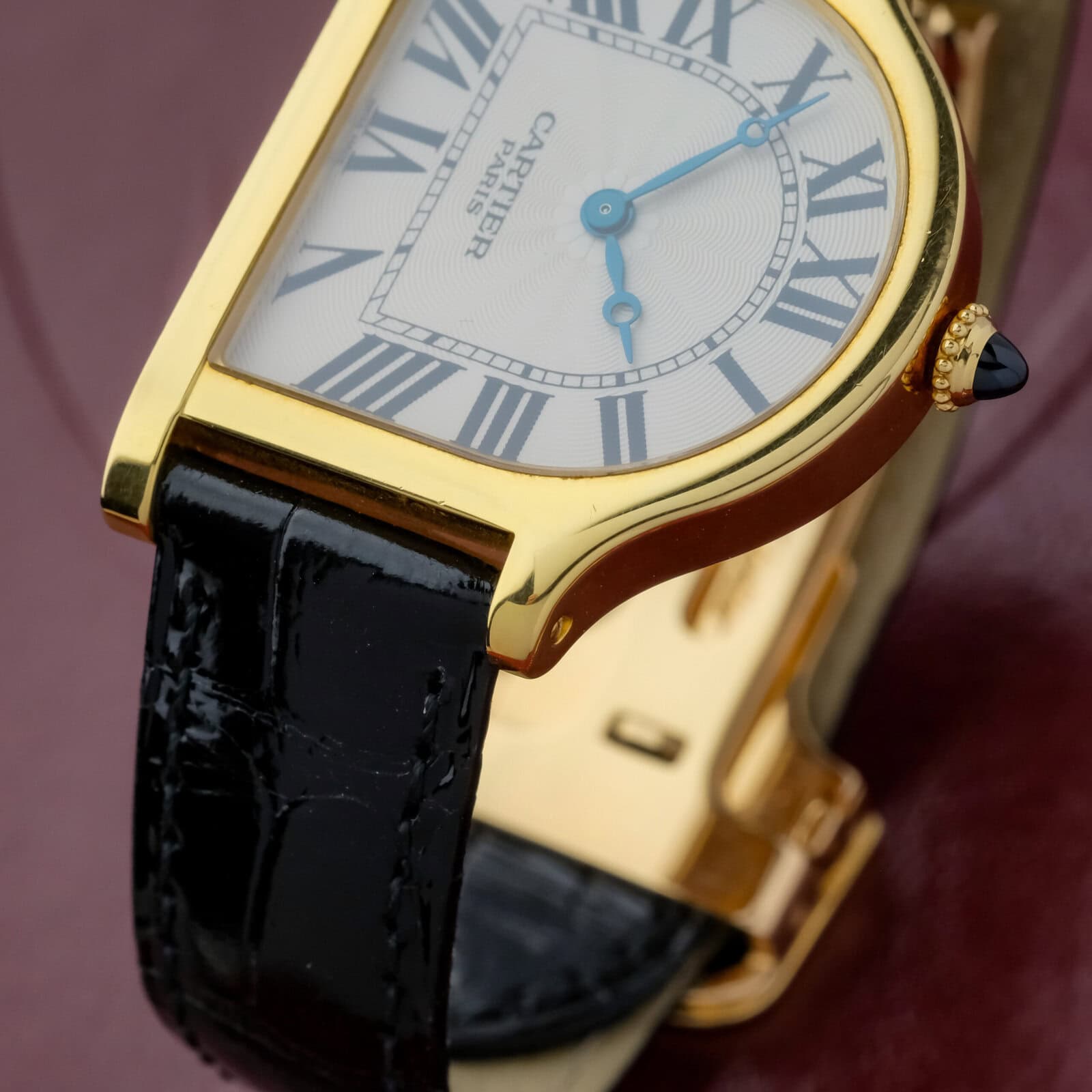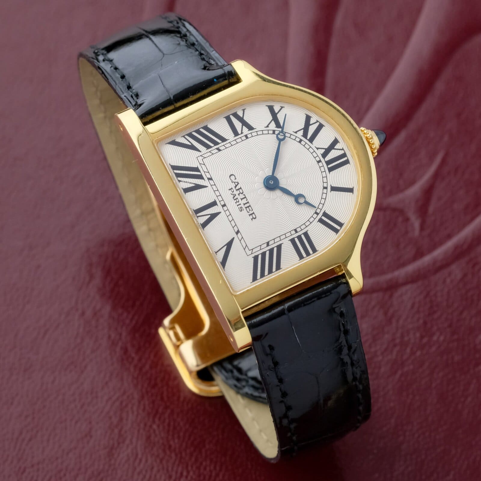 The watch features a beautifully executed guilloché dial with Roman numerals, reflecting Cartier’s classical design language. The distinctive Cloche case shape adds strong character and historical relevance.