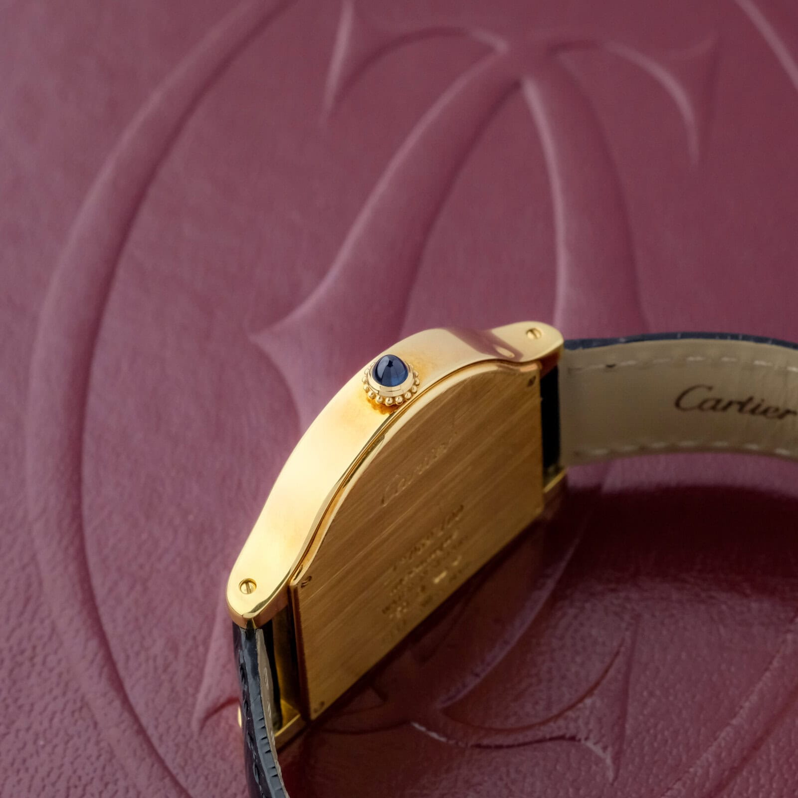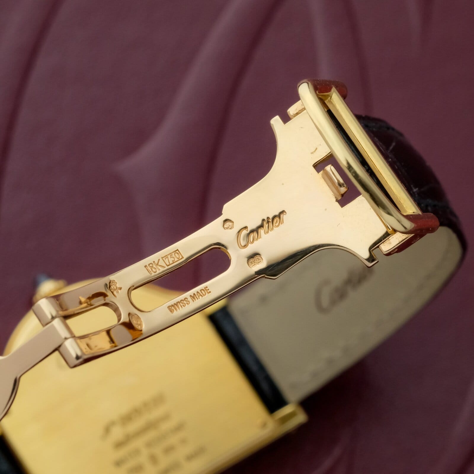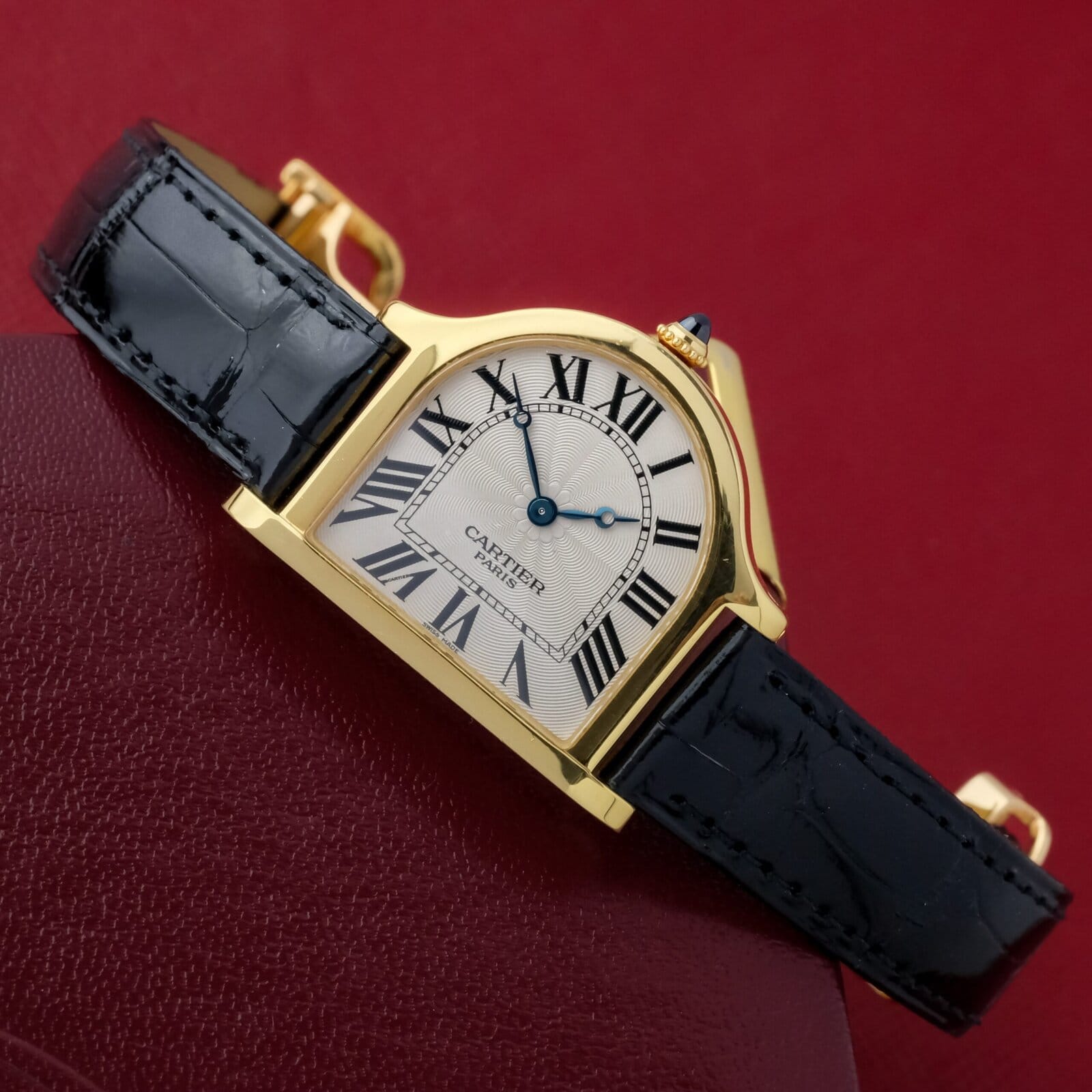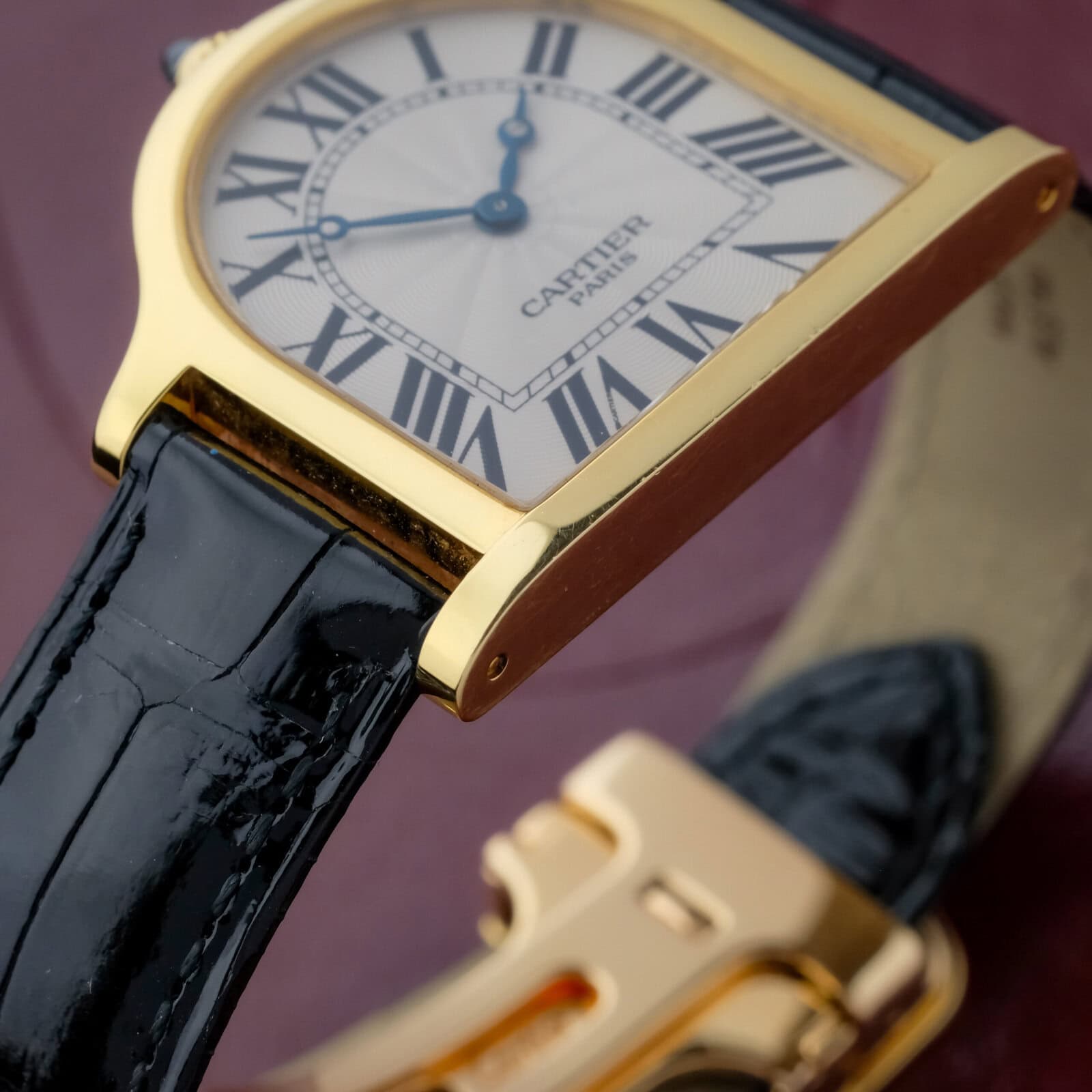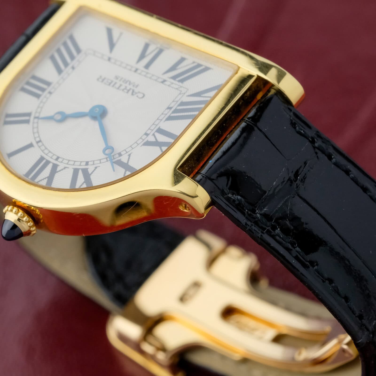 The watch features a beautifully executed guilloché dial with Roman numerals, reflecting Cartier’s classical design language. The distinctive Cloche case shape adds strong character and historical relevance.