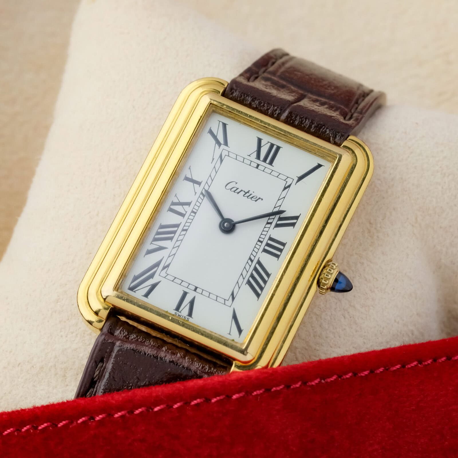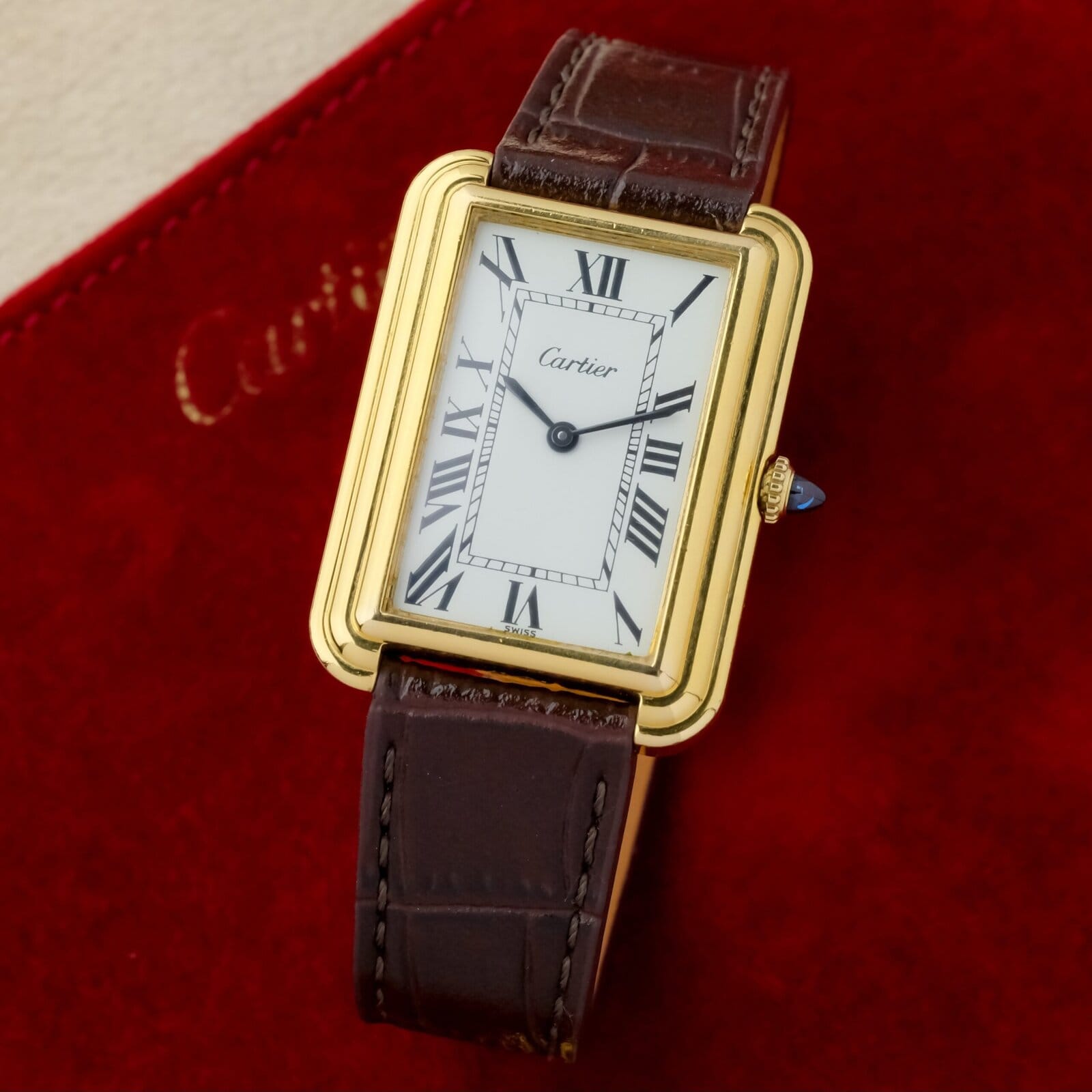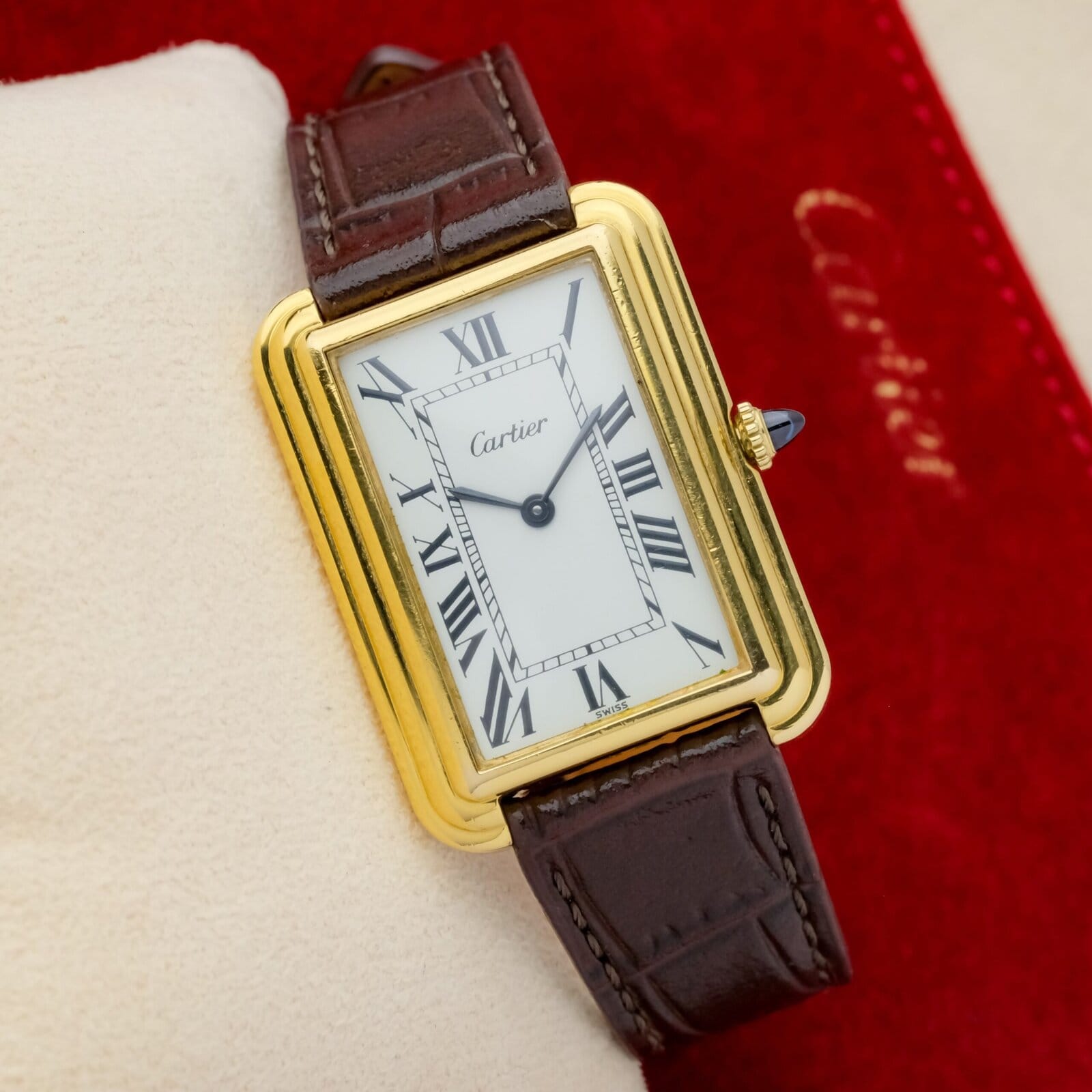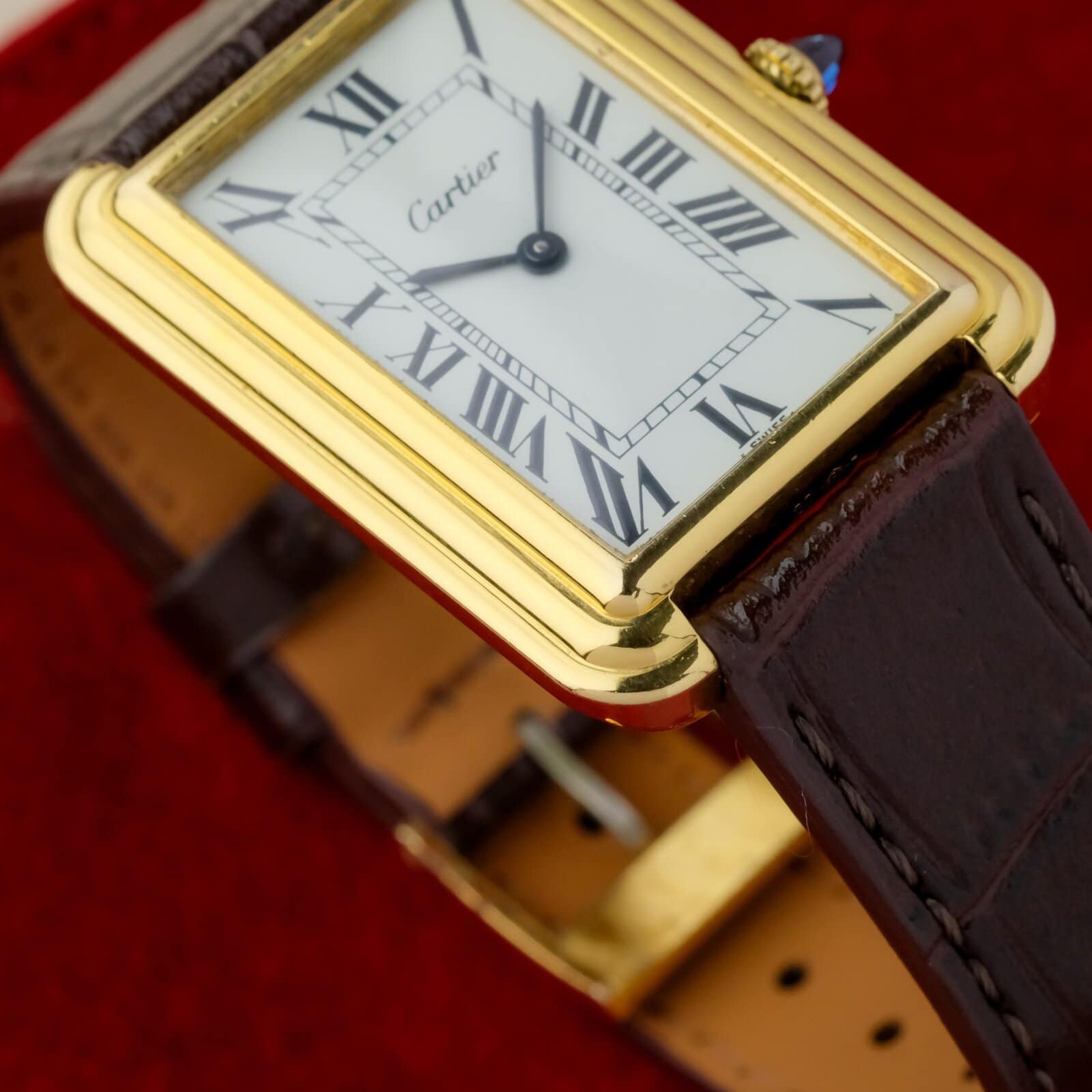 The white dial is clean and well preserved with classic Cartier layout and clear printing. The case is in very good overall condition with light wear consistent with careful use. The watch is fitted with a Cartier gold plated pin buckle, completing the period correct configuration.