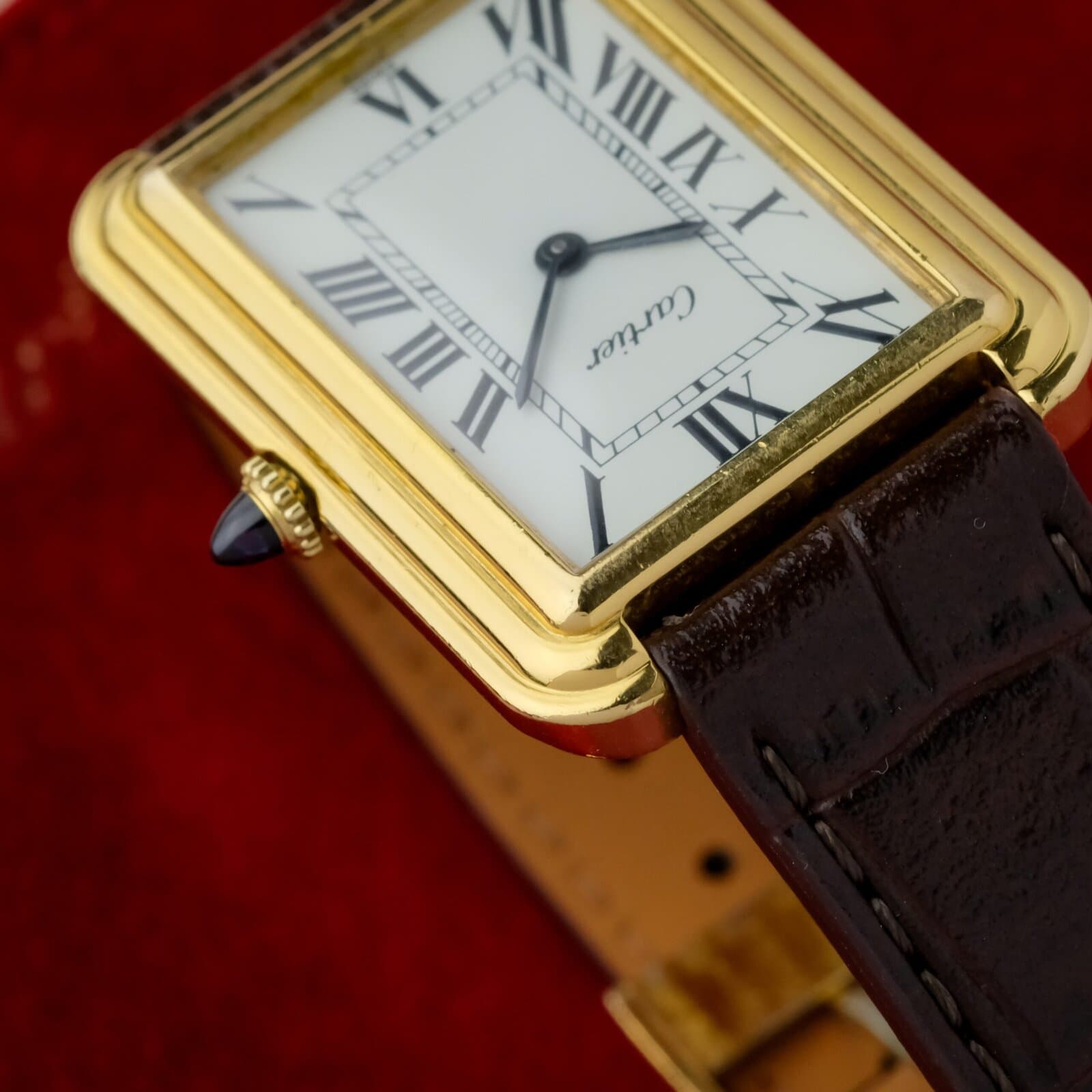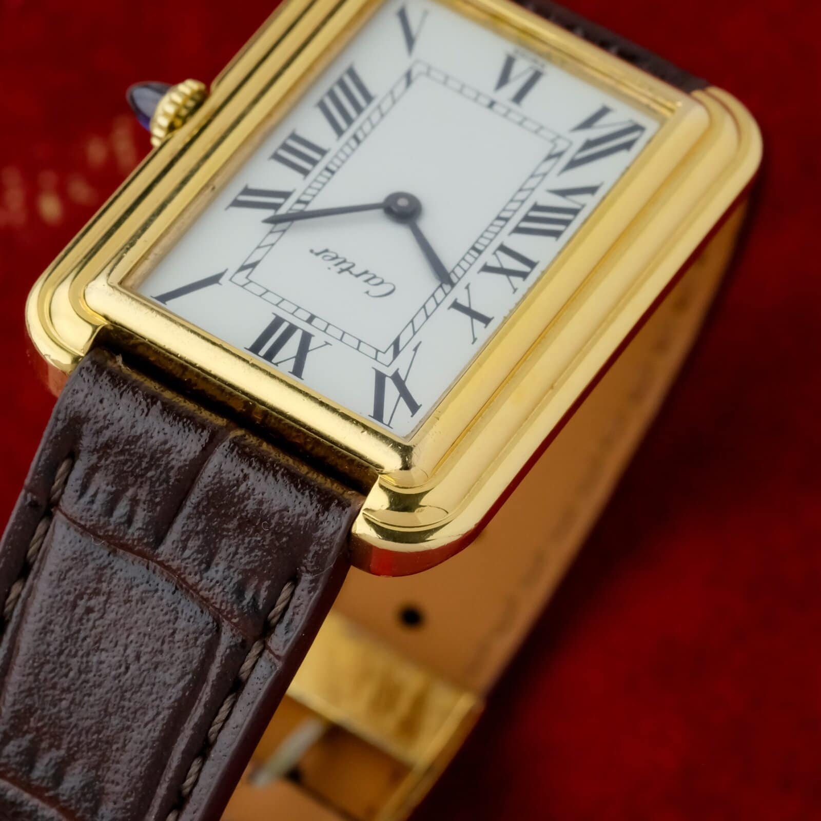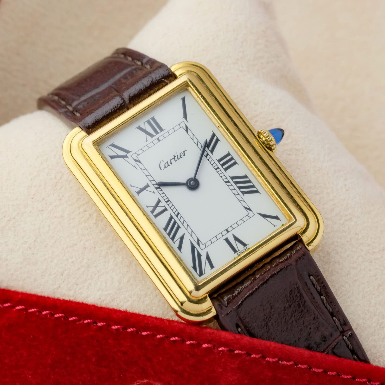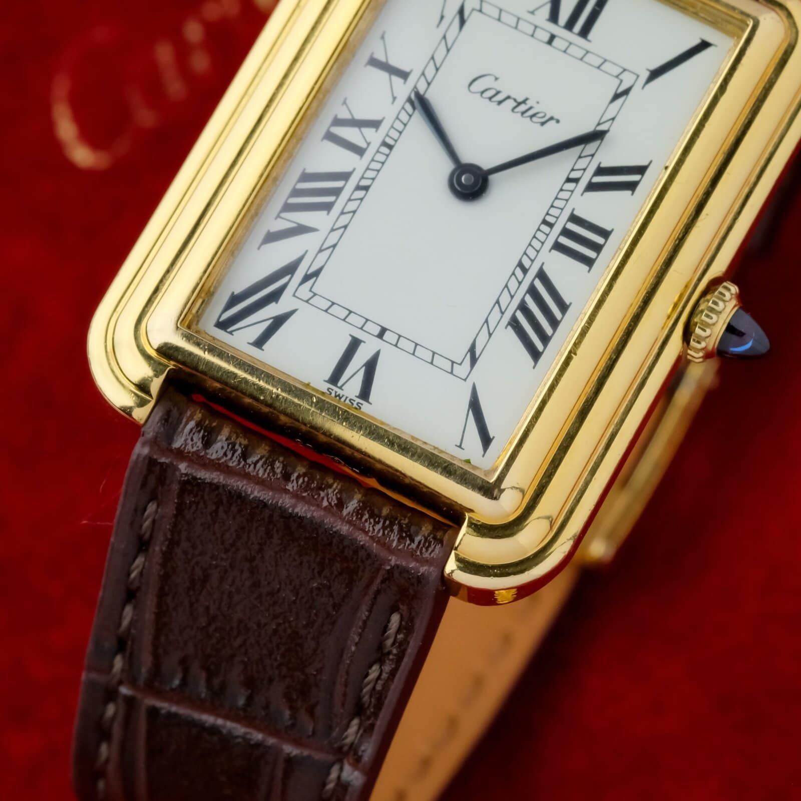 The white dial is clean and well preserved with classic Cartier layout and clear printing. The case is in very good overall condition with light wear consistent with careful use. The watch is fitted with a Cartier gold plated pin buckle, completing the period correct configuration.