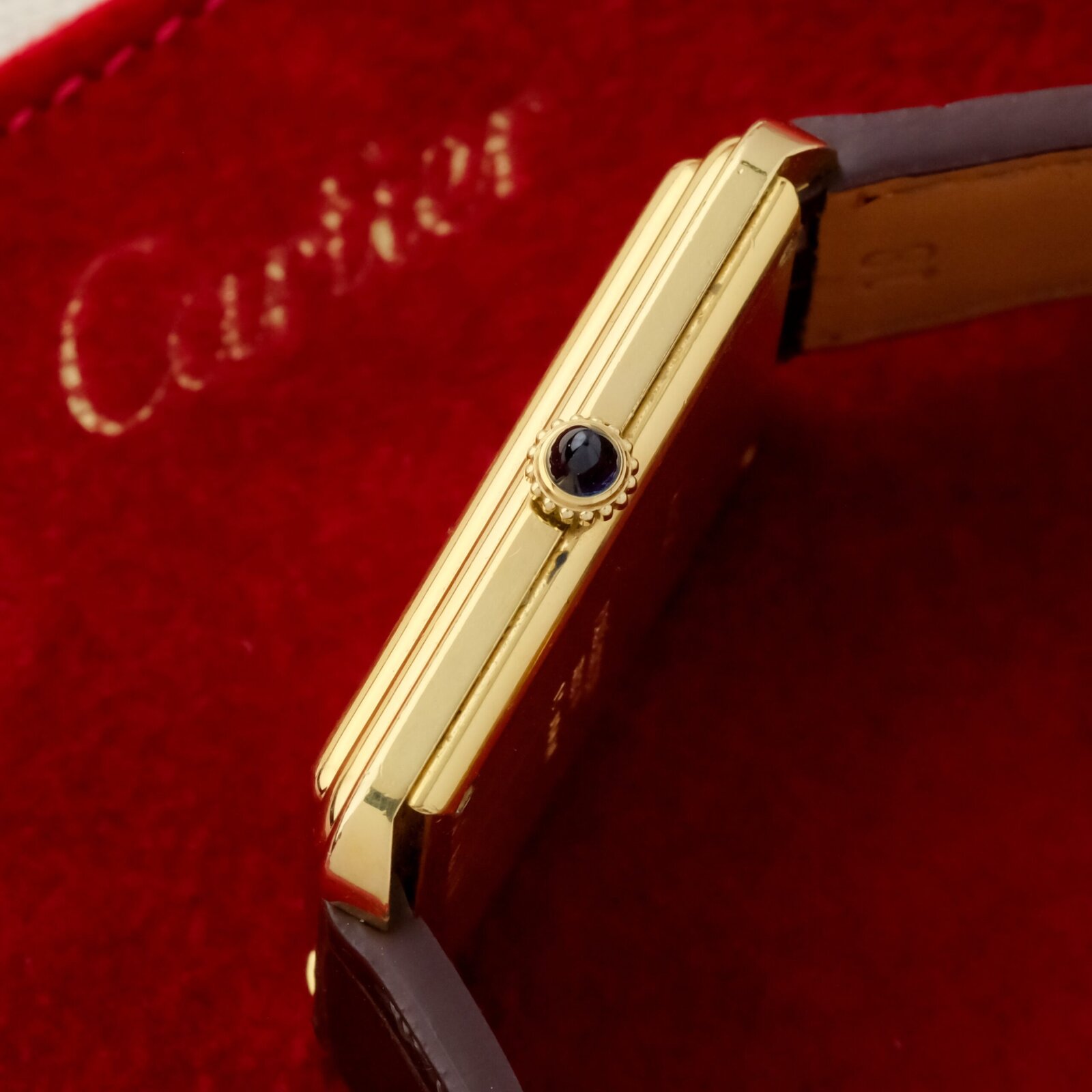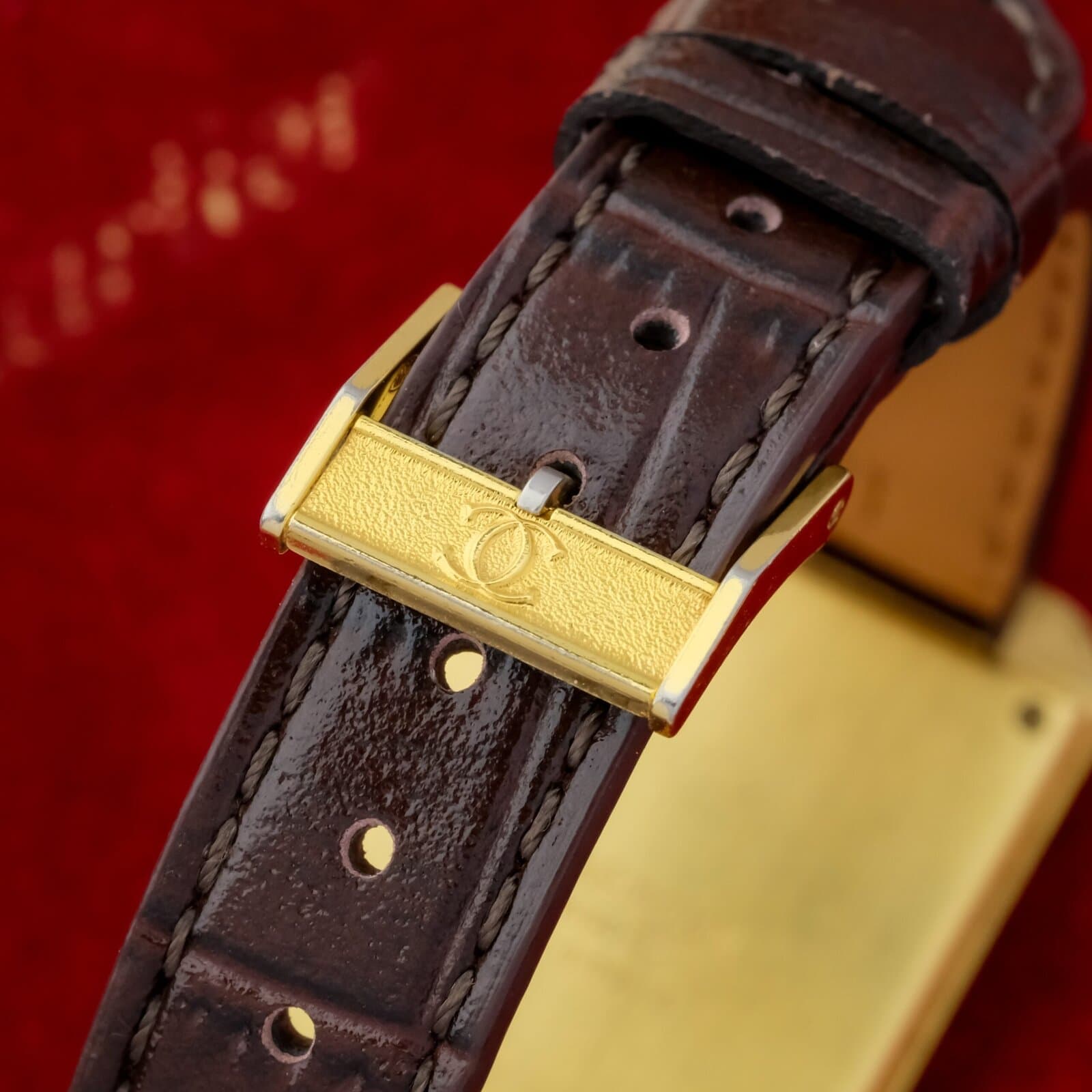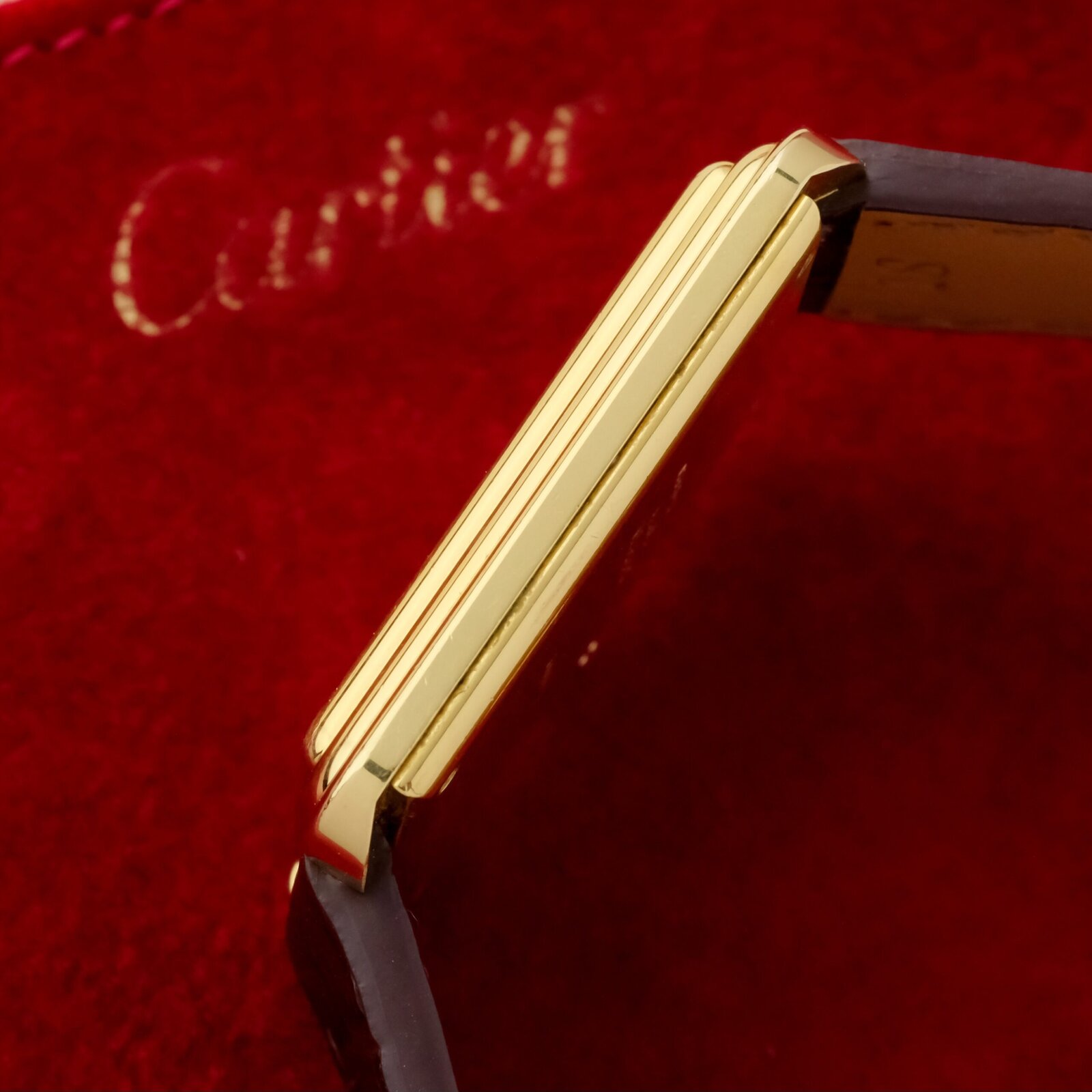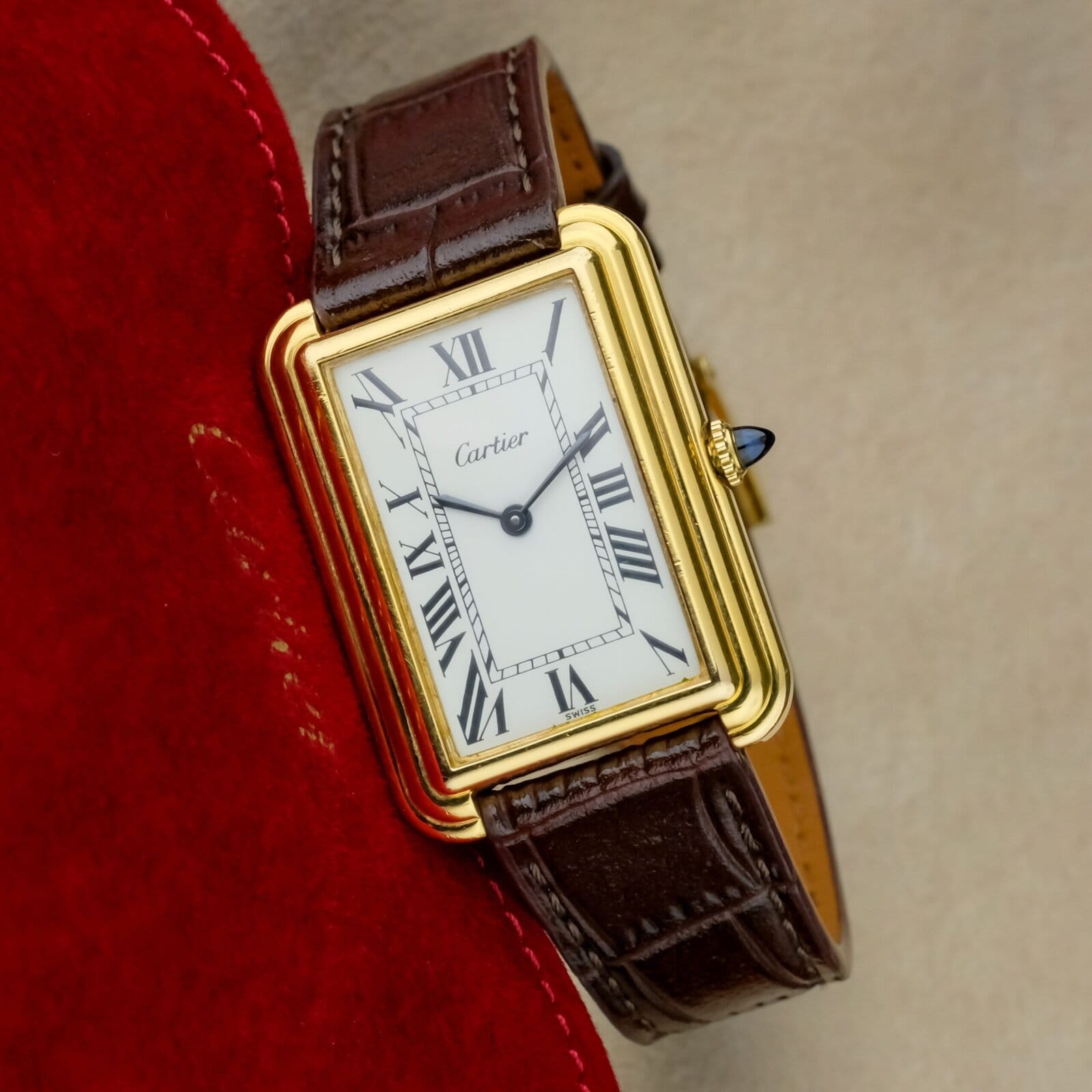 The white dial is clean and well preserved with classic Cartier layout and clear printing. The case is in very good overall condition with light wear consistent with careful use. The watch is fitted with a Cartier gold plated pin buckle, completing the period correct configuration.