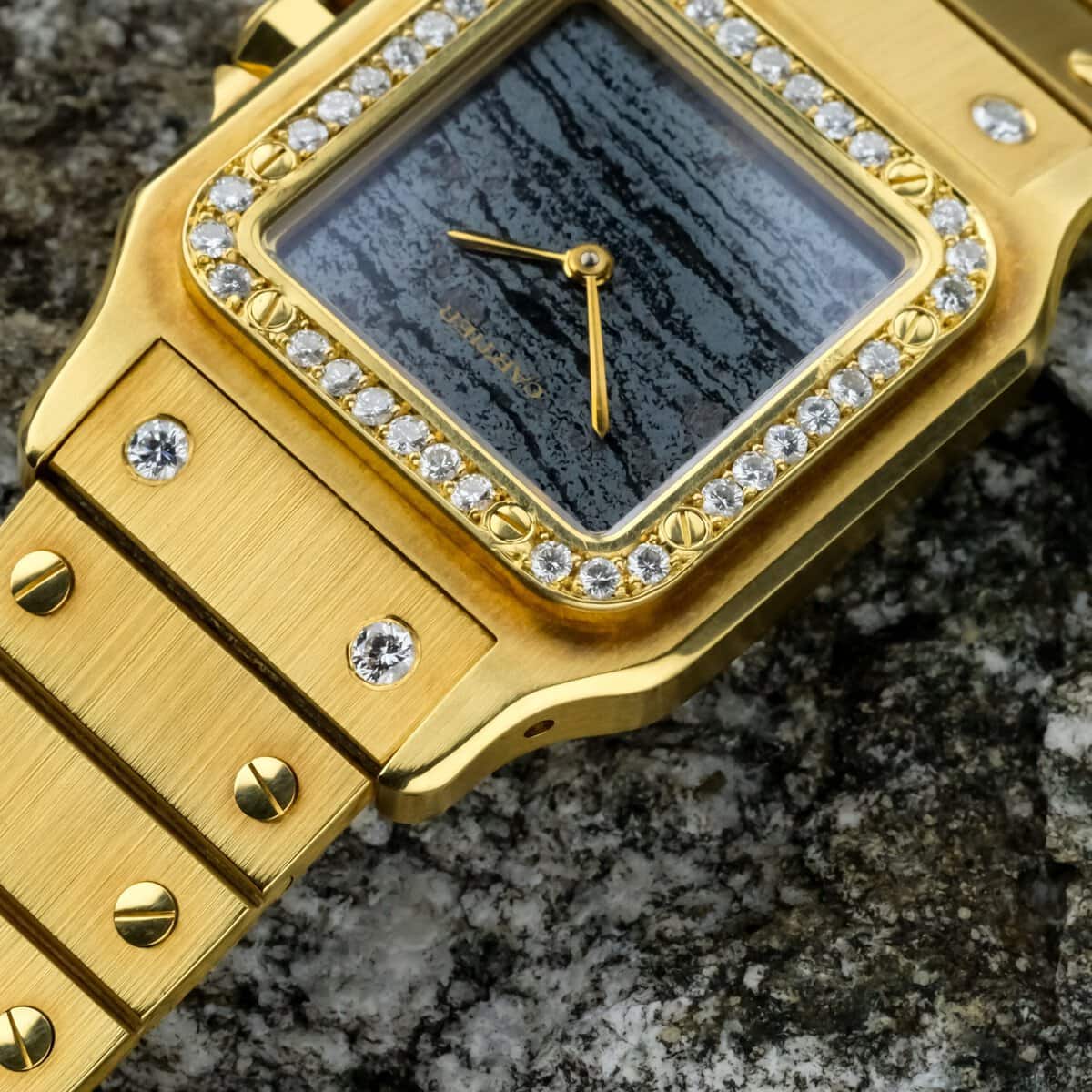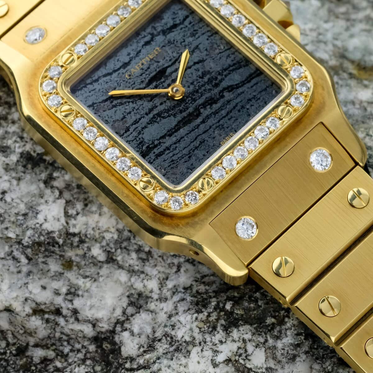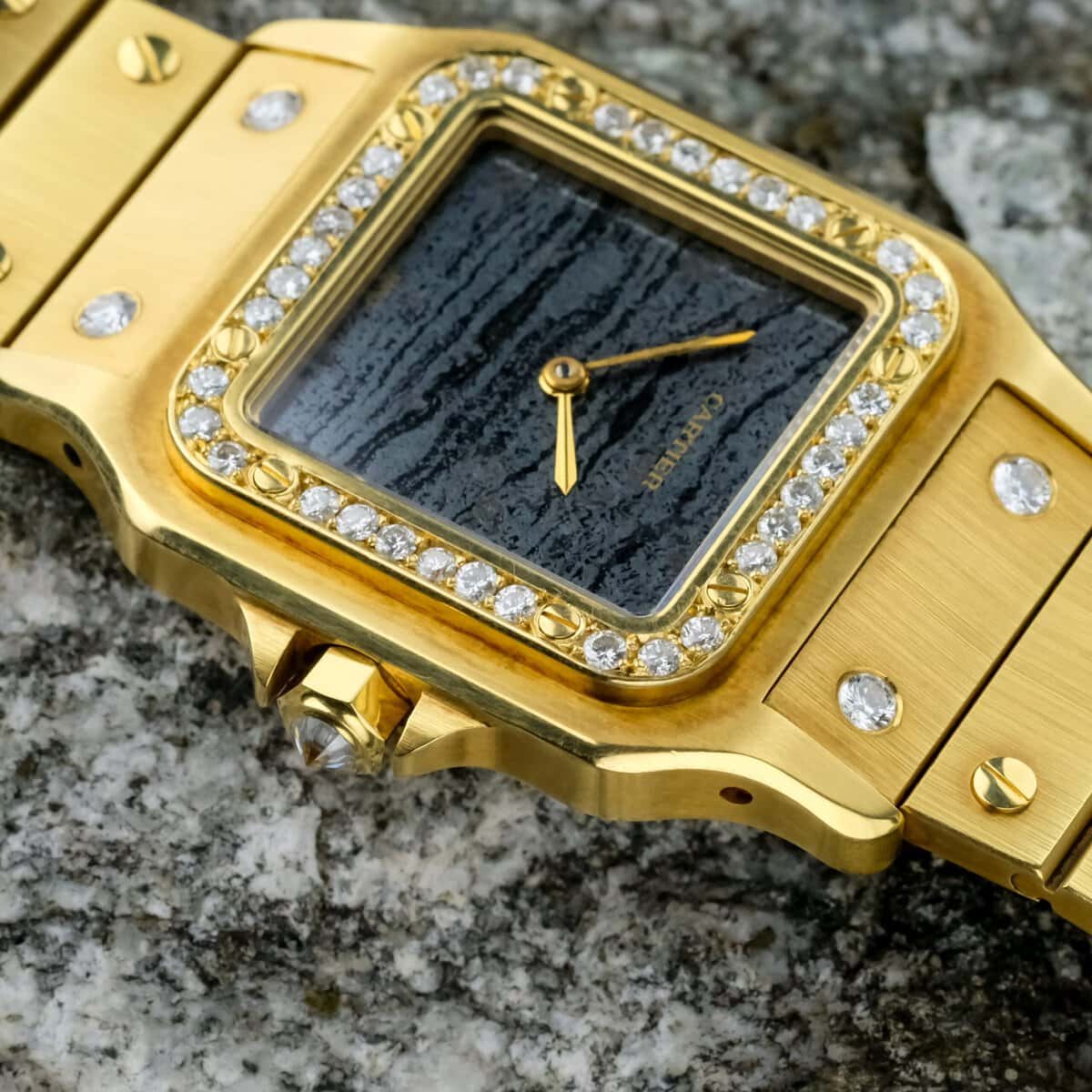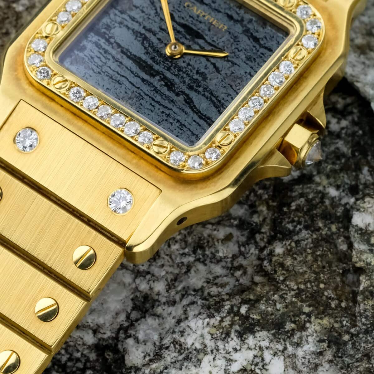 This Cartier Santos Carrée reference 2960 in 18k yellow gold with an exceptionally rare natural stone ferrite dial is truly an unusual find. The dial is in perfect condition with no cracks, maintaining its original deep texture and unique metallic sheen. Ferrite dials are among the rarest configurations for the Carrée line and are highly sought after by collectors.