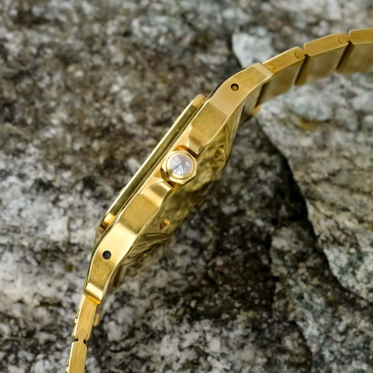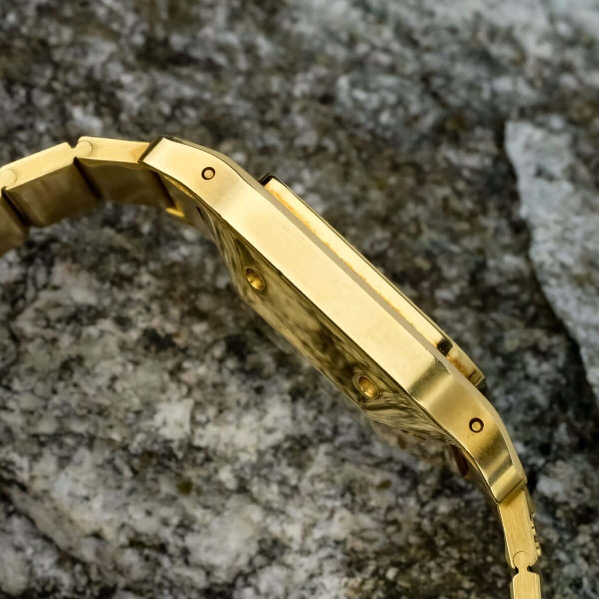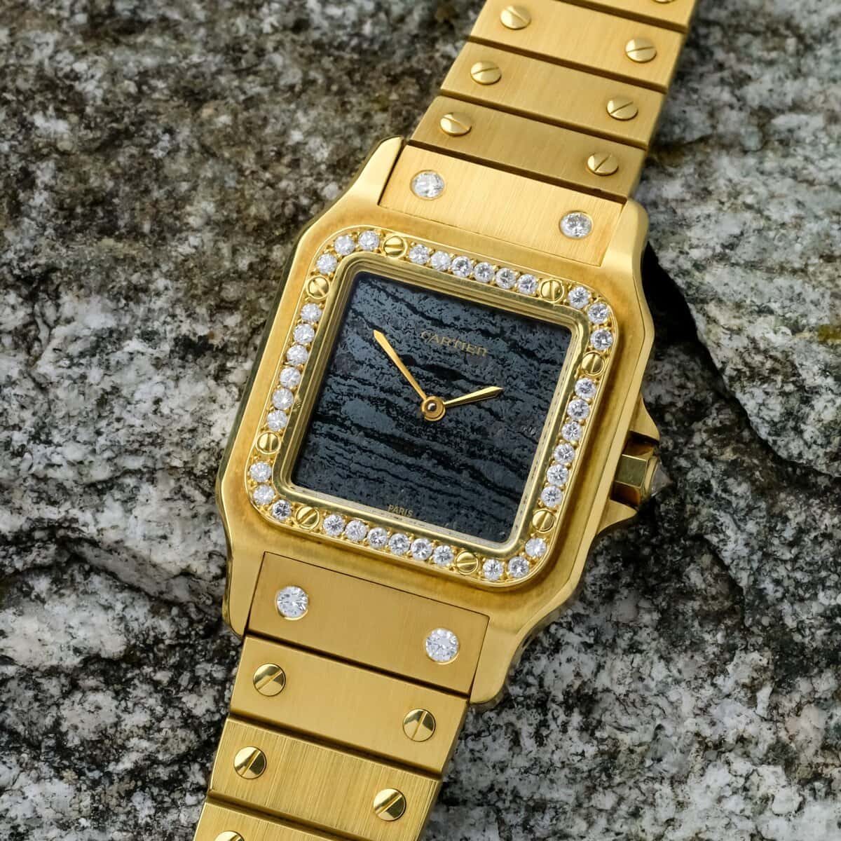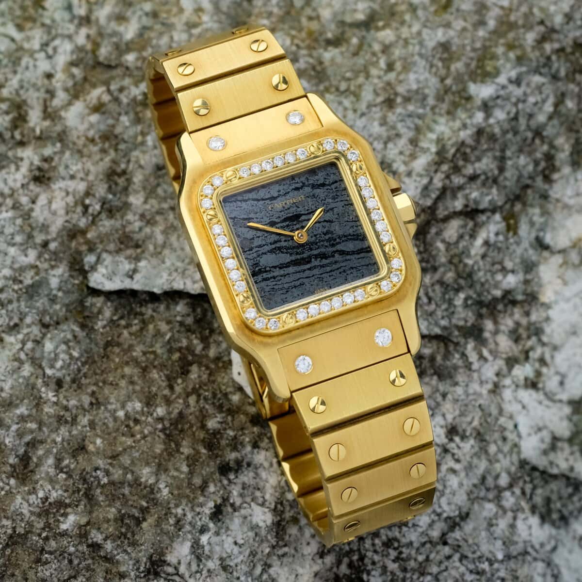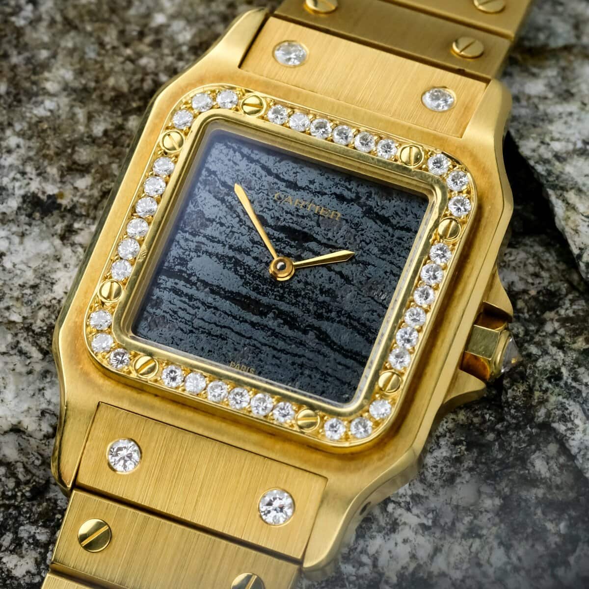 This Cartier Santos Carrée reference 2960 in 18k yellow gold with an exceptionally rare natural stone ferrite dial is truly an unusual find. The dial is in perfect condition with no cracks, maintaining its original deep texture and unique metallic sheen. Ferrite dials are among the rarest configurations for the Carrée line and are highly sought after by collectors.