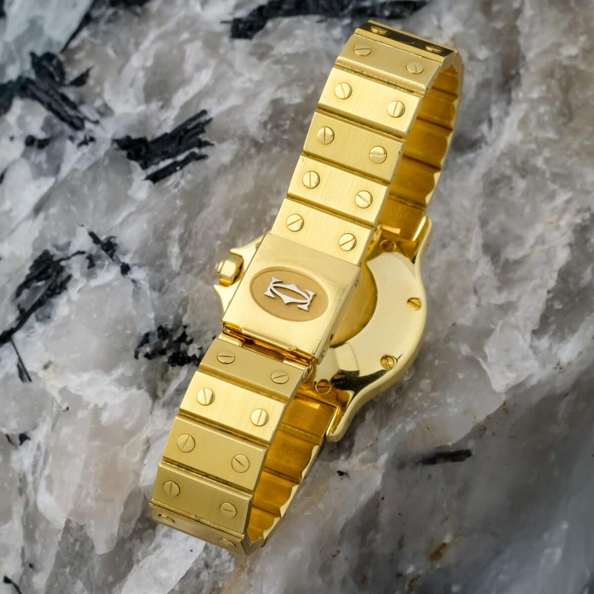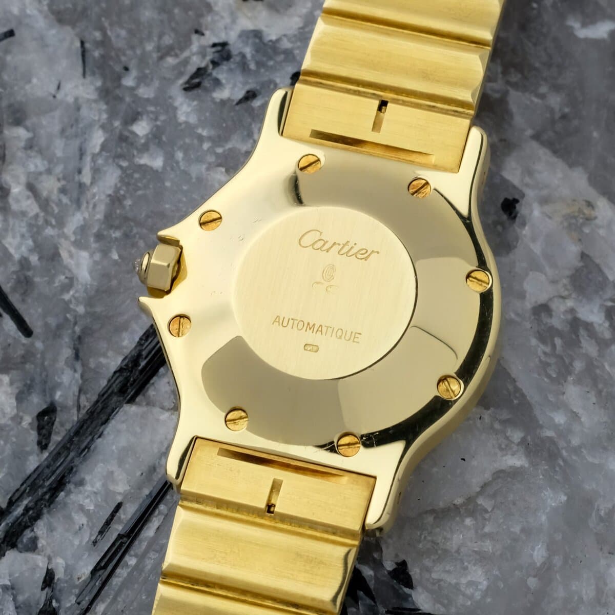 Cartier Santos Octagon GM reference 2965 in full 18k yellow gold, produced around 1980, measuring 30 millimeters and powered by an automatic movement. This example features a Ferrite stone dial, an exceptionally rare configuration within the Santos Octagon line.