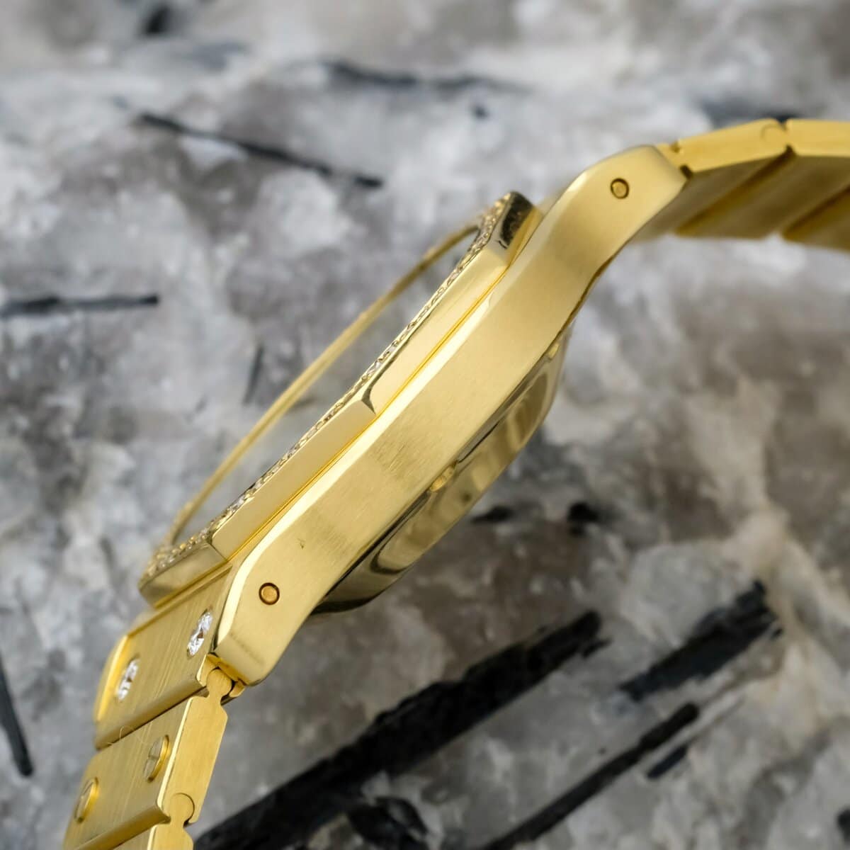 The watch is further distinguished by factory diamond setting on the bezel as well as diamond set first screws on the bracelet, adding a refined jewelry element while maintaining the strong architectural character of the Santos design. The case and bracelet are extremely sharp with crisp edges and excellent definition, indicating minimal wear and careful preservation.