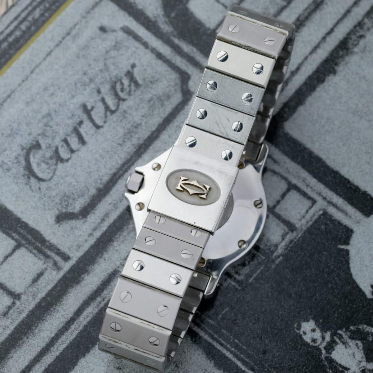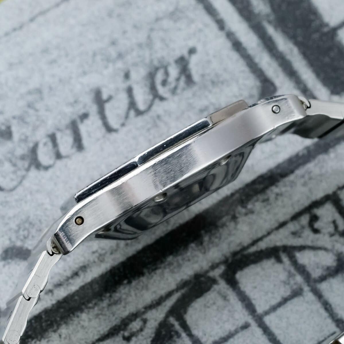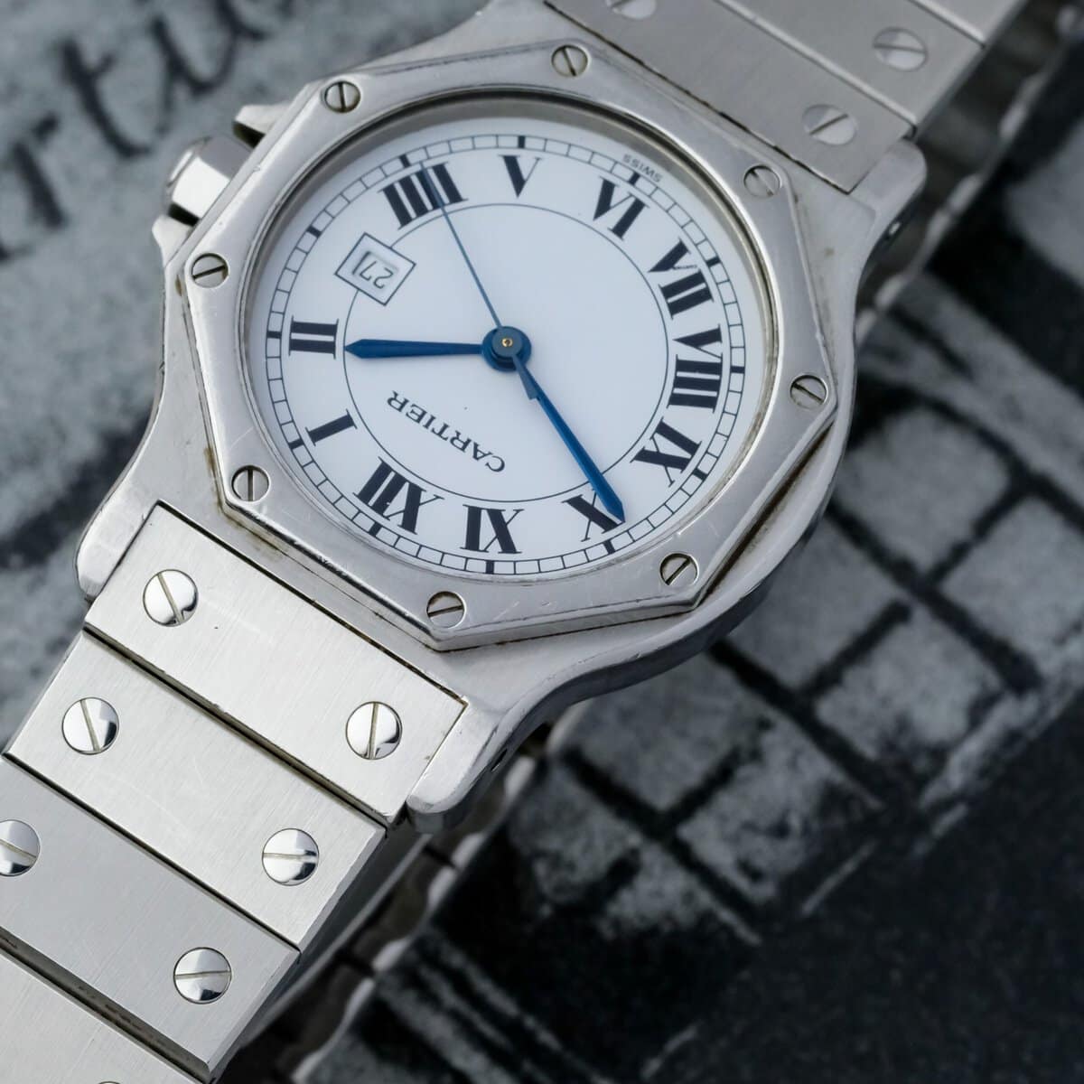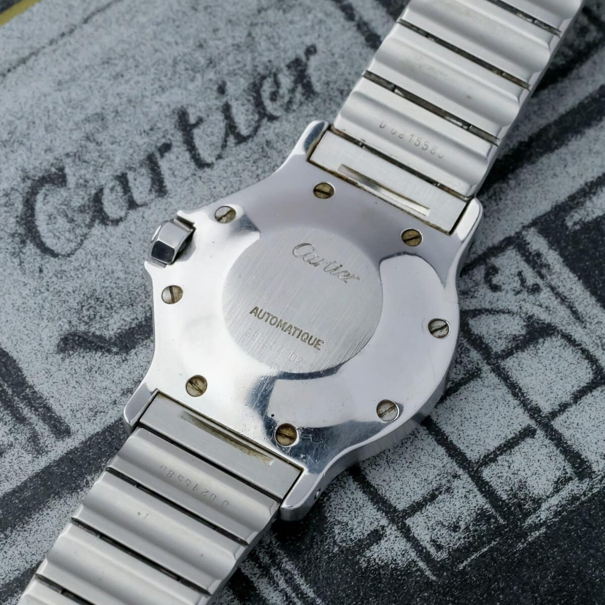 The white Swiss signed dial is perfectly preserved, displaying Cartier’s Roman numerals and blued steel hands with striking clarity. Powered by an automatic movement, it offers both reliability and everyday sophistication.