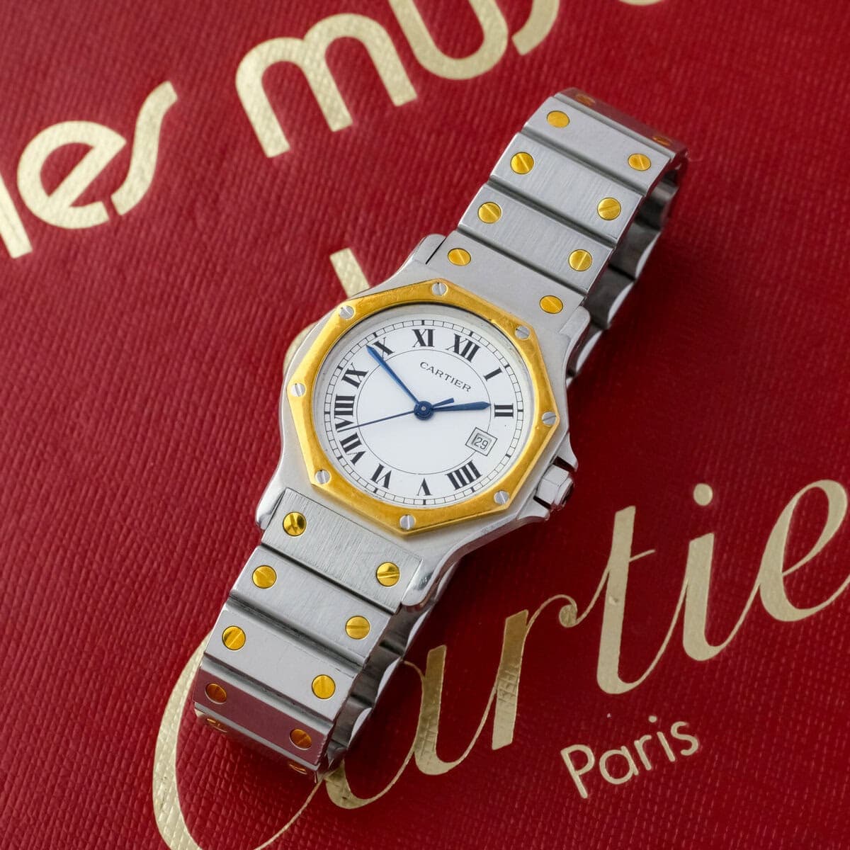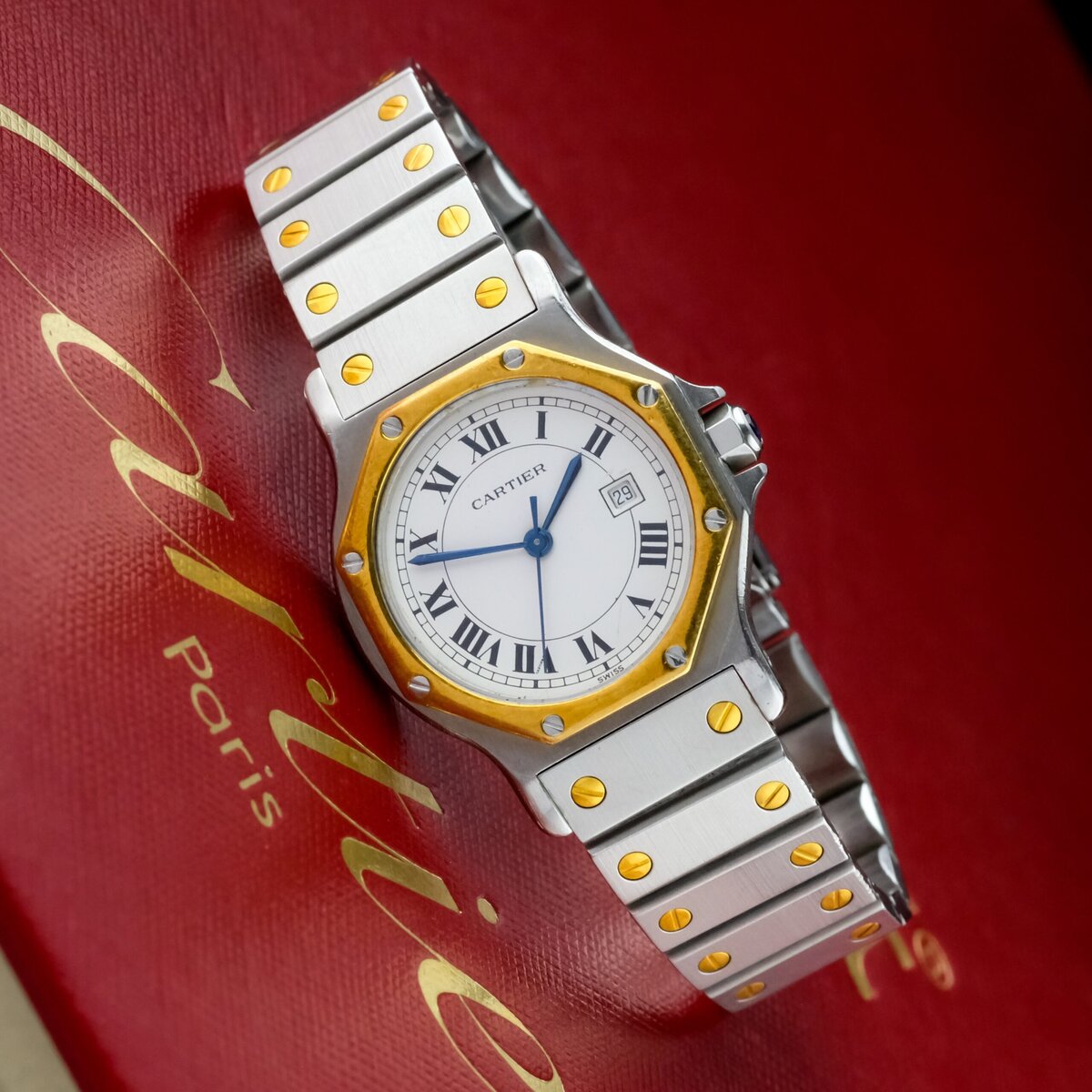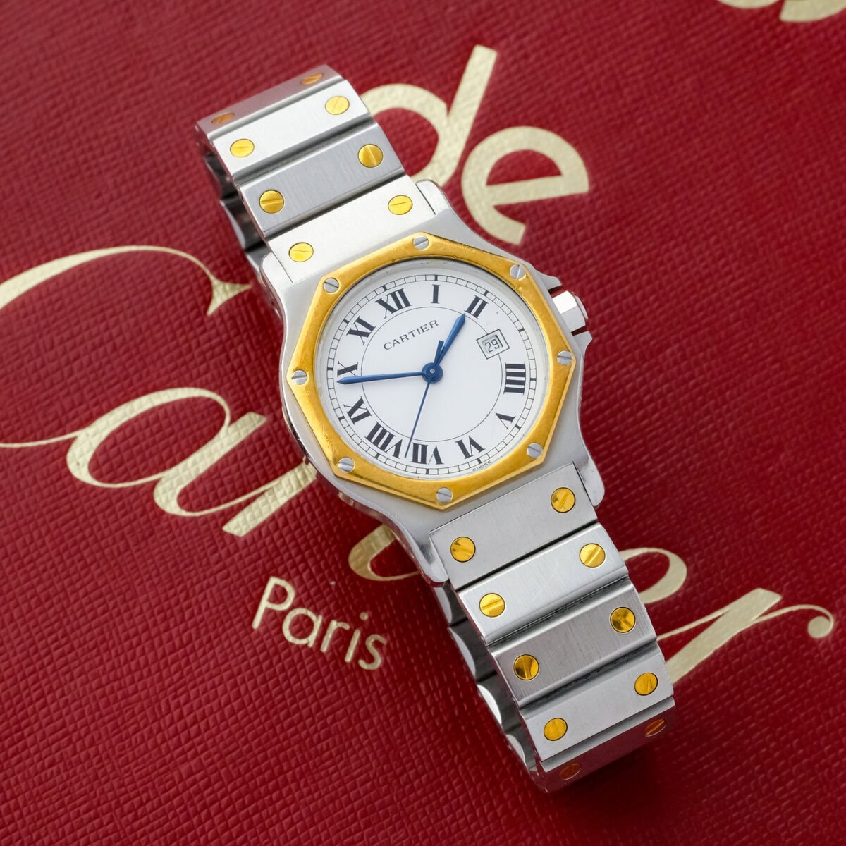 This Cartier Santos Octagon GM reference 2966 is a rare and characterful version of the iconic Santos design. The stainless steel case measures 30 millimeters and is paired with an eighteen karat yellow gold bezel and matching gold screws and crown.