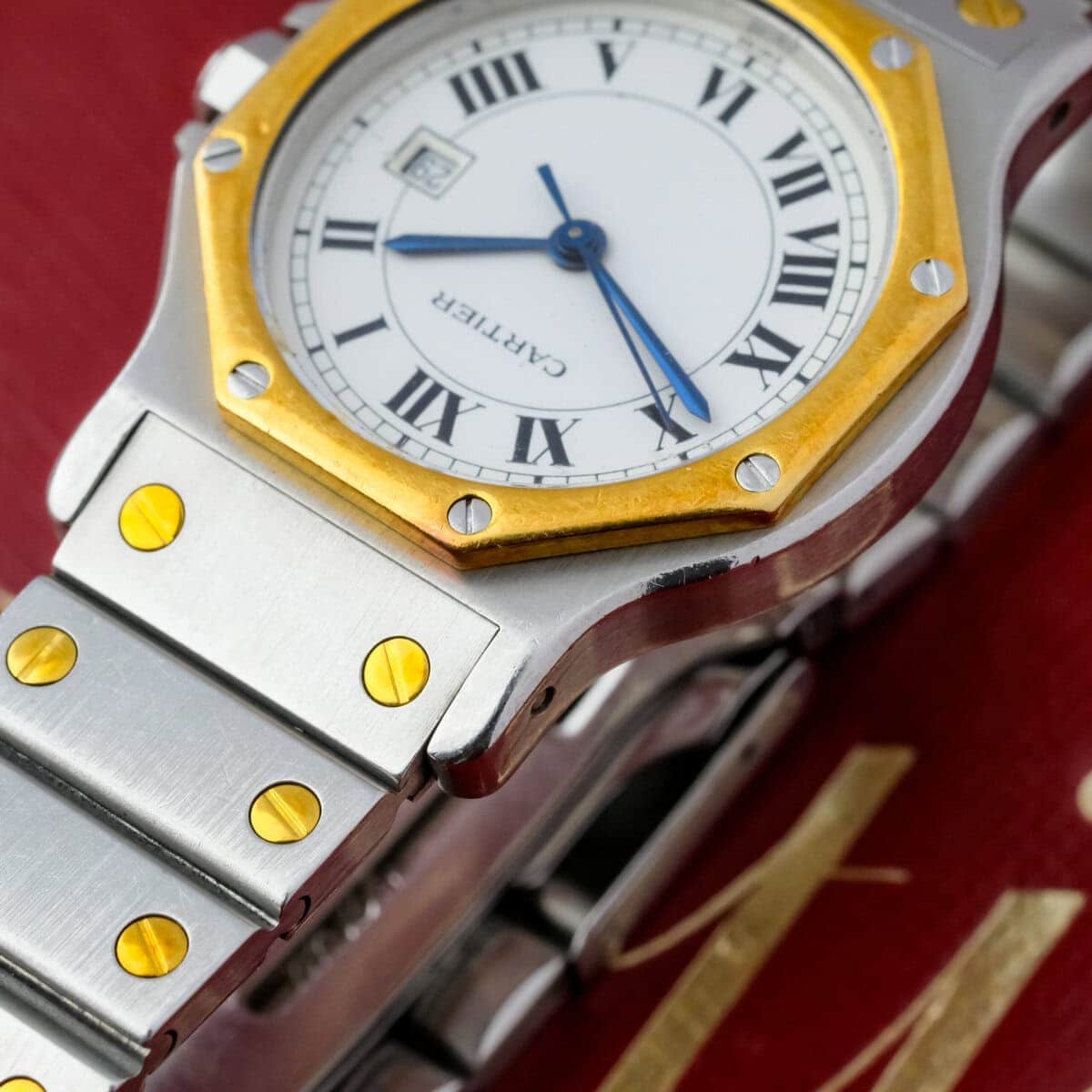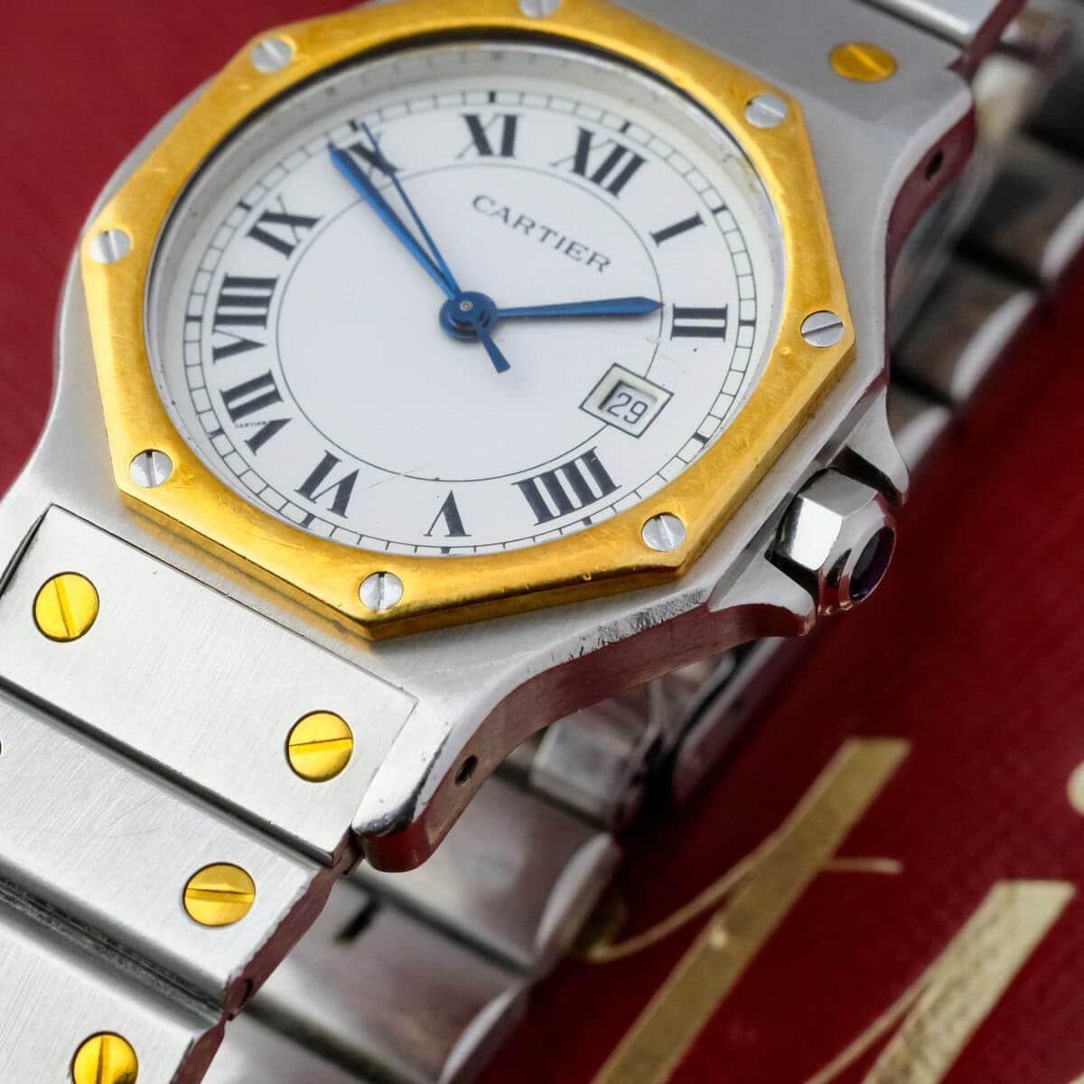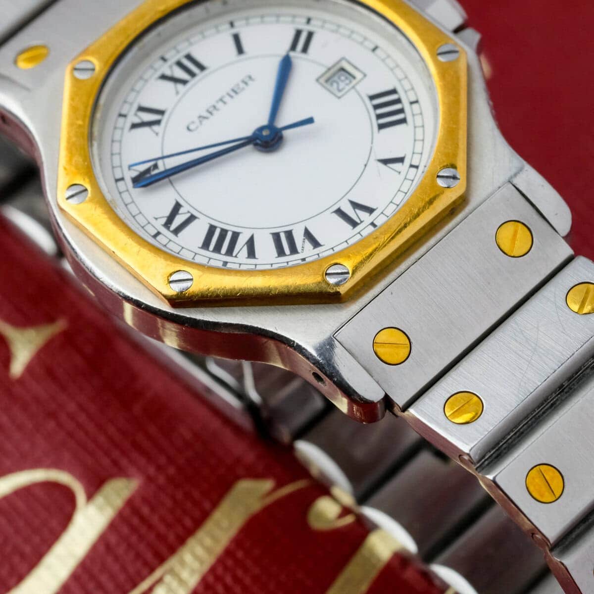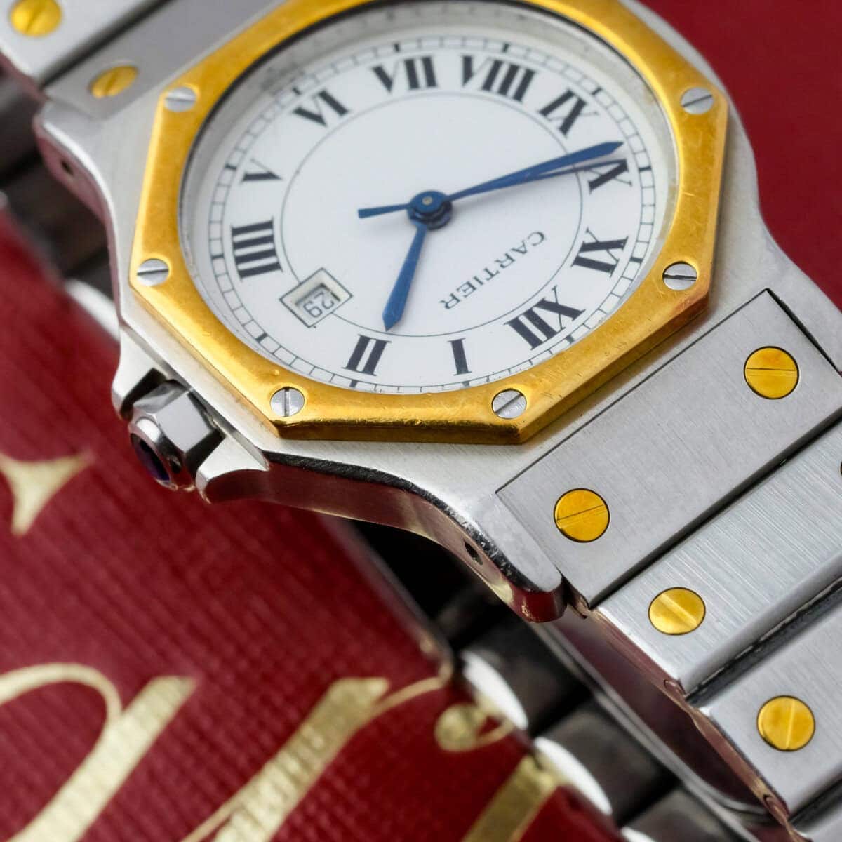 This Cartier Santos Octagon GM reference 2966 is a rare and characterful version of the iconic Santos design. The stainless steel case measures 30 millimeters and is paired with an eighteen karat yellow gold bezel and matching gold screws and crown.
