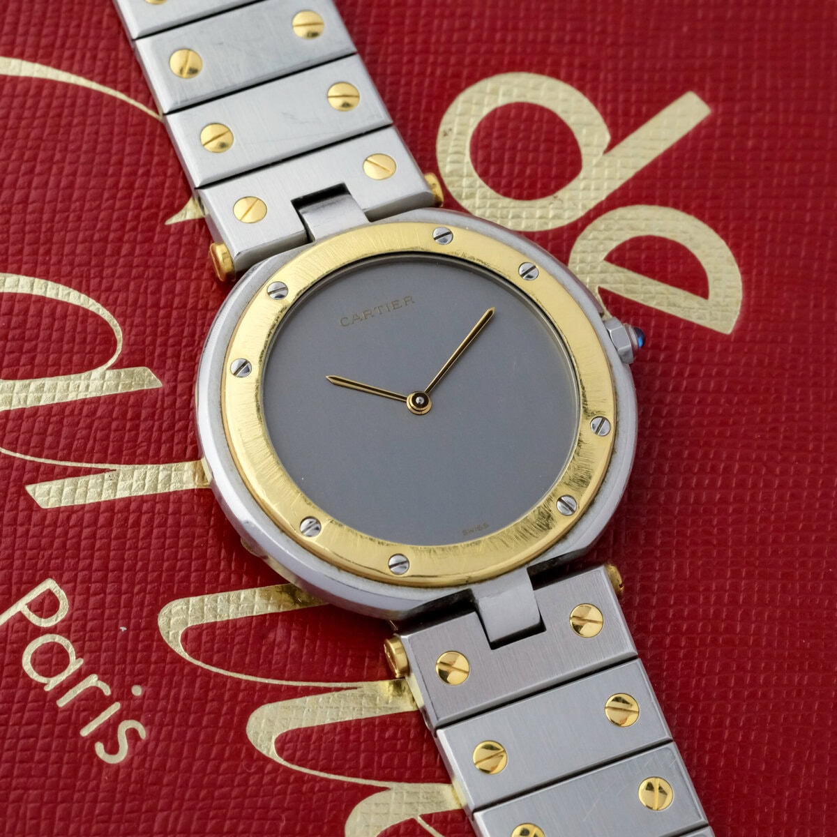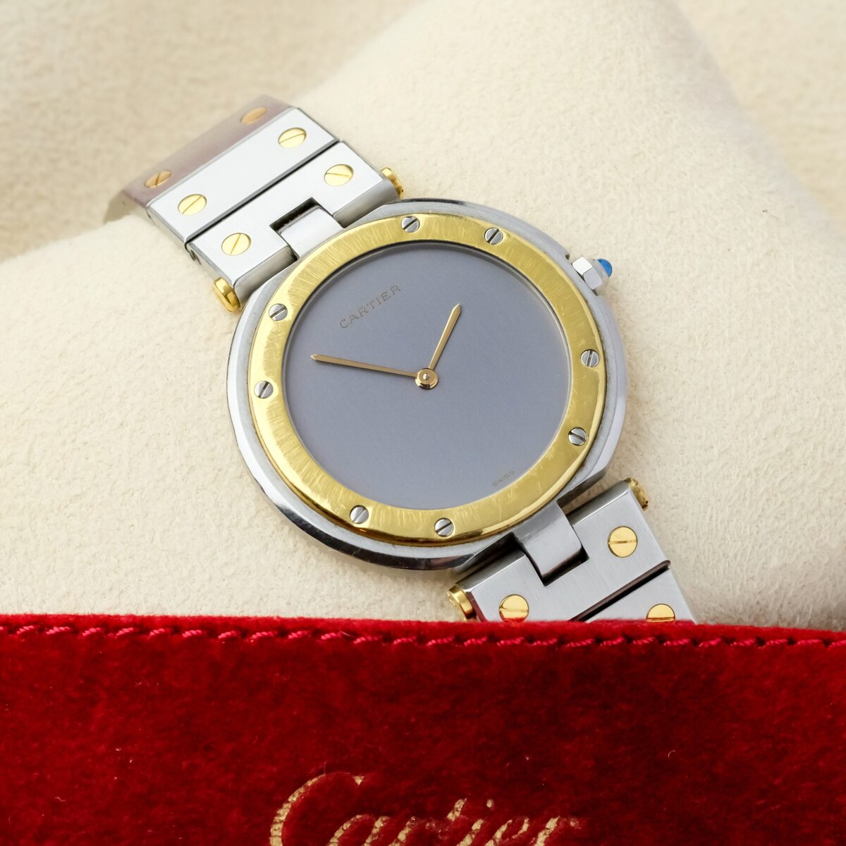 This Cartier Santos Vendôme Ref. 8191 offers a unique and minimalist take on Cartier’s elegant two-tone design. Crafted from stainless steel and 18k yellow gold, the rounded case with signature Vendôme lugs gives the watch a refined, balanced presence on the wrist.